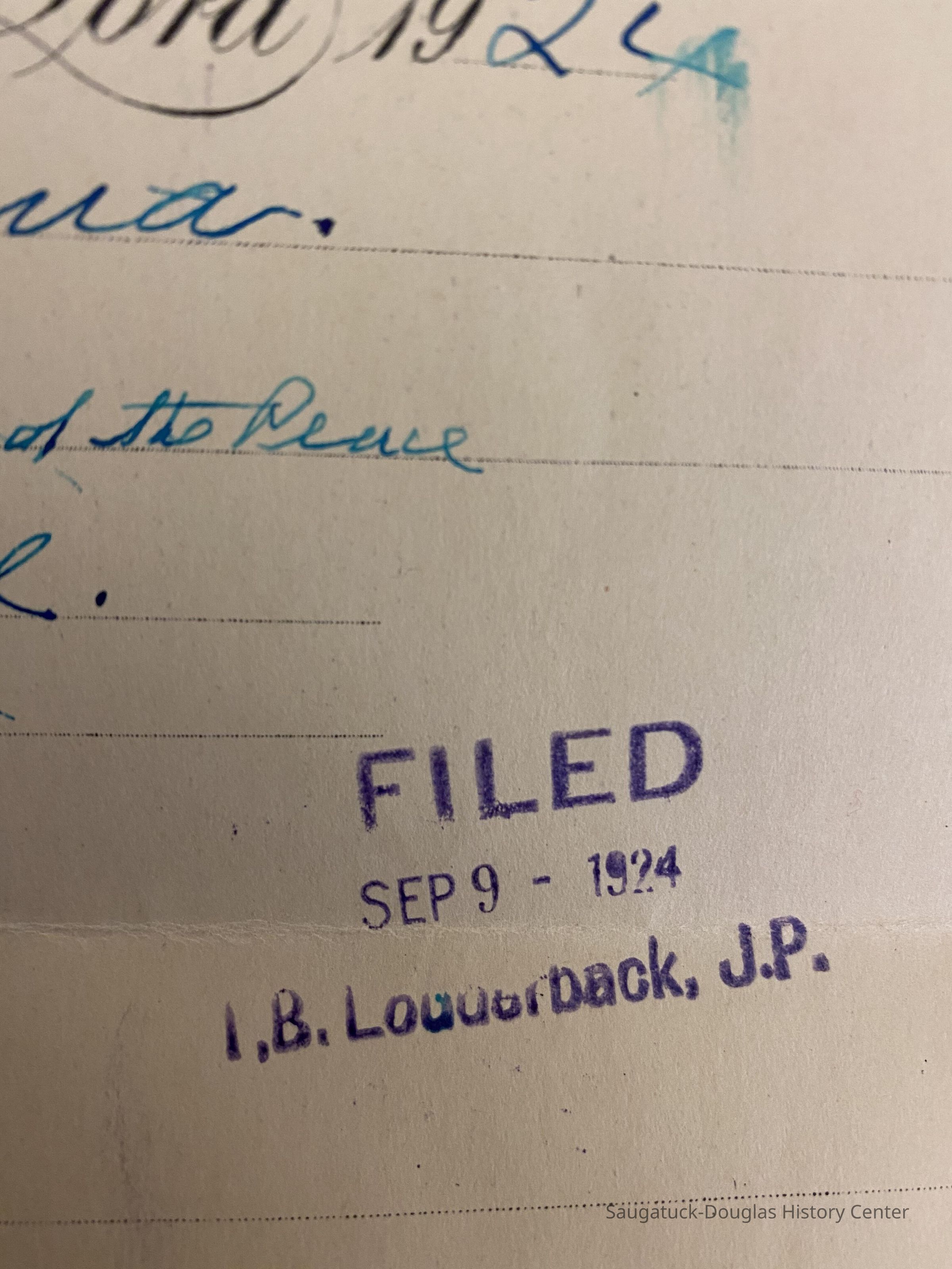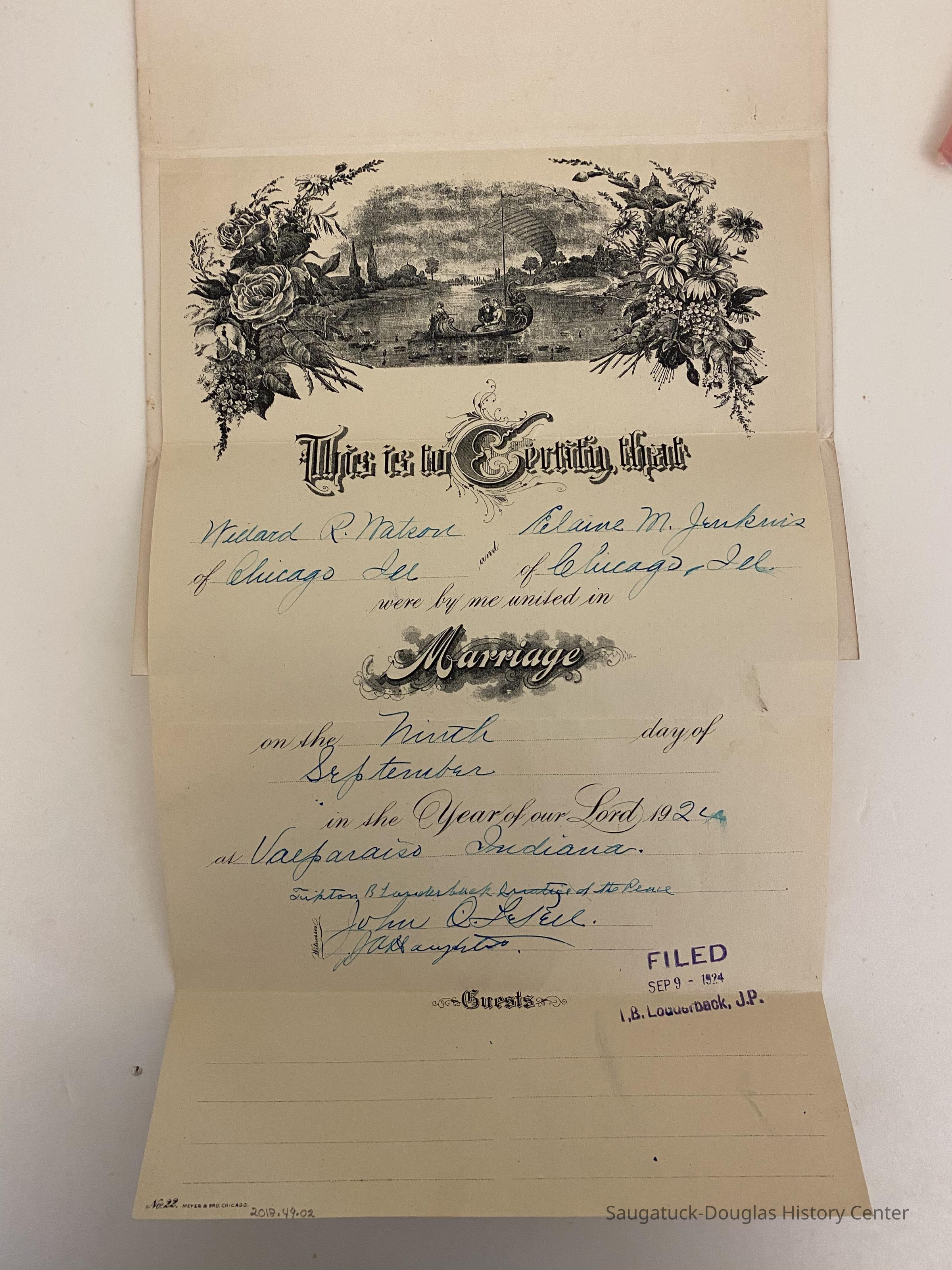 1924 Marriage Certificate of Willard R. Watson and Elaine M. Jenkins ( Of Chicago, IL) parents of Betty Mulder from Saugatuck.