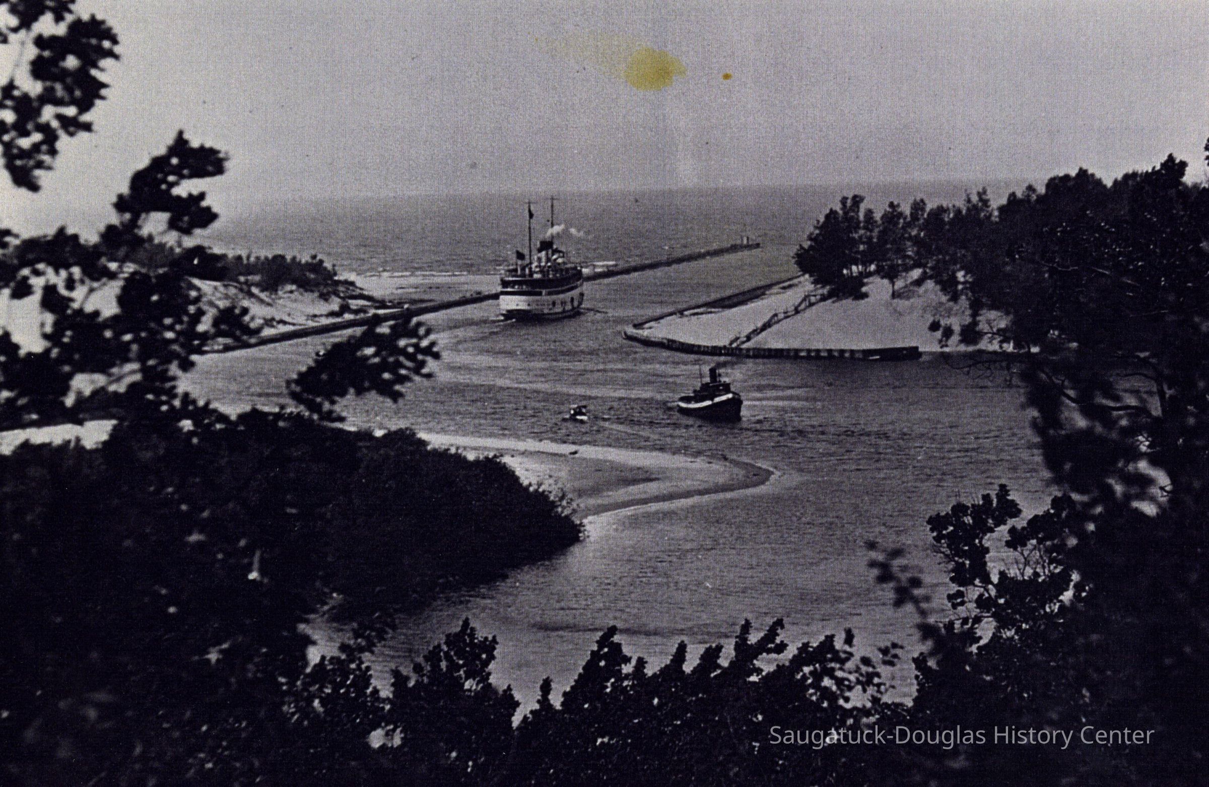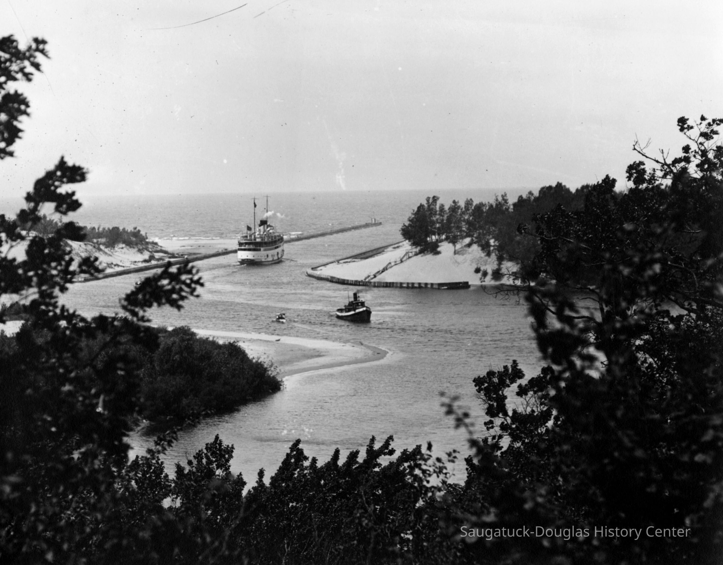A passenger steamship is making the final turn in the Kalamazoo River before it passes between the channel walls and out on to Lake Michigan, circa 1908.