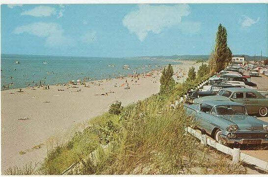 A photo postcard of Oval Beach showing a portion of the Oval Beach Parking lot and the large sandy beach with bathers on the beach and in the water.Subject Person/Organization