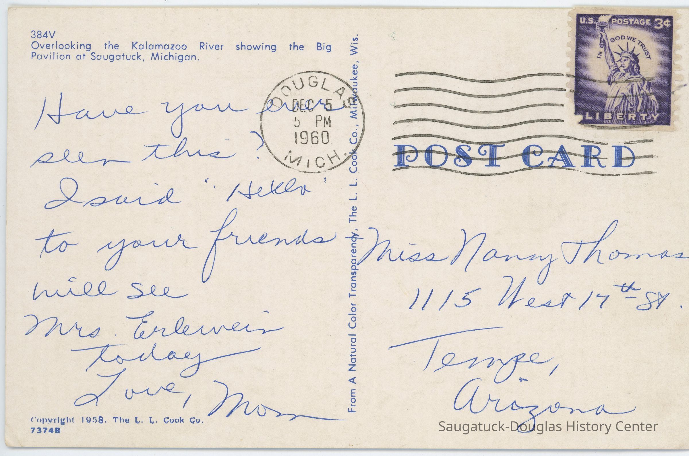 A postcard sent in December of 1960 after the Big Pavilion burned that MayCollection