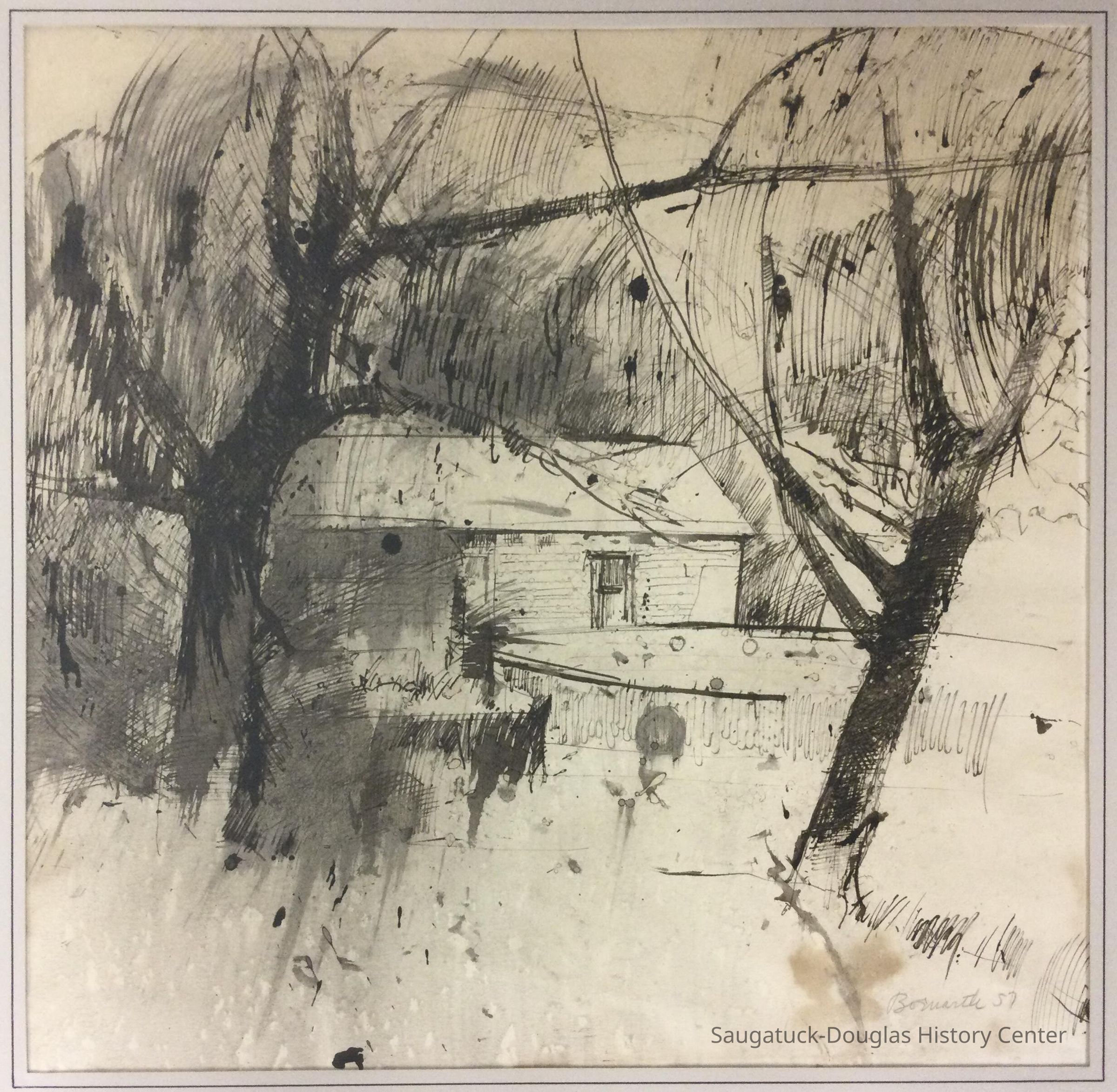 Rare ink drawing of a building amidst trees at OxBow, by Philip Bornarth. Framed in a 3"double wood frame painted with a white distressed wood finish. It also has a 2" white mat with black line.Collection