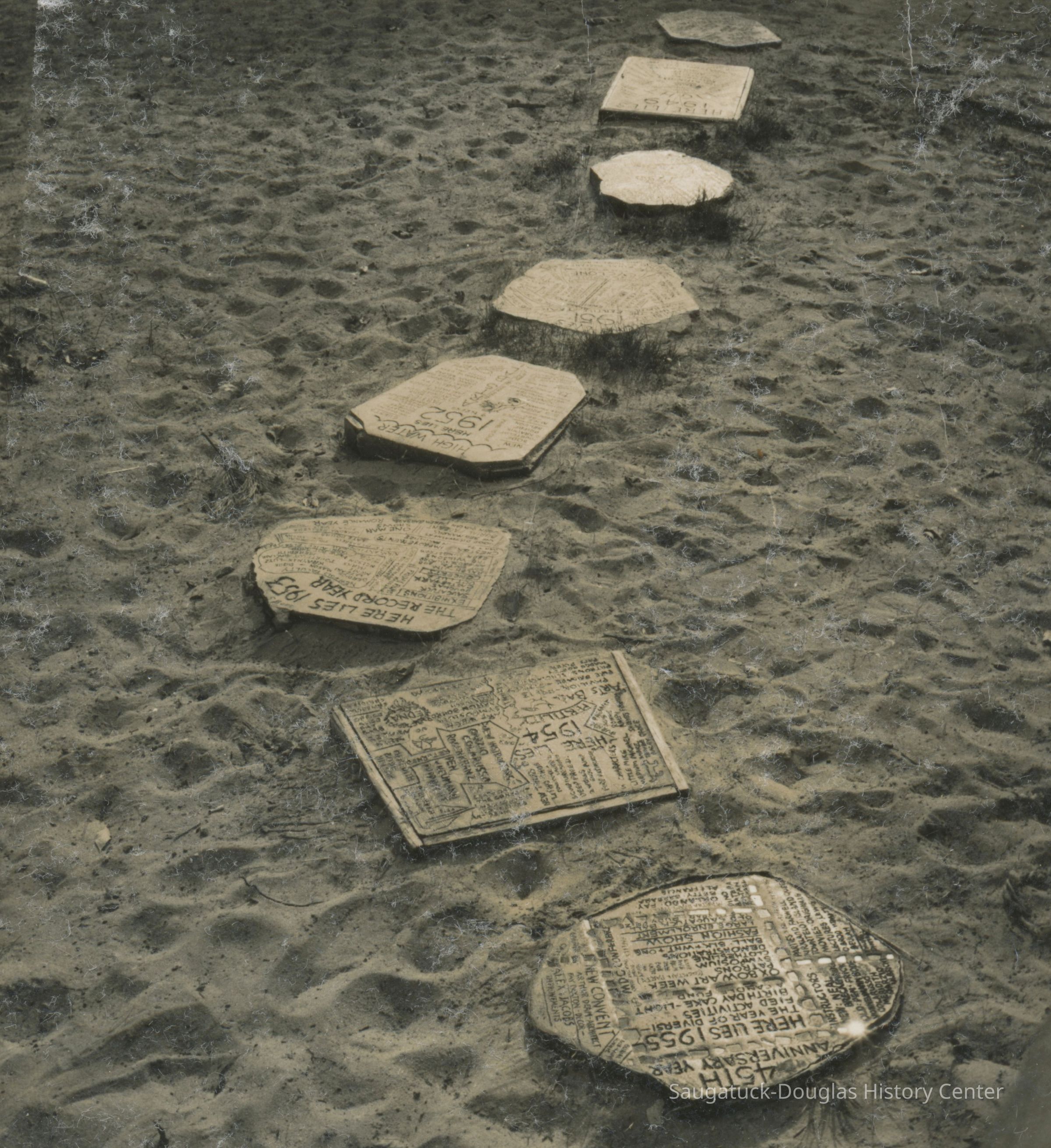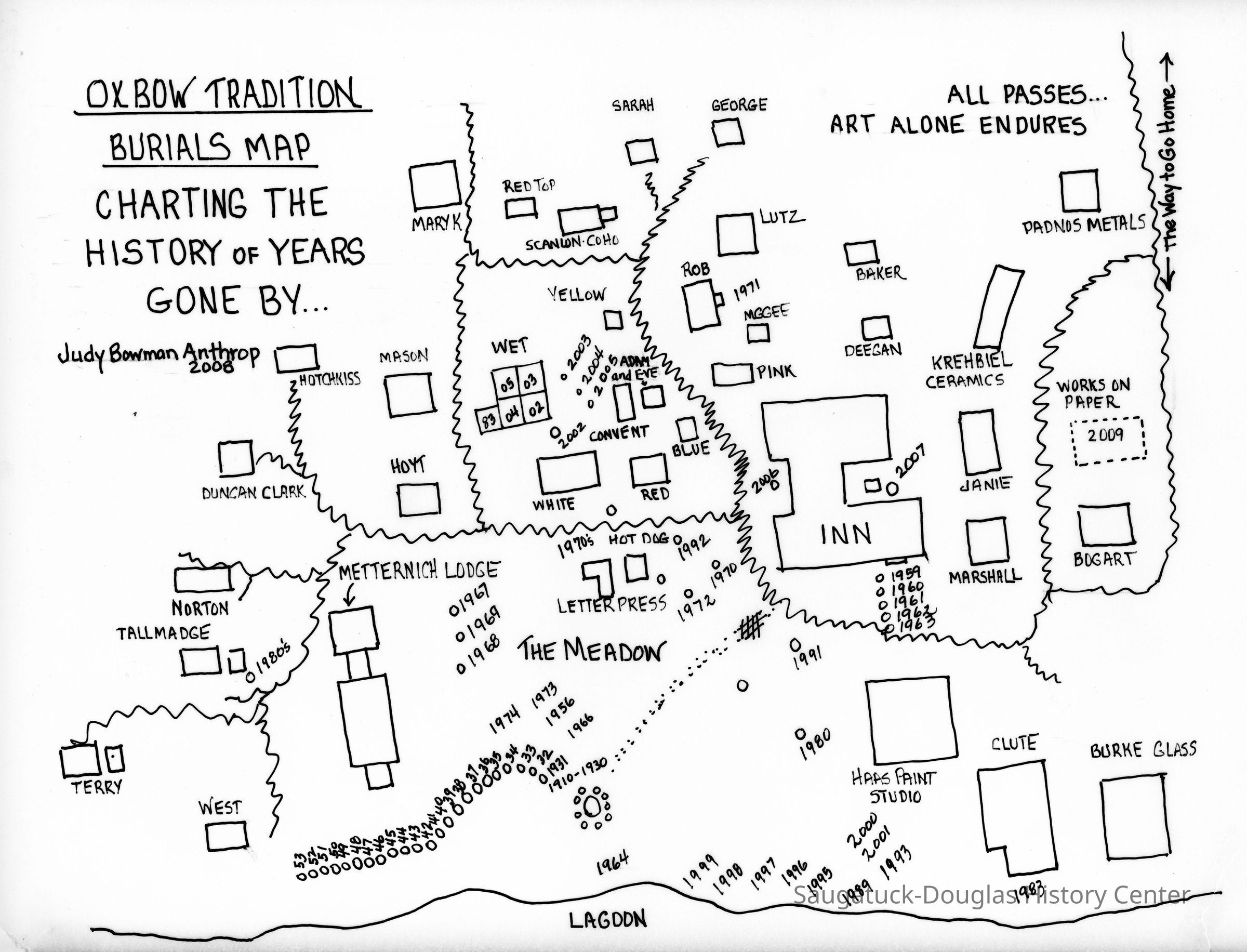 Digital images of the annual, end-of-the-summer burial of the year party, photos of burial capstones and a map of burial locations drawn by Judy Anthrop.