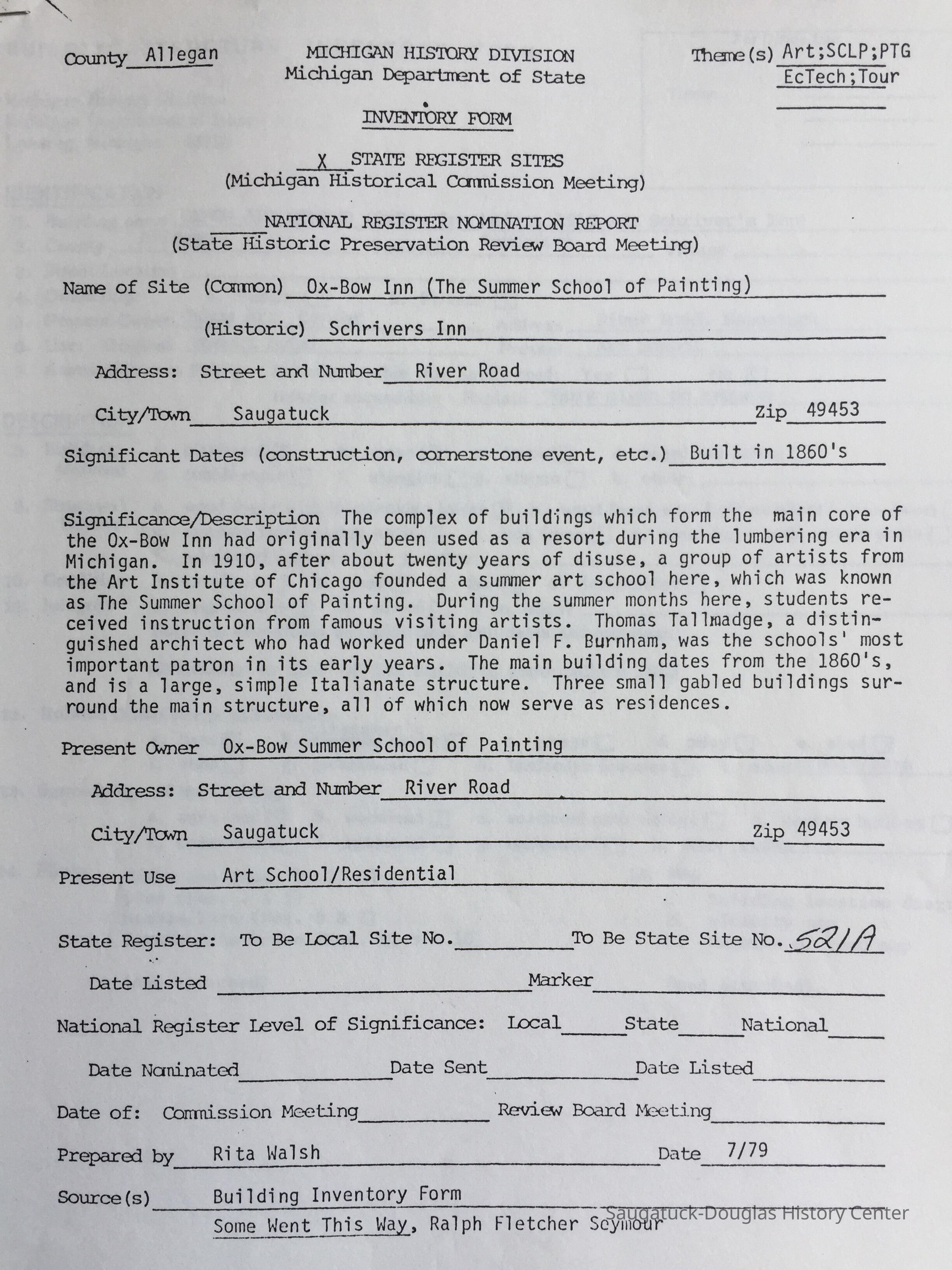 Photocopy of a 12-page inventory form for the 1869s Ox-Bow Inn (aka Shrivers Inn or Riverside Hotel) for the Michigan History Division of the Michigan Department of State prepared by Rita Walsh in July 1979.