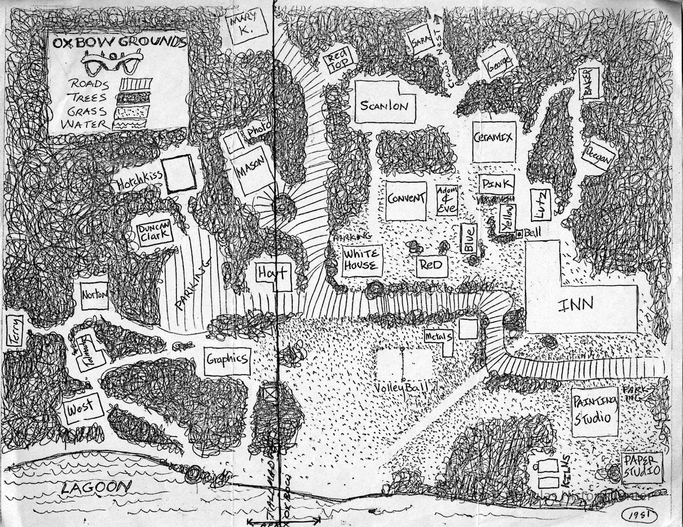 Digital images of the photocopied maps given to visitors and students to help them navigate the Ox-bow campus. One map drawn by Judy Anthrop includes mini-drawings of the buildings.
