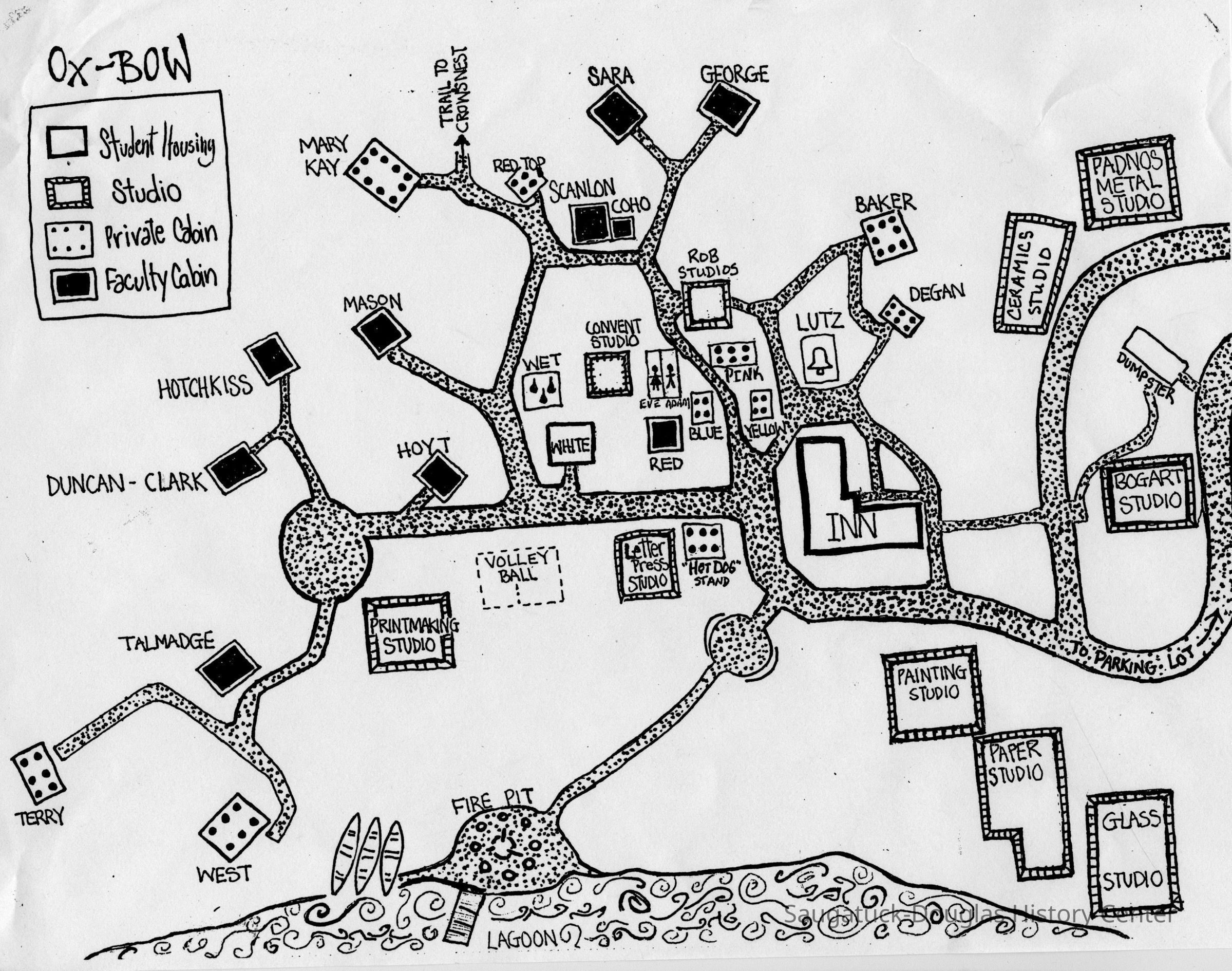 Identifies locations in three different eras of the West, Terry, Talmadge/Tallmadge, Duncan-Clark, Hotchkiss, Mason, Hoyt, Mary Kay, Red Top, Scanlon, Coho, Sara, George, Red, Blue, Pink, Yellow, McGee, Baker, Marshall, Hot Dog Stand and Degan cabins; the Printmaking, Letterpress, Convent, Rob, Lutz, Haas Painting, Clute Papermaking, Burke Glass, Bogart, Krehbiel Ceramics, Print, Graphics and Padnos Metal studios; the Janie and the Old Inn student housing; the lagoon, dock, pergola, meadow, kilns, bell, fire pit, volleyball court, Adan and Eve restrooms, Wet shower house, the Chef dumpster, parking lot, trails and roads.Collection
