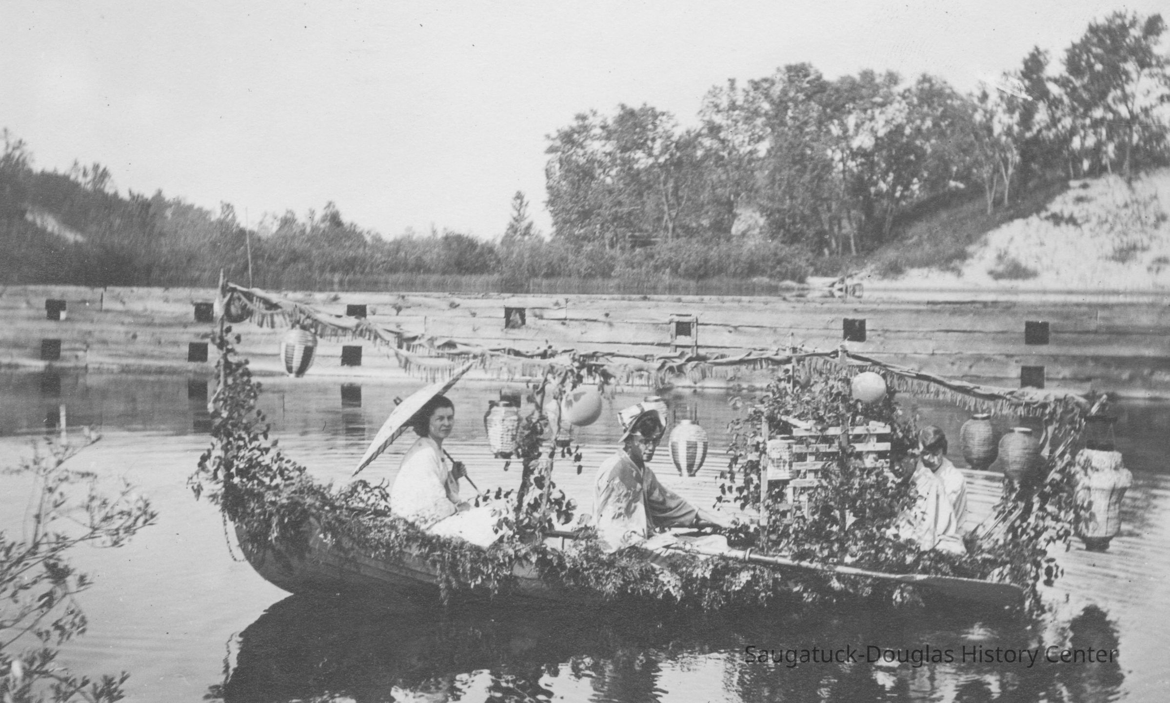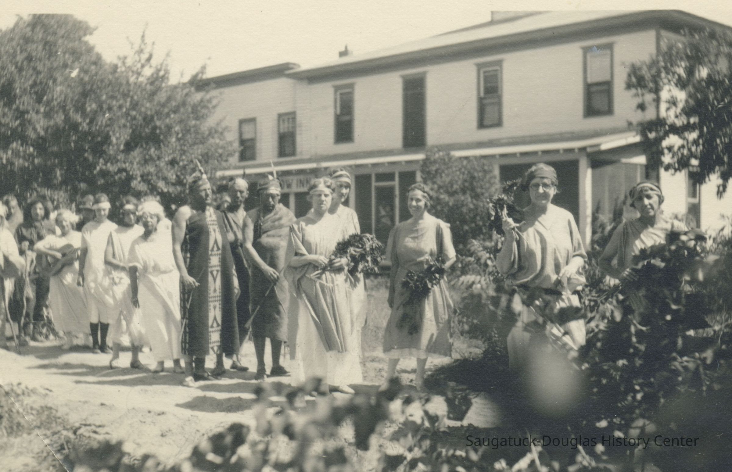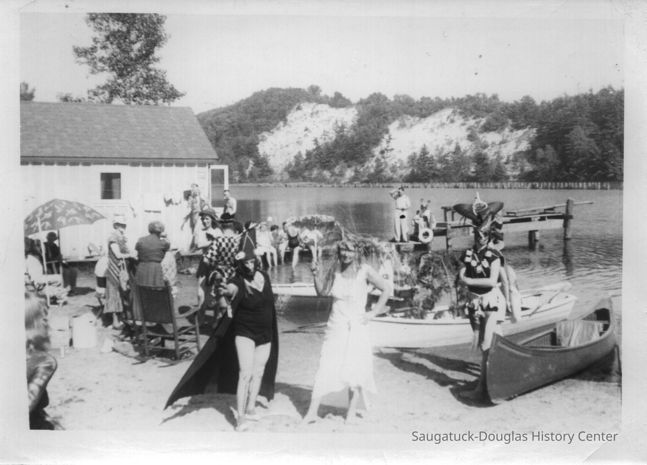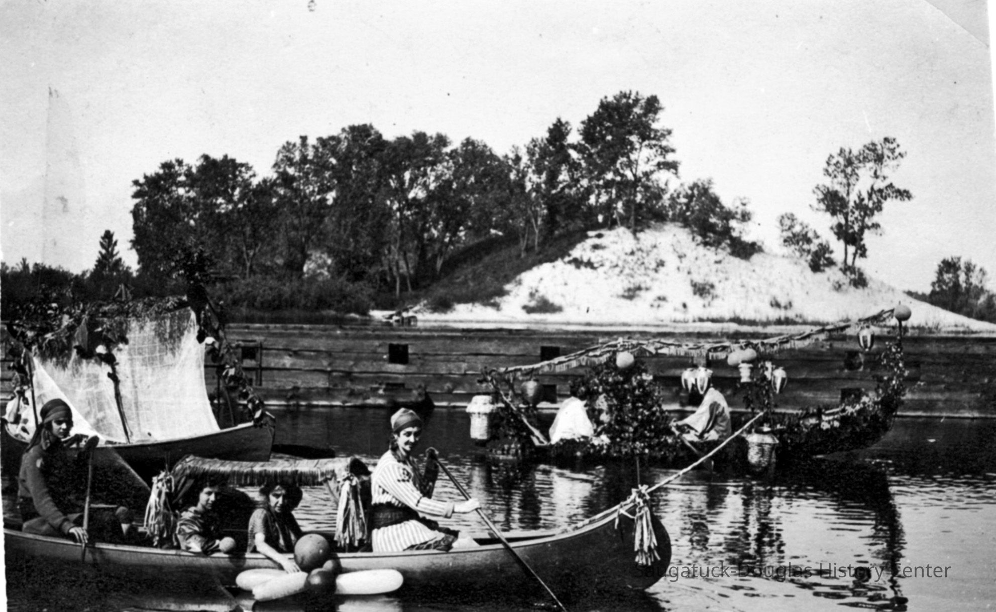 Digital images of pageants, costumed performances and parties at Ox-Bow including Venetian lighted boat parades, Hiawatha pageant, and raising a faux totem pole.