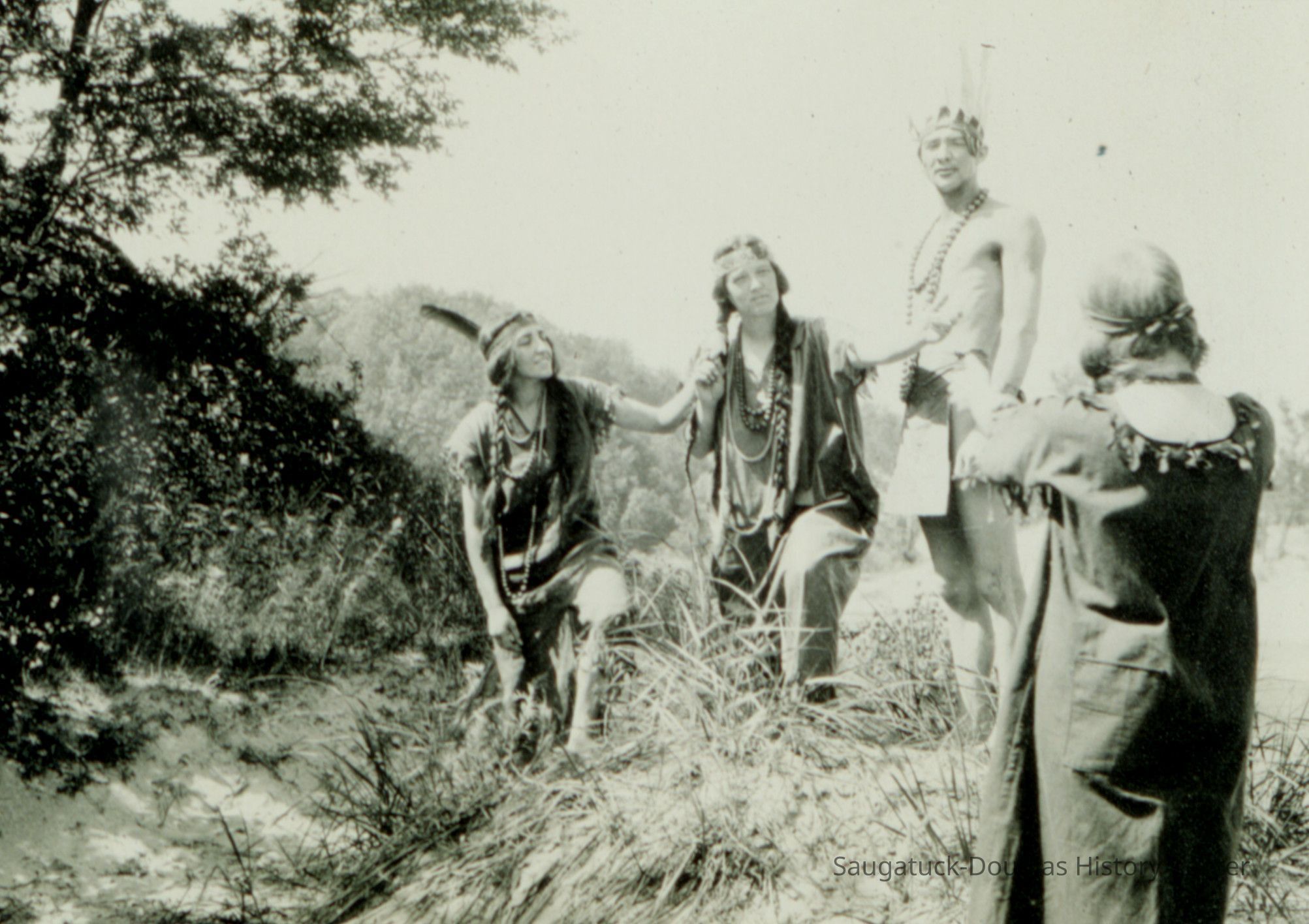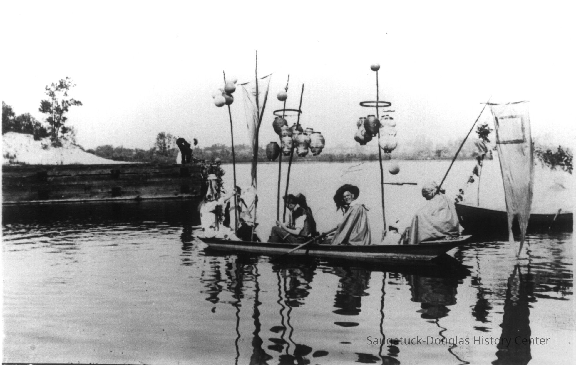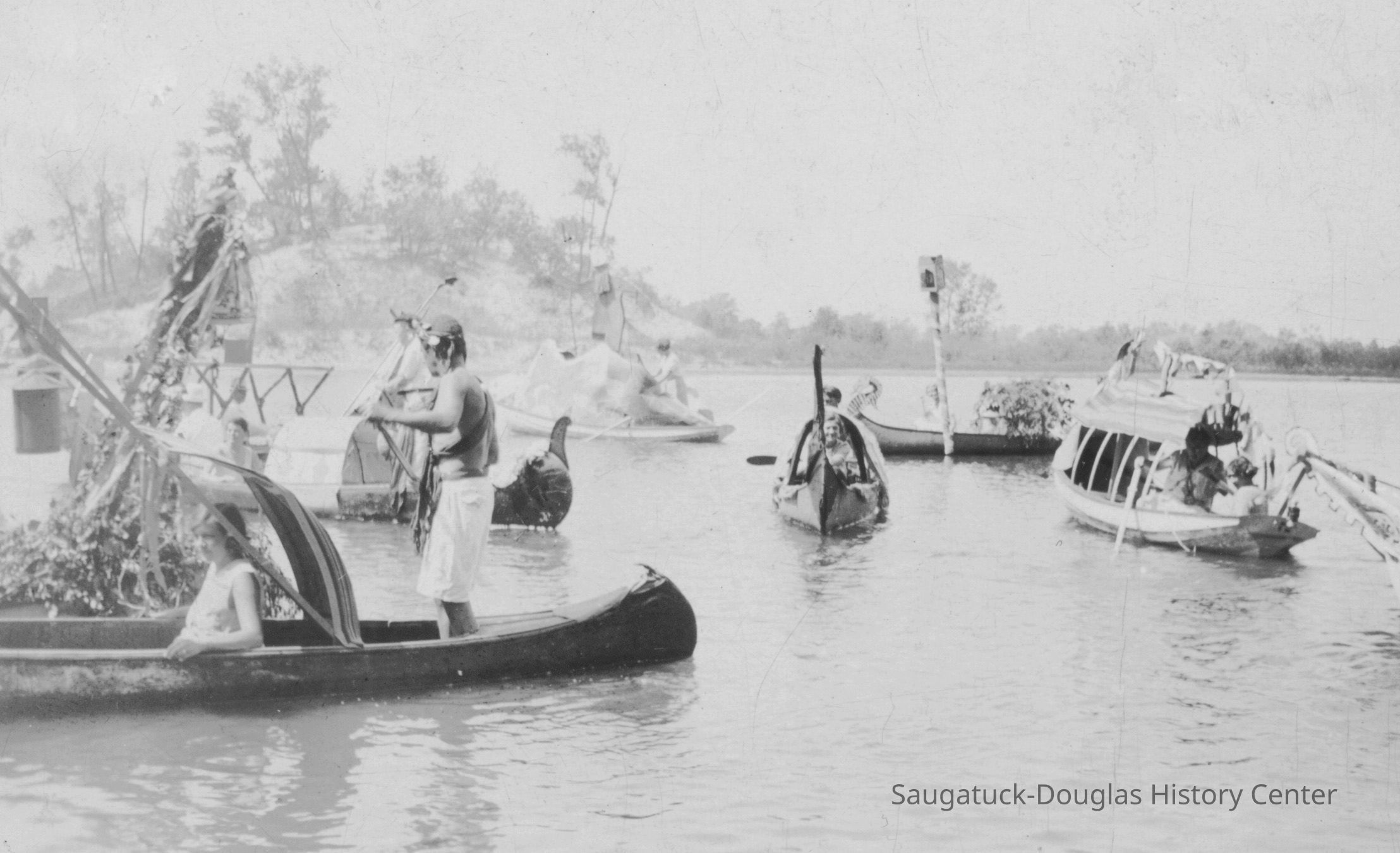 Digital images of pageants, costumed performances and parties at Ox-Bow including Venetian lighted boat parades, Hiawatha pageant, and raising a faux totem pole.