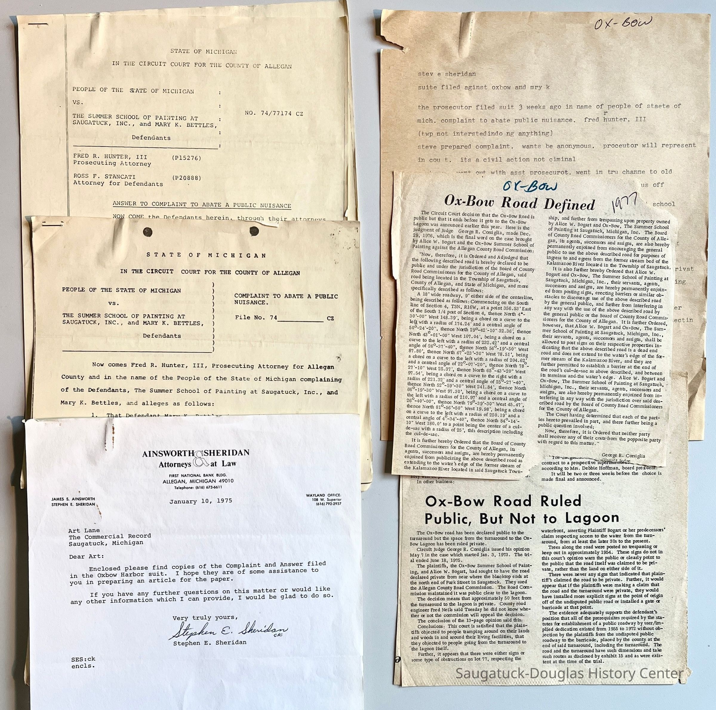 Cover letter from attorney Stephen E. Sheridan and legal documents for case number 74/77174 CZ, People of the State of Michigan vs The Summer School of Painting at Saugatuck, Inc., and Mary K. Bettles., 1975
