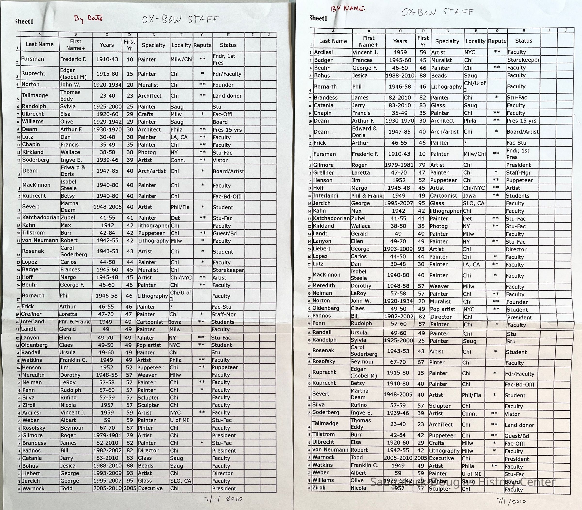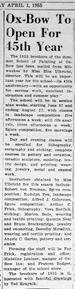 Bohus, Jessica, Bornarth, Phillip, Brandess, James, Catania, Jerry, Chapin, Francis 1899-1965, Deam, Arthur "Art" Francis 1895-1974, Deam, Edward Lee 1928-2019, Fursman, Frederick Frary 1874-1943, Grellner, Loretta 1925 - 2004, Hoff, Margo 1912-2008, Kachadoorian, Zubel, Kirkland, Wallace 1891-1979, Lanyon, Ellen 1926-2013, Liebert, George, Lutz, Dan 1906-1978, Mackinnon, Isobel Steele 1896-1972, Meredith, Dorothy Laverne 1906-1986, Neiman, LeRoy 1921-2012, Randall, Ursula, Bekken, Sylvia Anna Edna (Miller) Randolph 1905-2008, Rupprecht, Elizabeth "Betsy" c1932-2018, Rupprecht, Edgar A. 1889-1954, Severt, Martha (Deam) 1929-2014, Silva, Rufino c1919-1993, Tallmadge, Thomas Eddy 1876-1940, Tillstrom, Burr 1917-1985, Von Neumann, Robert 1888-1976, Williams, Olive E. (Phelps) 1875-1972, Badger, Frances S. 1904-1997, Buehr, George Frederick 1905-1983, Frick, Arthur Charles, Arcilesi, Vincent J. 1932-2022, Interlandi, Phil 1924-2002, Kahn, Max 1902-2005, Norton, John Warner 1876-1934, Oldenburg, Claes Thure 1929-2022, Padnos, Bill, Penn, Rudolph "Rudy" 1918-1990, Rosenak, Carol (Soderberg) 1925-2002, Rosofsky, Seymour 1924 - 1981, Soderberg, Yngve Edward 1896-1972, Ulbricht, Elsa 1885-1980, Warnock, Todd, Watkins, Franklin C. 1894-1972, Weber, Albert Jacob 1919-, Ziroli, Nicola 1908-1970