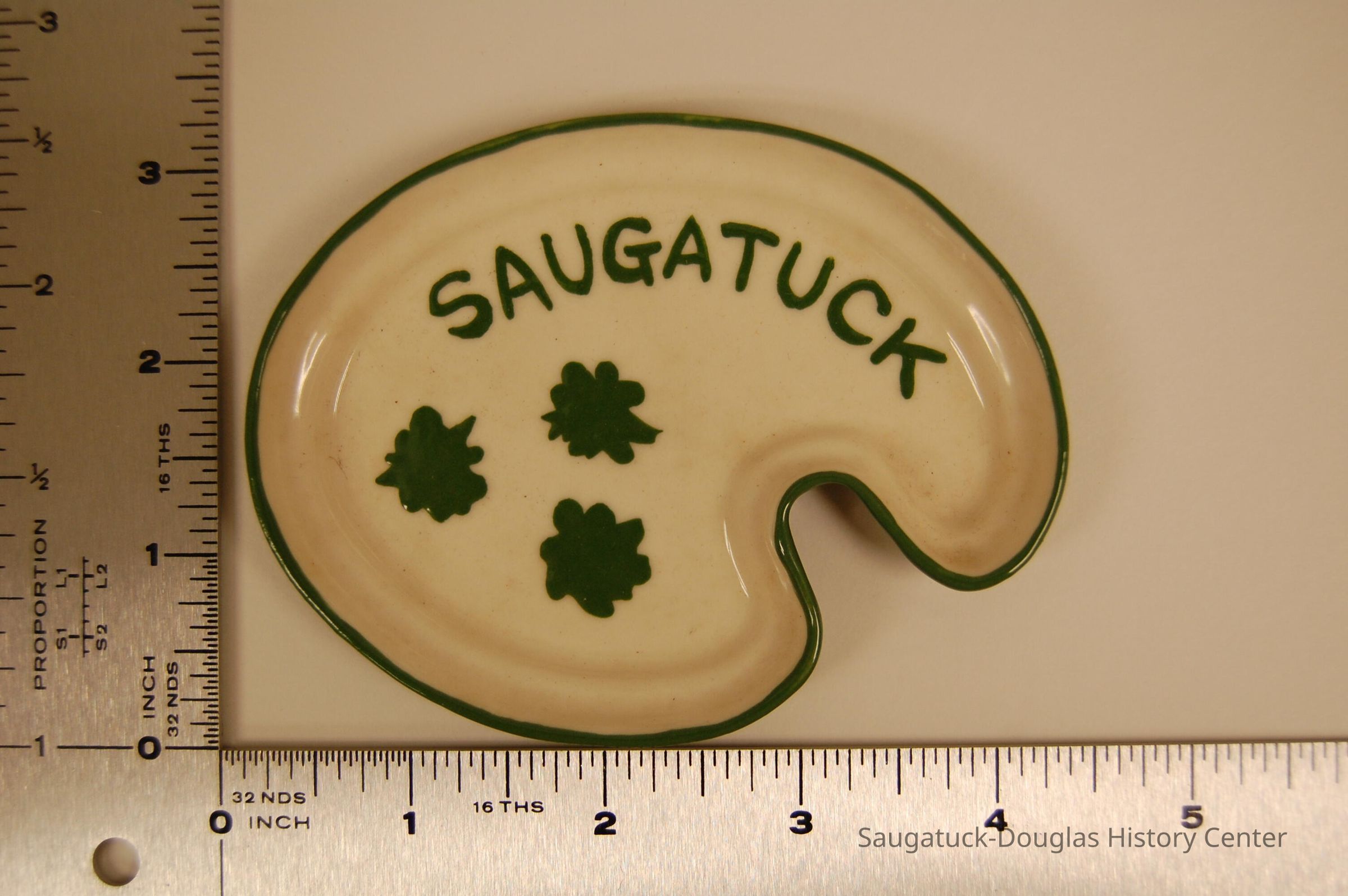 Small painted plate. Three green flowers or leafs are painted on, with "Saugatuck" also painted on. The rim of the plate is painted green as well.Collection