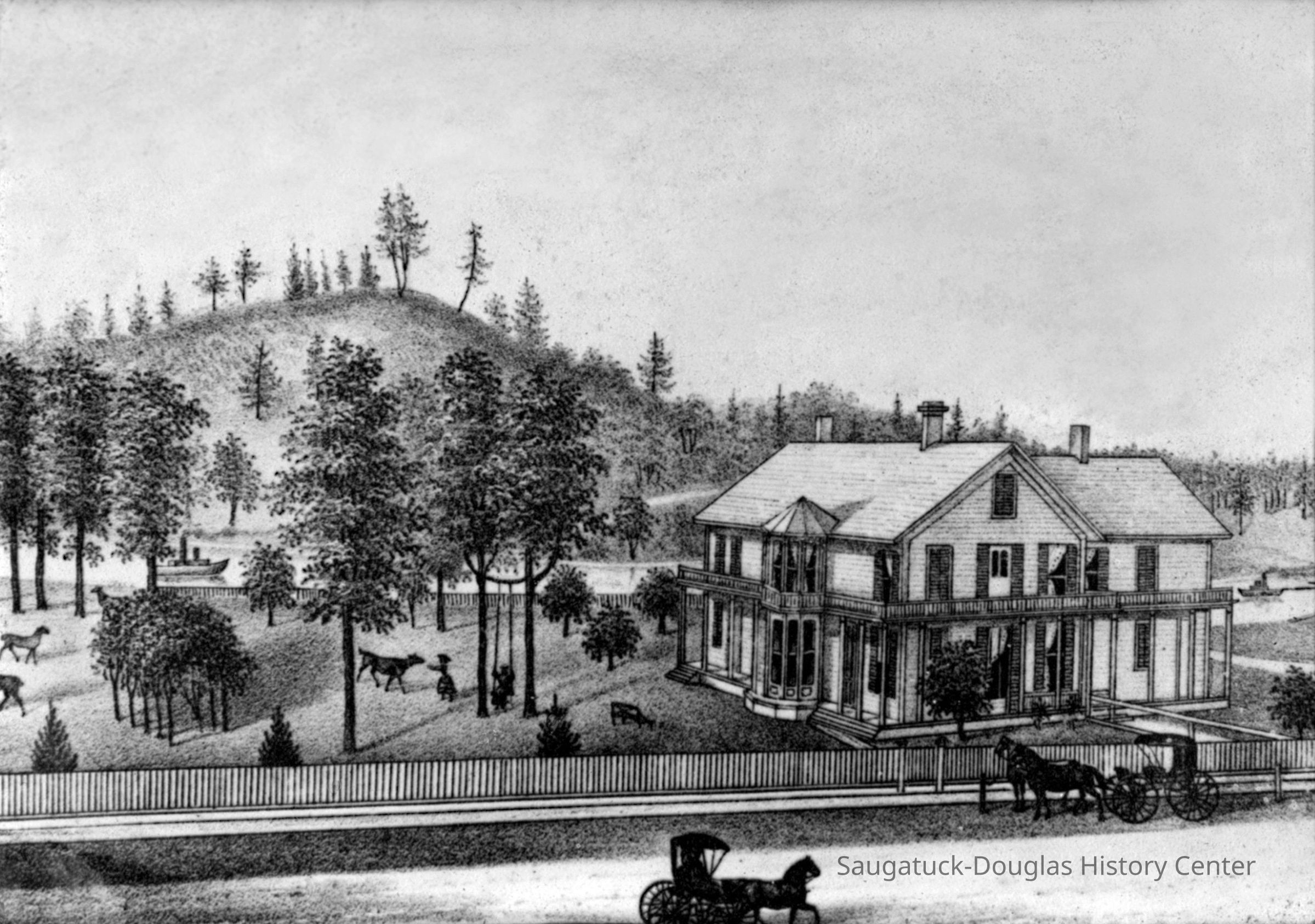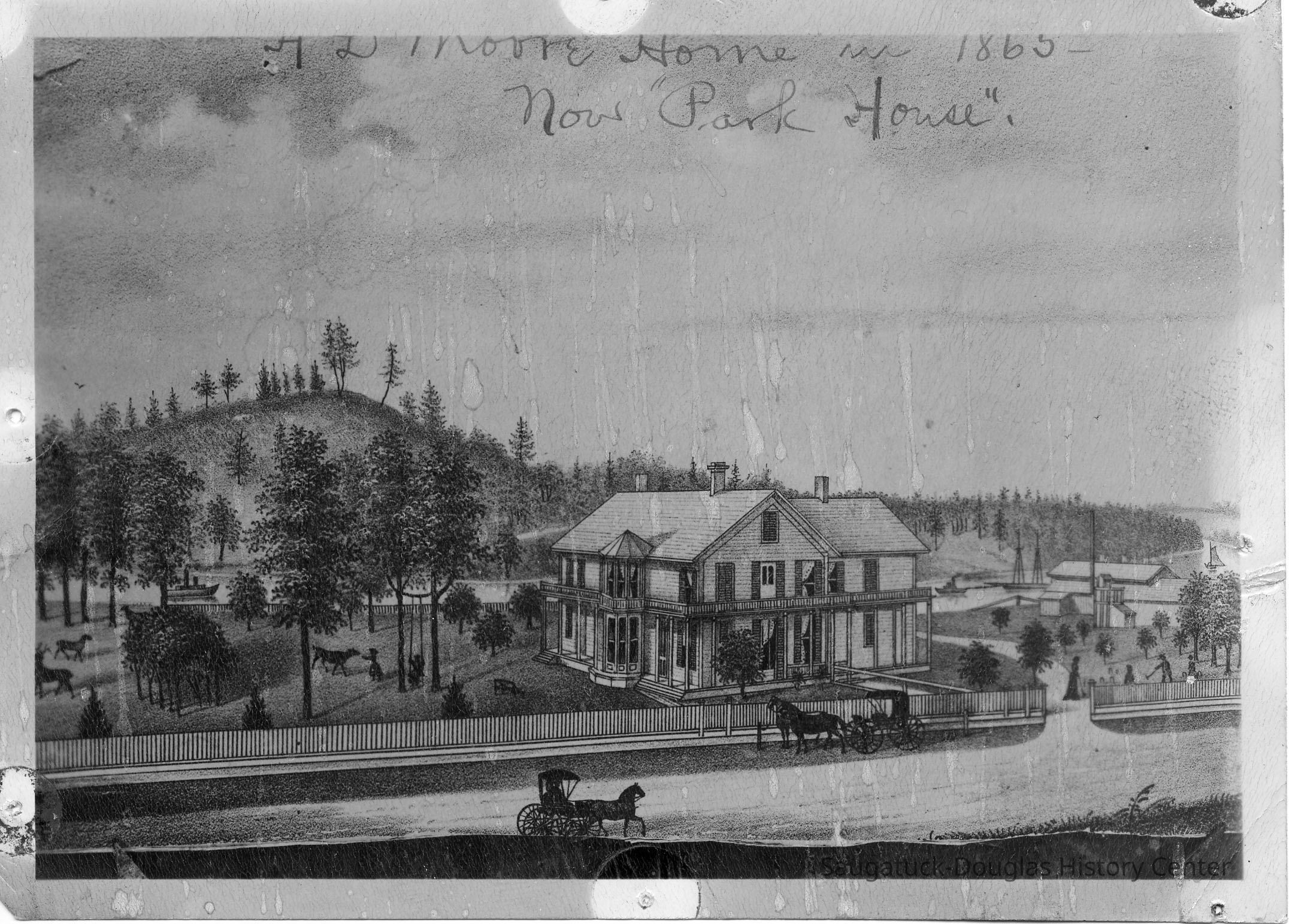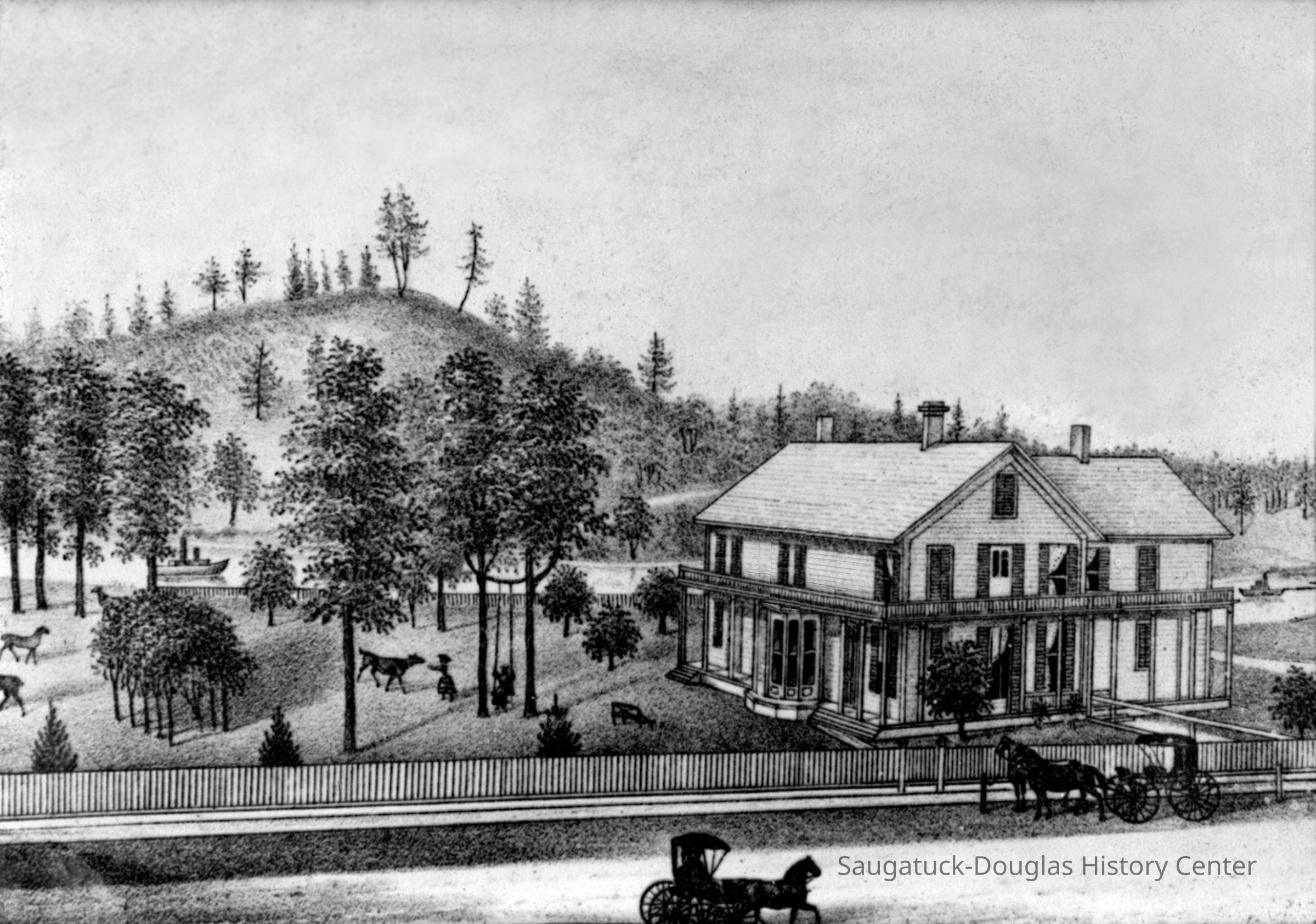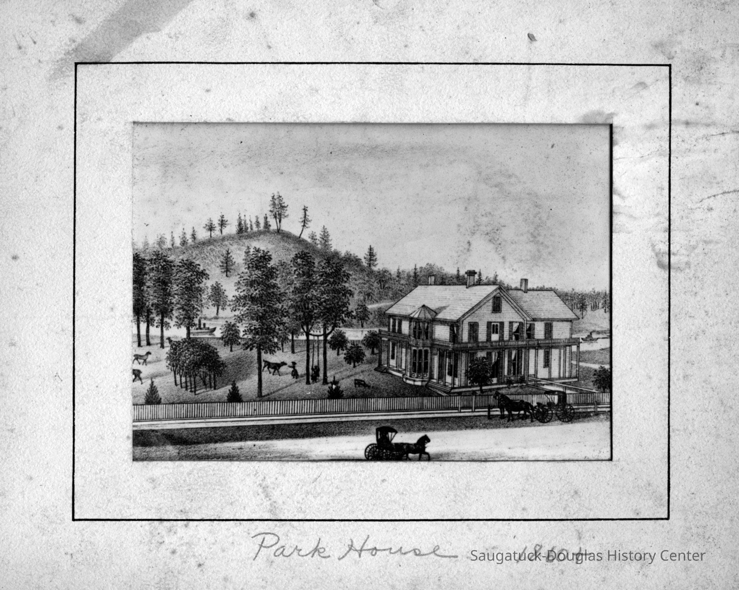 This image ran in the Aug. 15, 1968 Commercial Record with the caption "The Park House in Saugatuck on Holland Street in 1880 when it was the residence of Horace D. Moore. It was called the Park House because of the fenced yard with tame deer. The building still stands near the Elbo Room. from an old engraving)