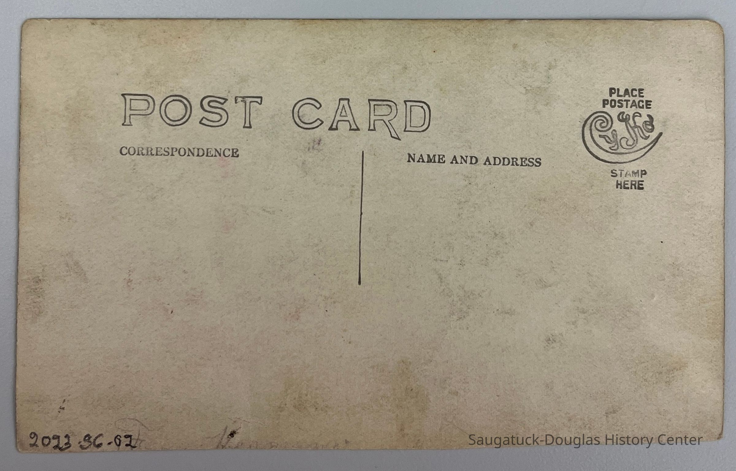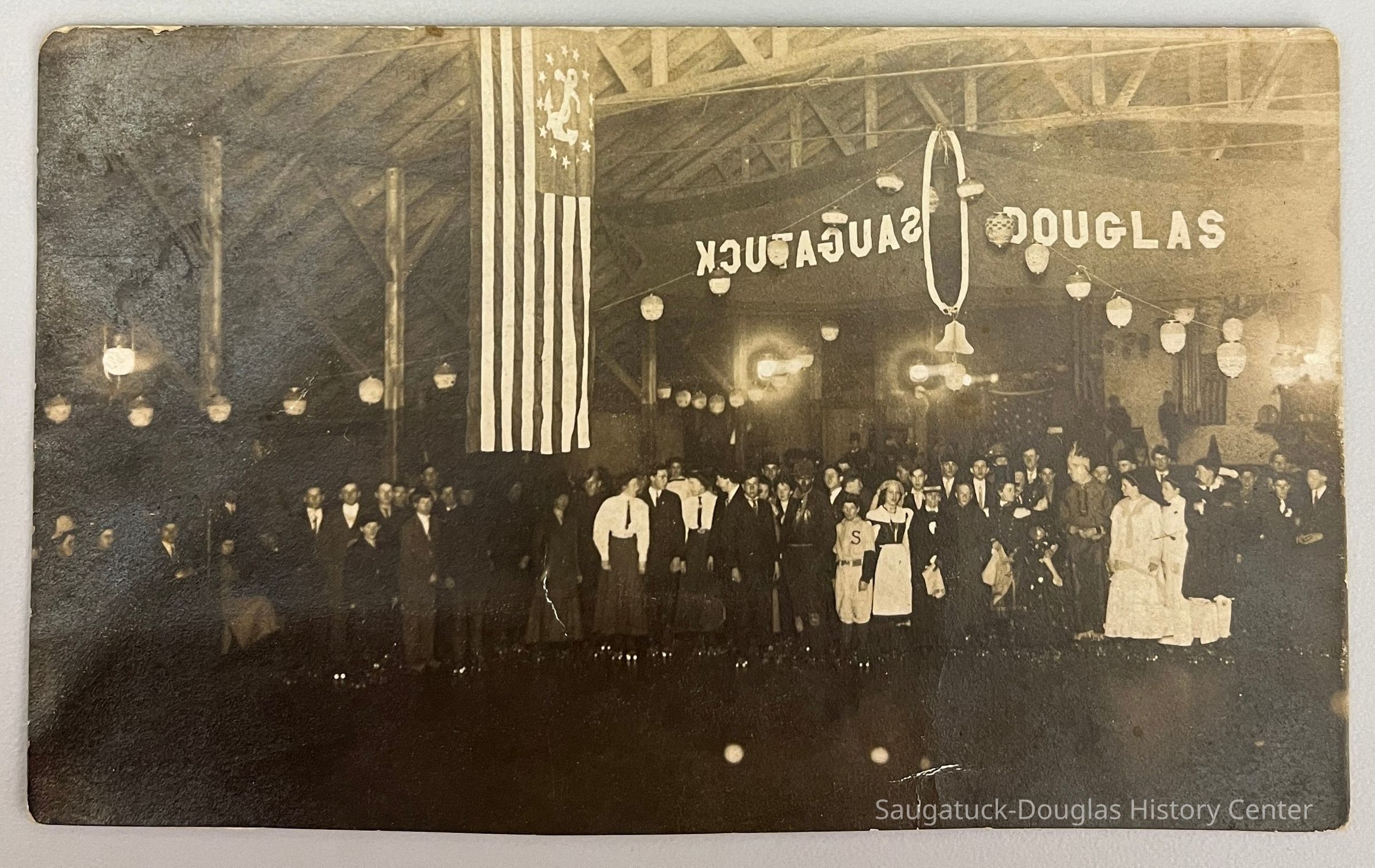 Real photos postcard of a group of people lined up inside a large building with wooden pillars and trusses. A U.S. "Yacht Ensign" flag is hanging vertically from the rafters. Two triangular swallowtail flags or burgees display the names "Saugatuck" and "Douglas". Additional decorations include strings of paper lanterns and a bell shape.