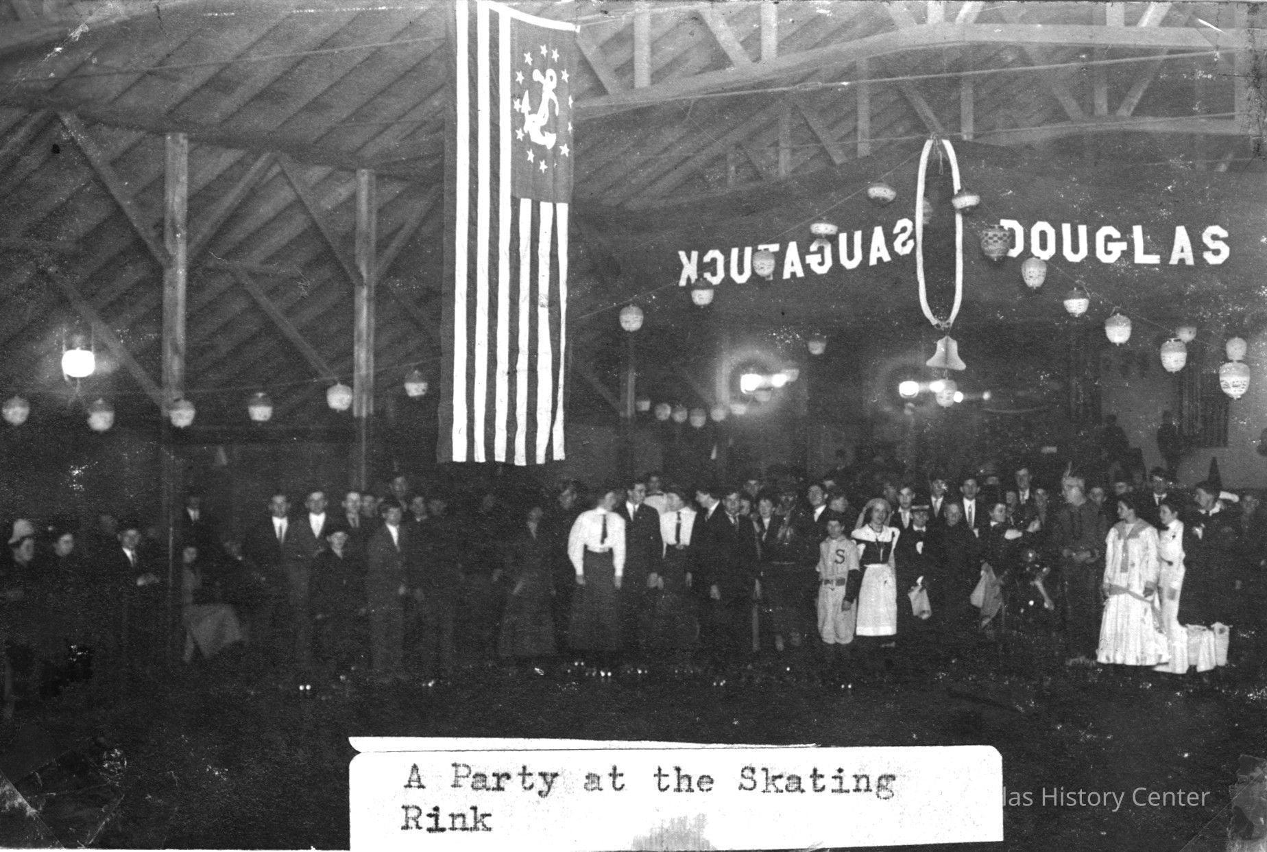 Most of the people in the photo are wearing dark clothing, but some individuals are wearing baseball or scout uniforms and Indian or pilgrim costumes. Glints along the floor suggest the people are wearing roller skates so the location could be the skating rink. The photo could depict a Halloween or Thanksgiving celebration or event.Subject Person/Organization