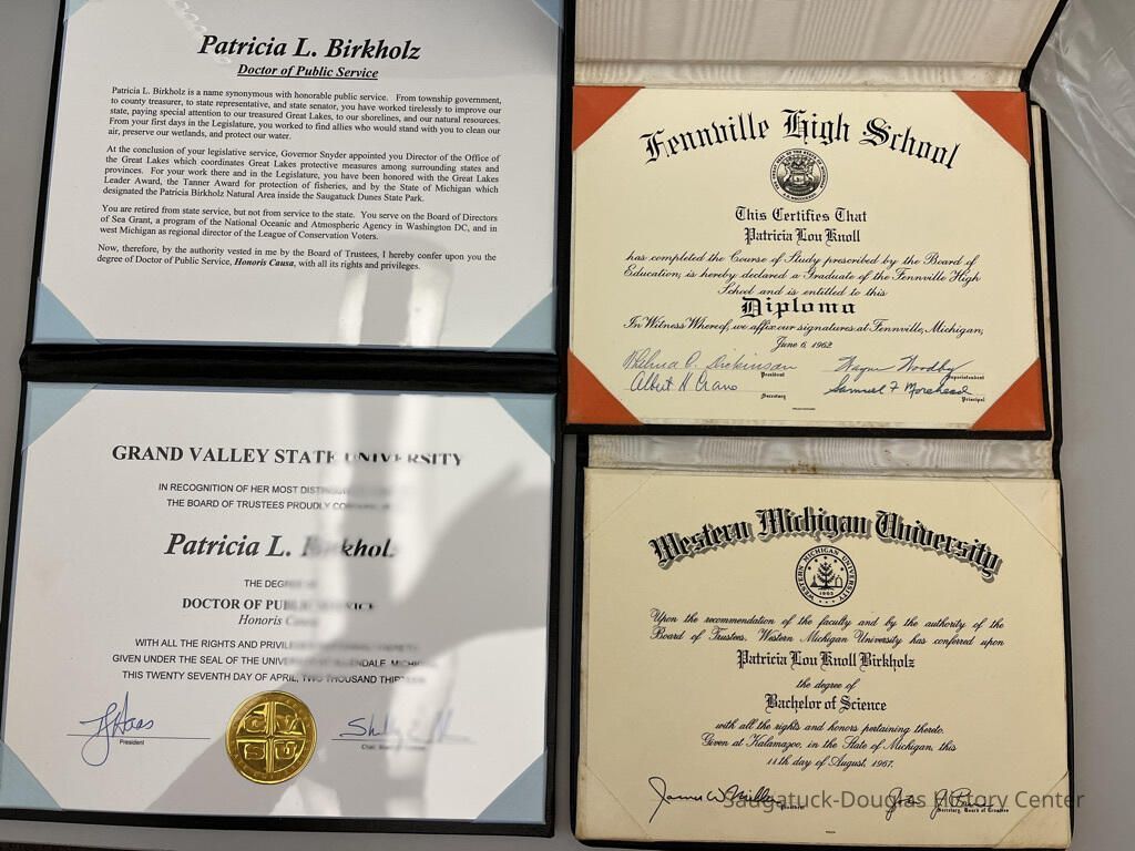 Patricia L. Birkholz diplomas from Fennville High School, Western Michigan University and Grand Valley State UniversityAcquisition