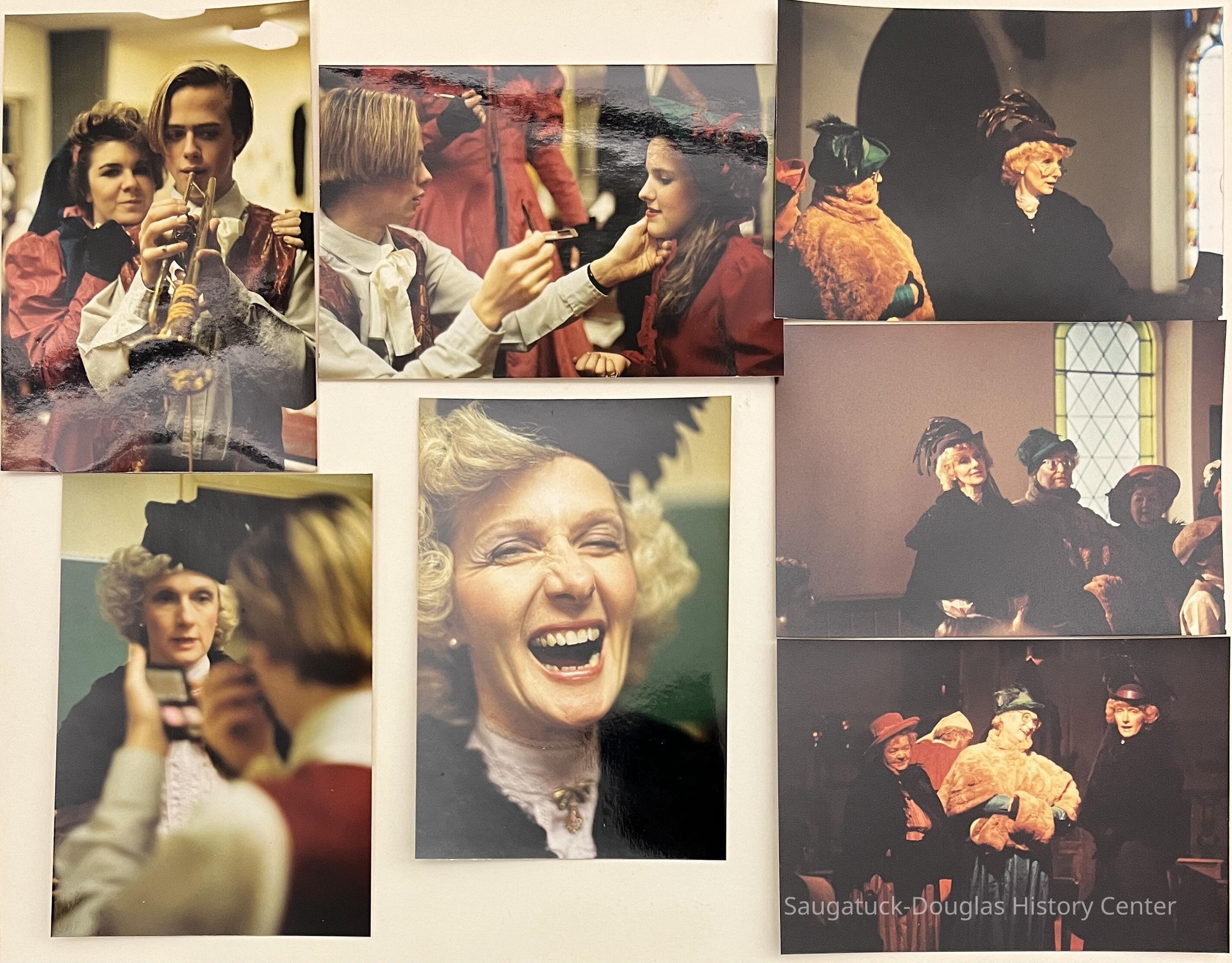 Seven snapshots of Patricia L. Birkholz and cast from the Saugatuck Christmas Carol performance. At donation the photos were taped inside a collage frame. For best preservation, the photos have been removed from the frame.Photograph Details