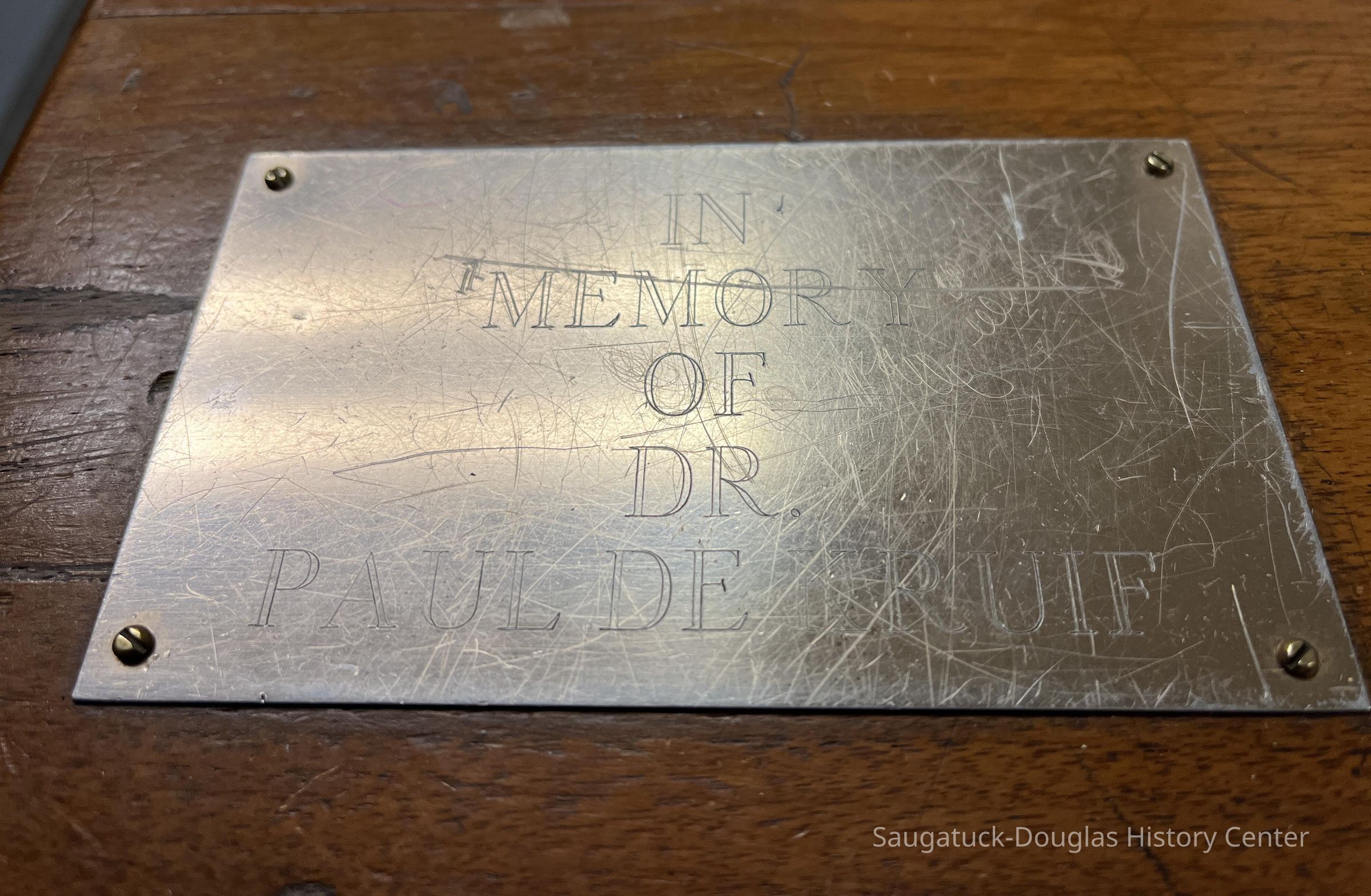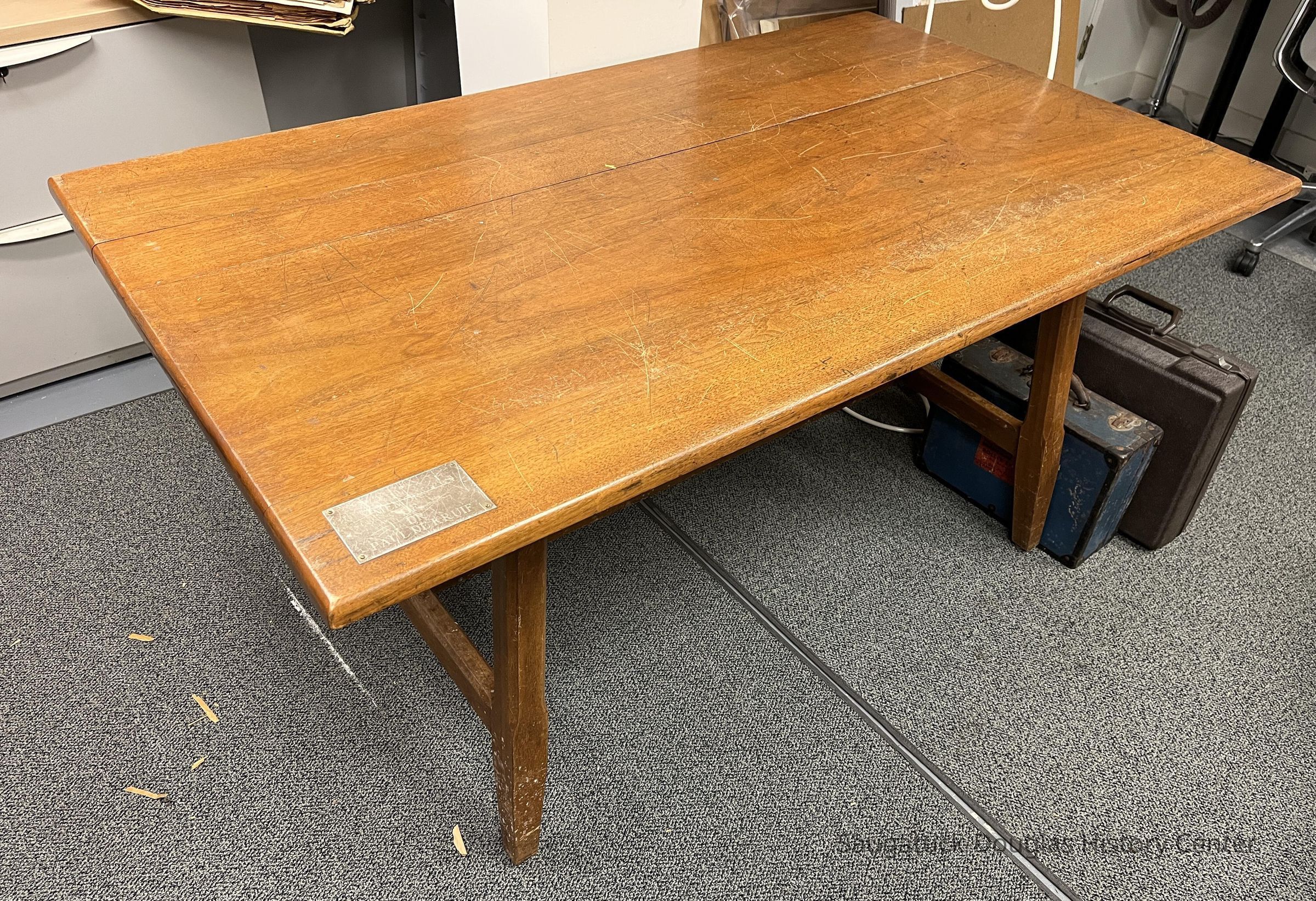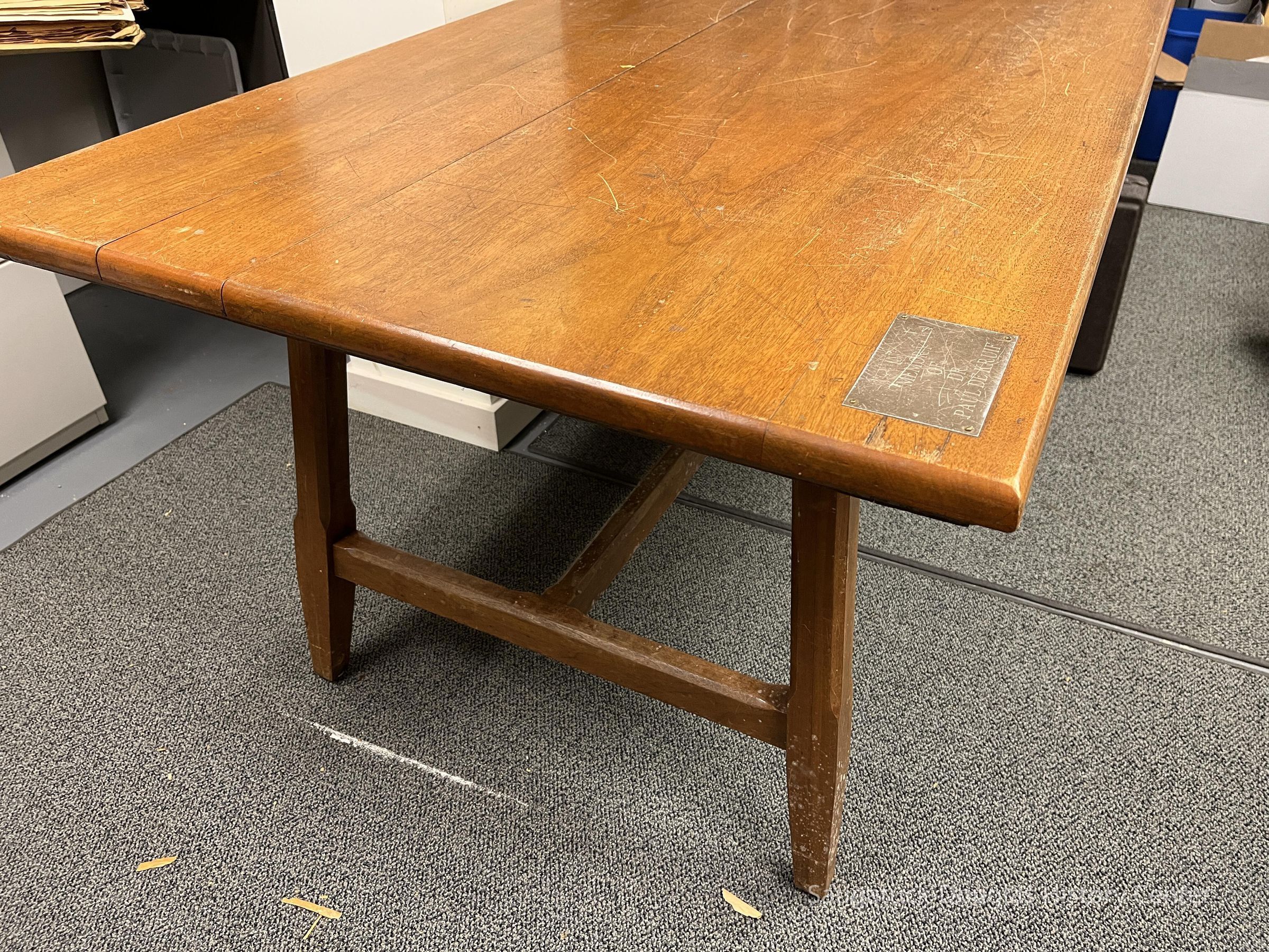 Sturdy wooden table with a plaque that reads "In memory of Dr. Paul de Kruif" on one corner.Context
