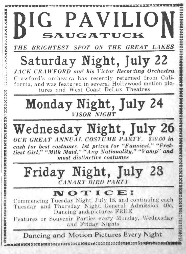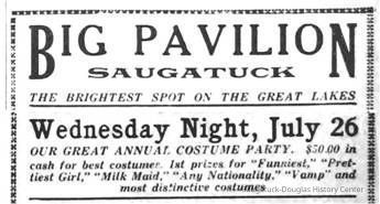 For over 50 years, the Saugatuck Pavilion was a center of entertainment for young and old. One of the annual events in the early 1930s was a Costume Party and contest, with cash prizes for the winners. In 1933, four young girls, two locals and two summer people were a part of the competition. The oldest, Phyllis Pamperien, a college sophomore, designed and sewed the costumes, which consisted of a milk maid outfit and a cow suit. Local teens Betty and Vivian Powers, and Elizabeth Pamperien, sister of Phyllis, were the contestants. Vivian, a beauty who was to be the 1937 Blossom Queen, was the milk maid, while Betty and Elizabeth did their duty the inside of the cow.