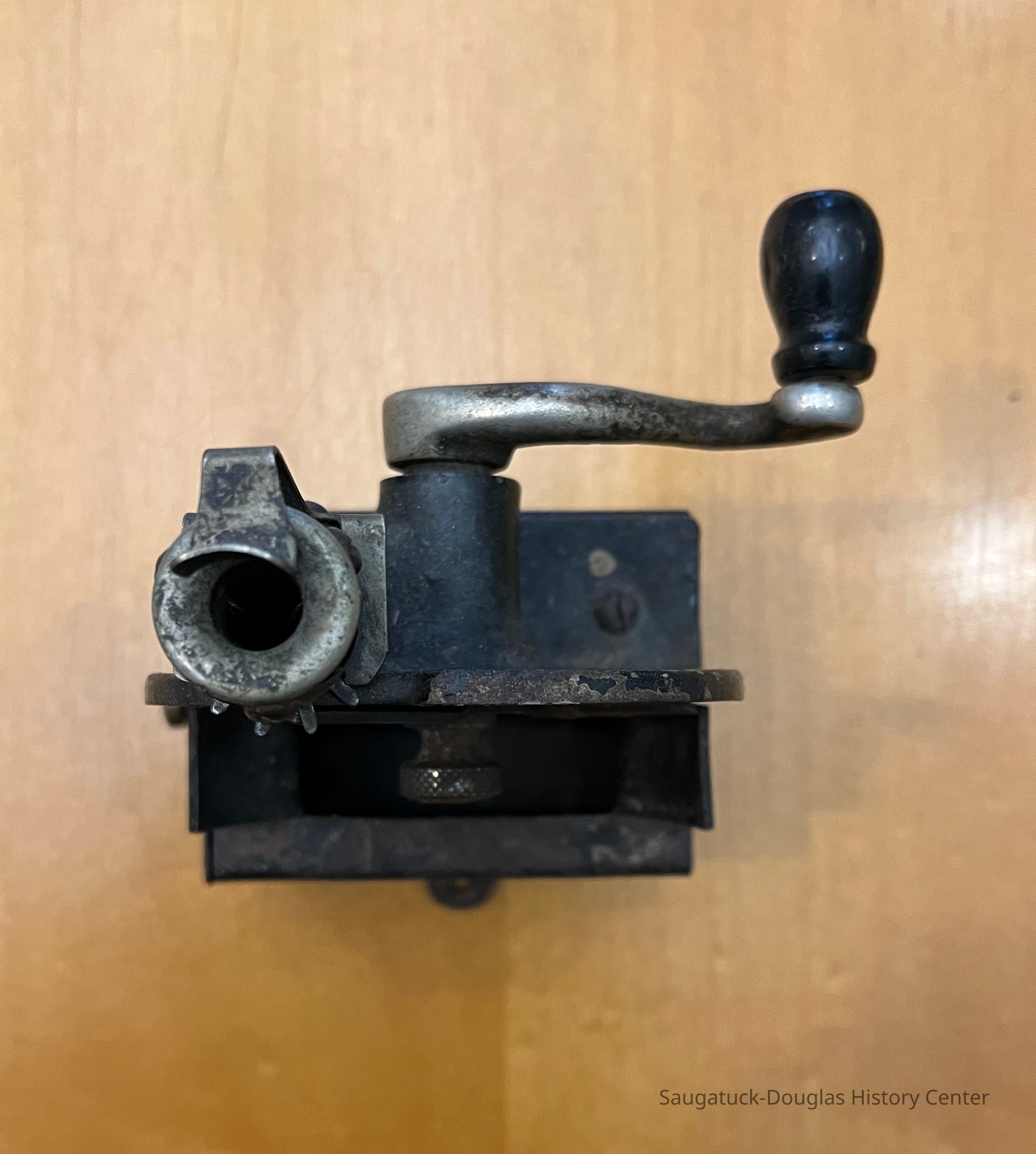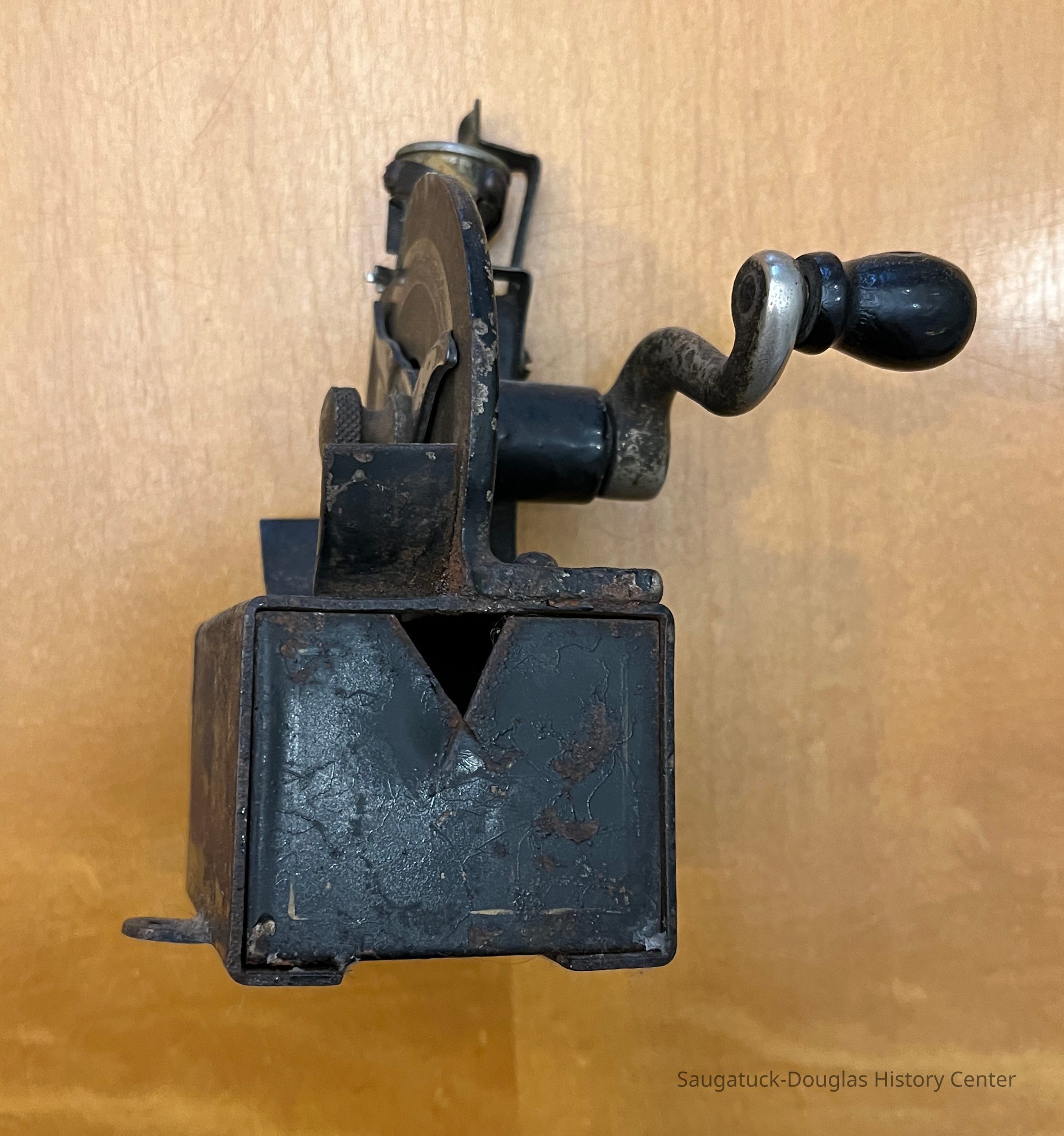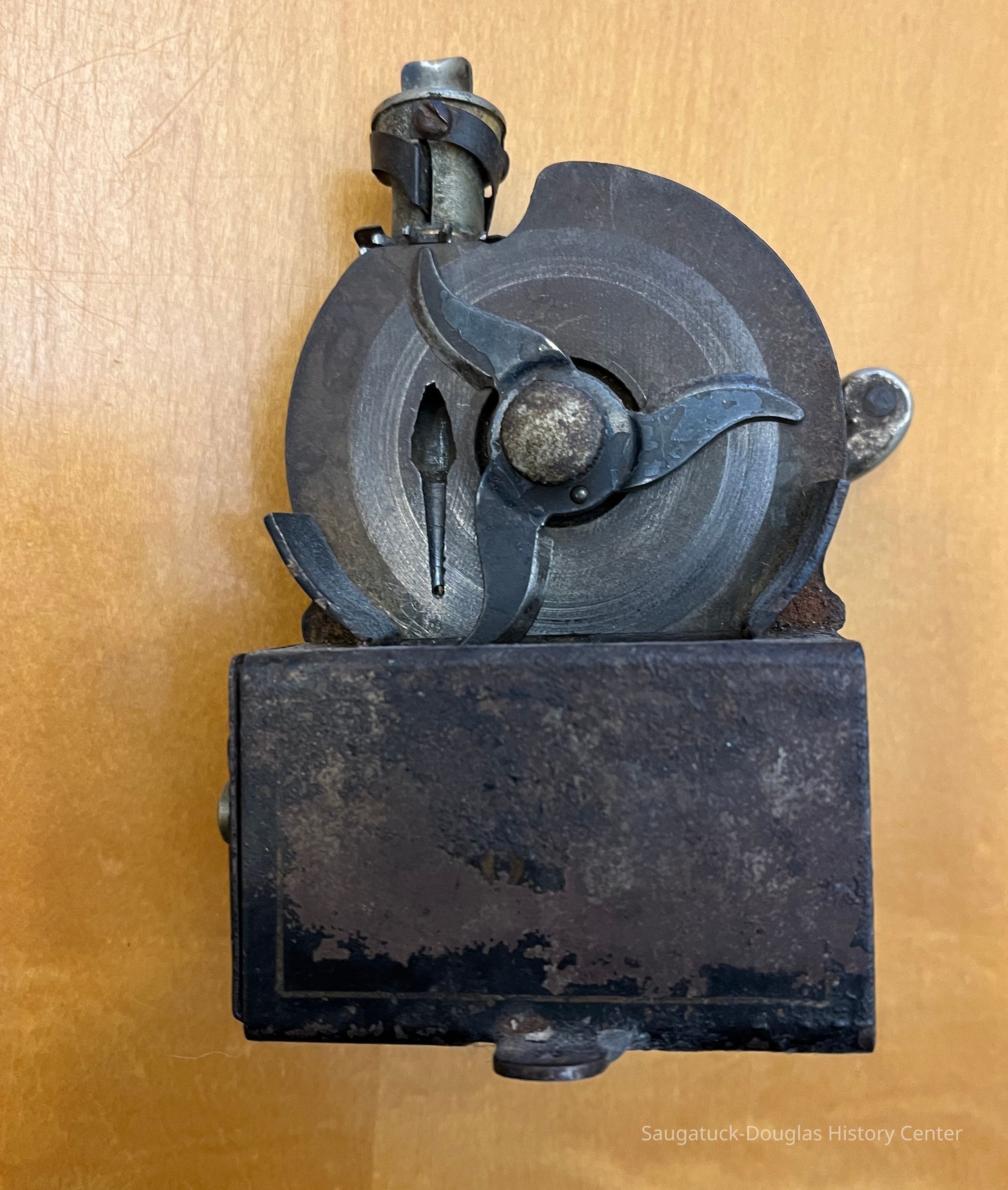 Handcranked pencil sharpner with drawer in side - 3 arched blades similar to a meat slicer painted black with the words, Kidder Novelty Works, Chicago, ILCollection