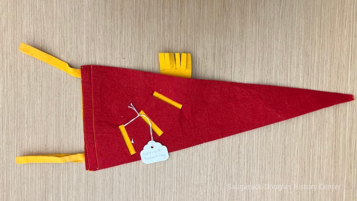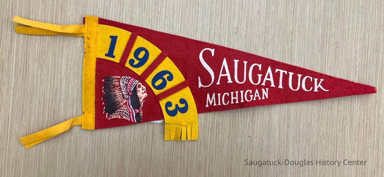 Synthetic red felt pennant, 17" long, with an illustration of an Indian with Plains-style feathered headdress in the bottom left. Printed white text reads "Saugatuck Michigan." 1963 is printed in blue on a gold, woven-in felt strip shaped like an arch over the Indian image.Collection