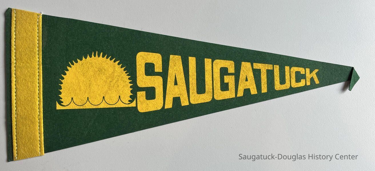 Green synthetic felt [or fibrous paper] pennant with yellow applied stripe and the word "Saugatuck" and a stylized sun over waves printed in yellow ink.