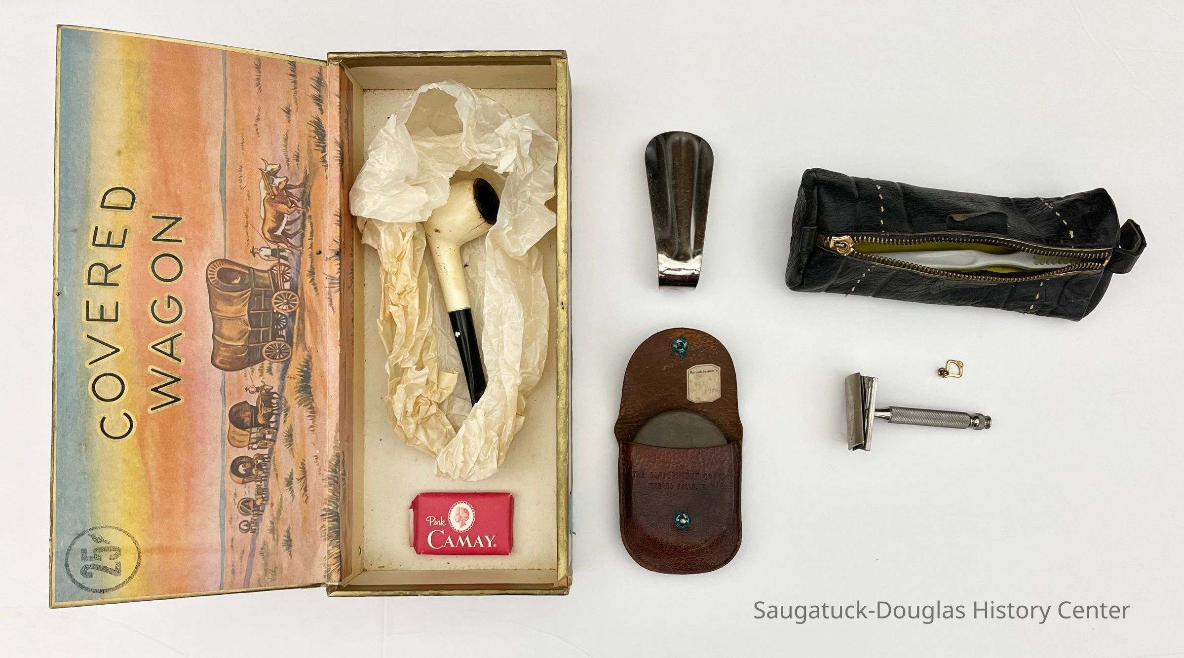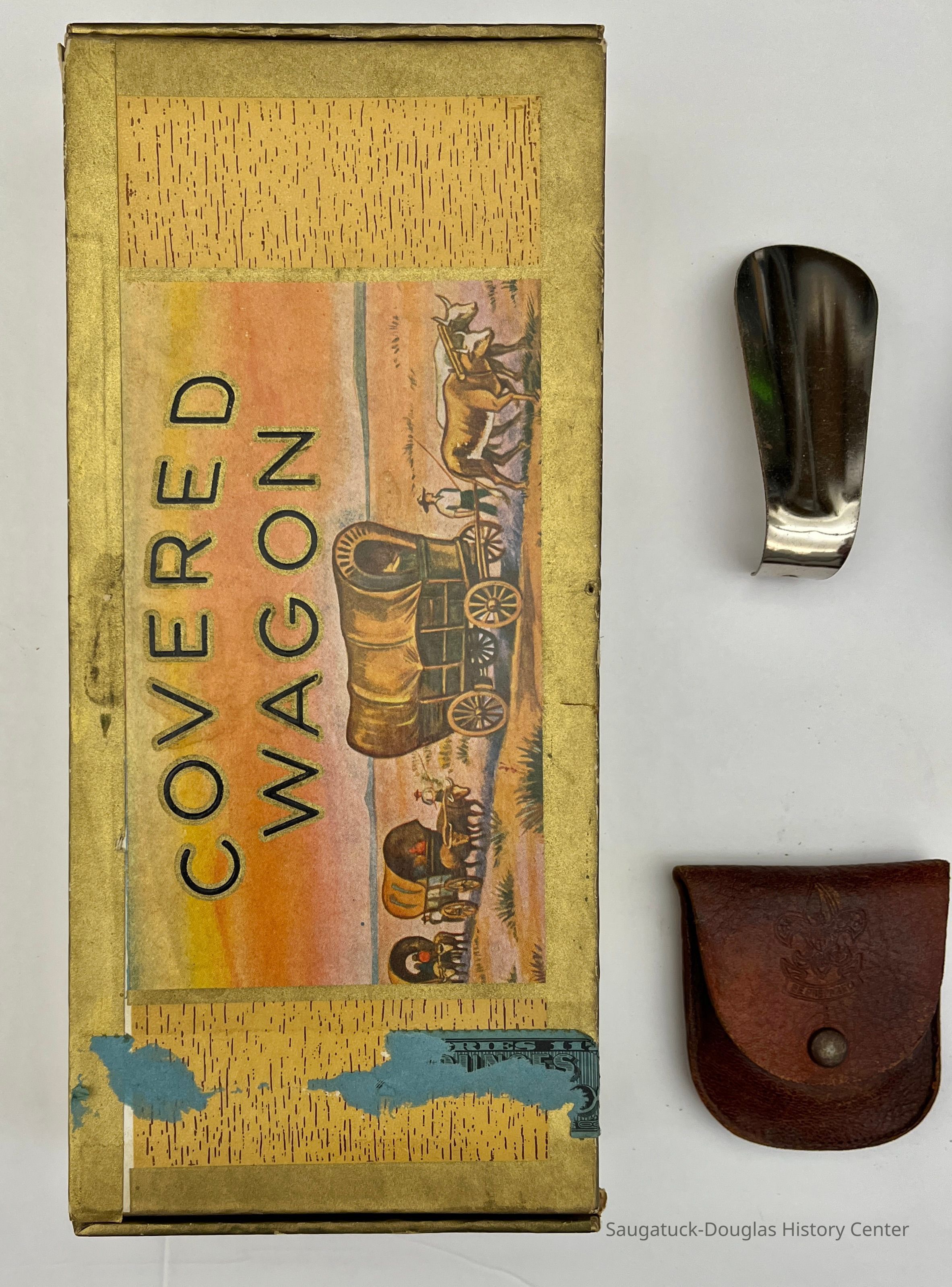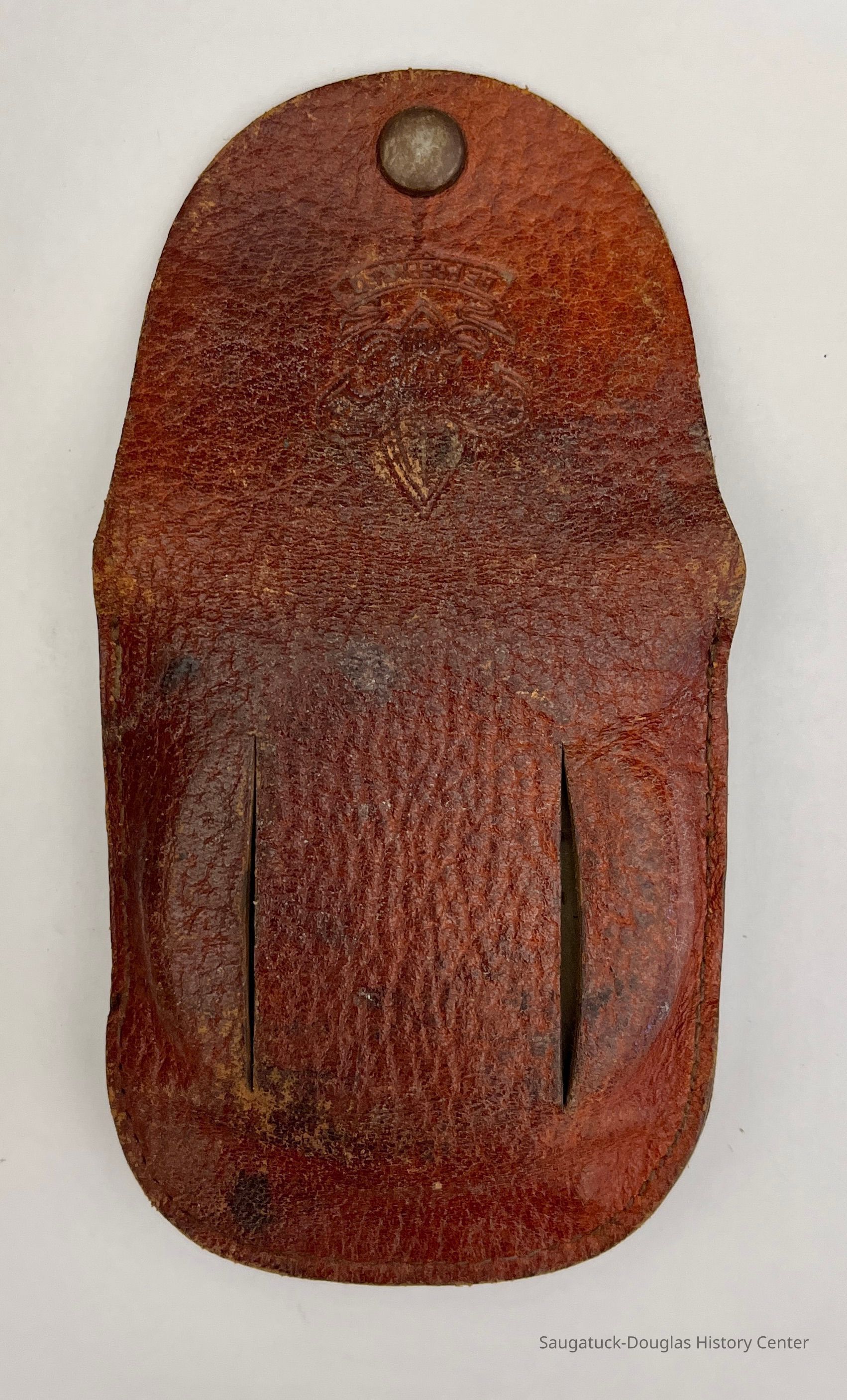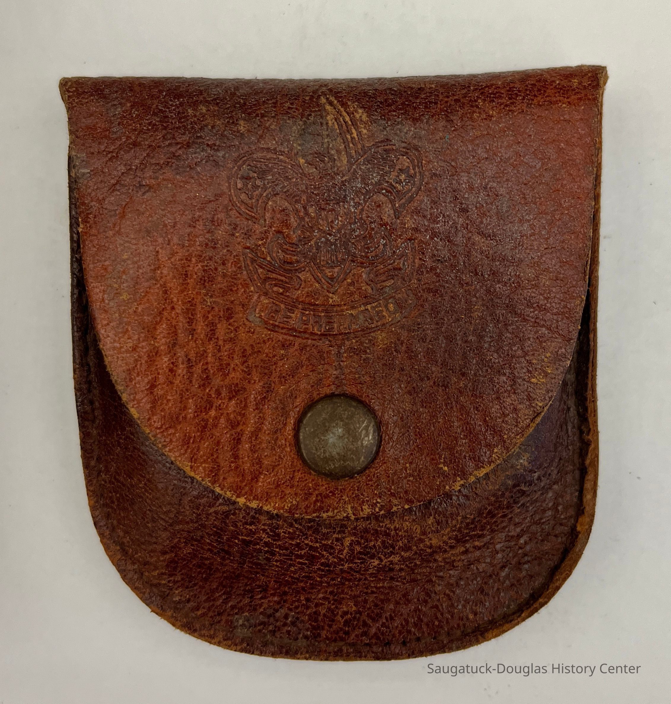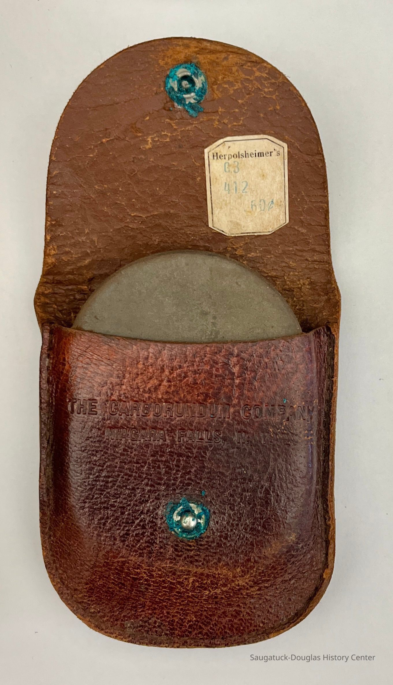 4. Boy Scout insignia-embossed leather belt pouch with snap closure that contains a sharpening stone from the Carborundum Company, Niagara Falls, New York. Under the pouch's flap is a 60-cents price sticker from Herpolsheimer's, a department store with locations in Grand Rapids and Michigan City.