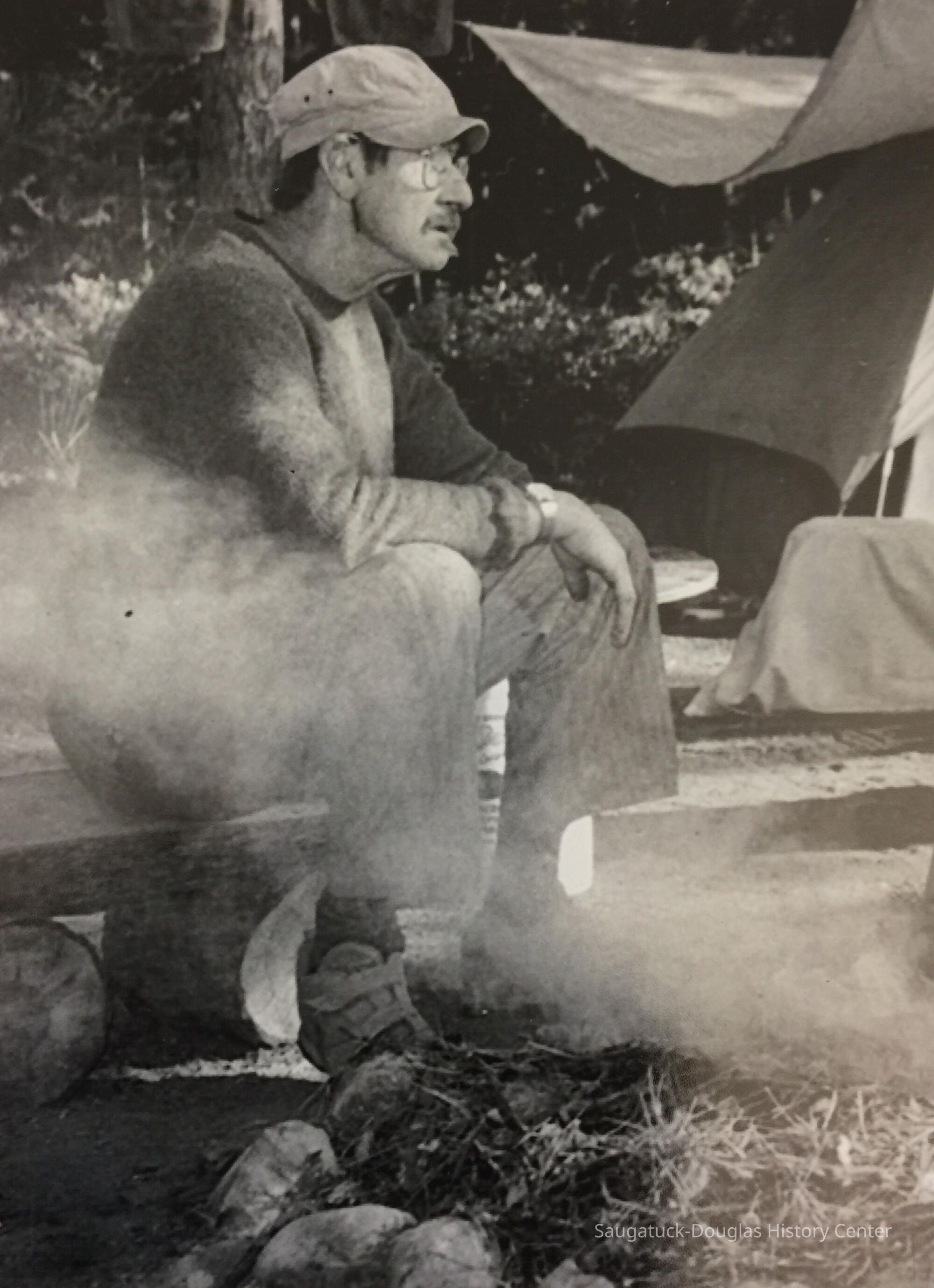 Photograph of artist John Peterson sitting beside a camp fire with a plume of smoke in the foreground and a tent and woods in the background. Mr. Peterson is wearing a cap, glasses, wristwatch and velcro-close shoes.Photograph Details