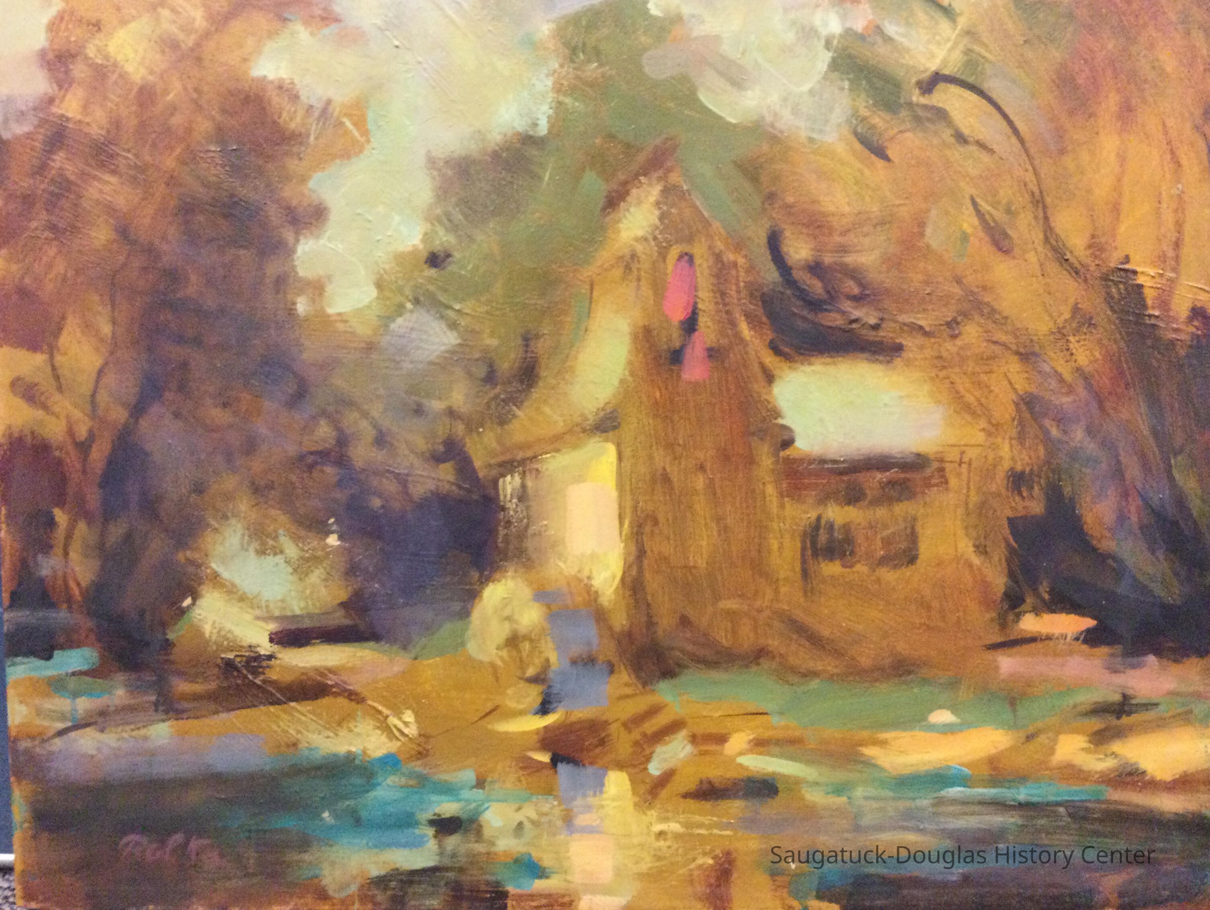 Impressionistic oil painting of the Peterson Mill in Saugatuck, Michigan executed in warm, brown tones.Type of Painting