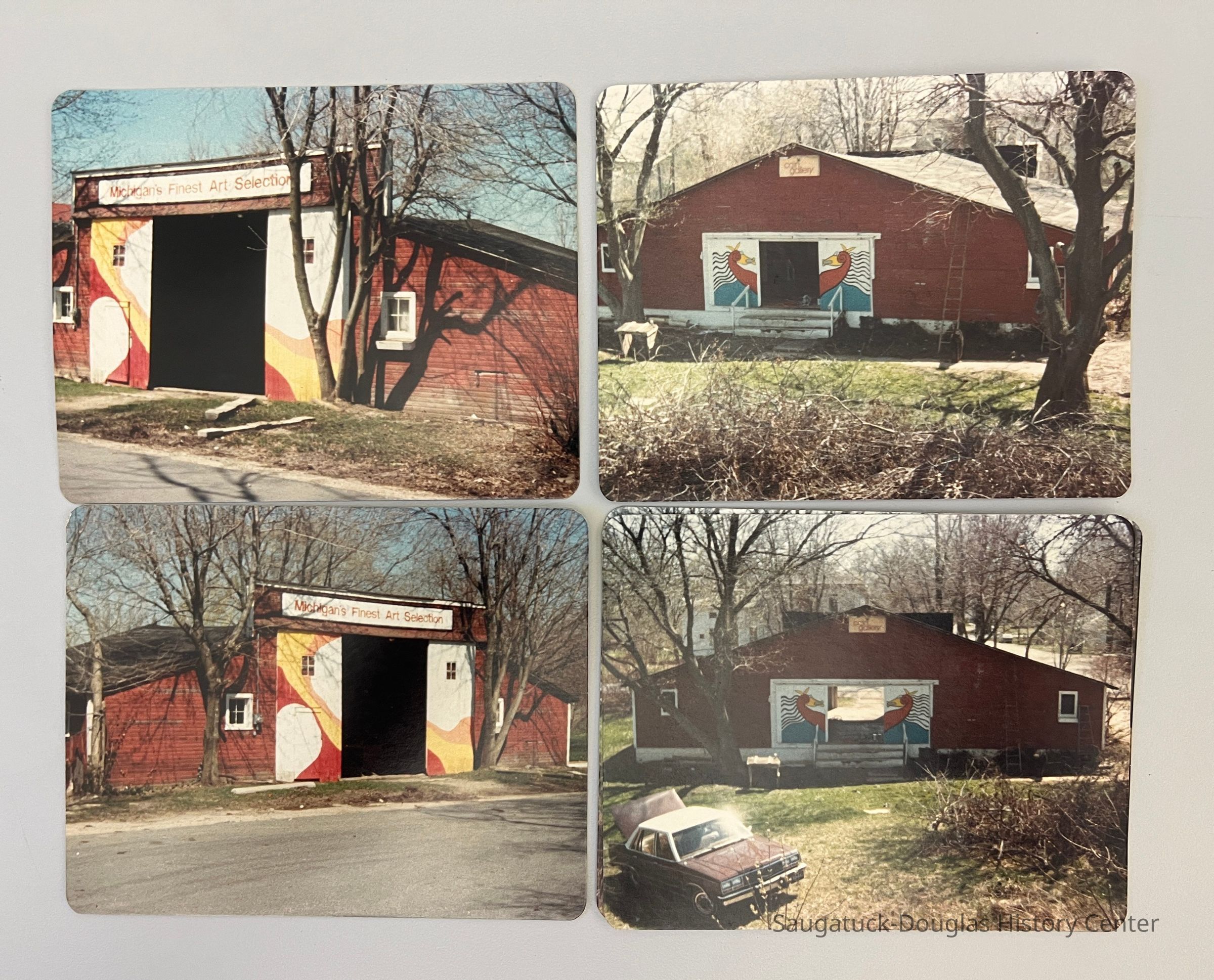 Five photos of the red barn next to Petter Gallery at 161 Blue Star Highway. The backs of the prints are blank. The building has a sign over the door that reads "Cain Gallery" and "Michigan's Finest Art Selection"