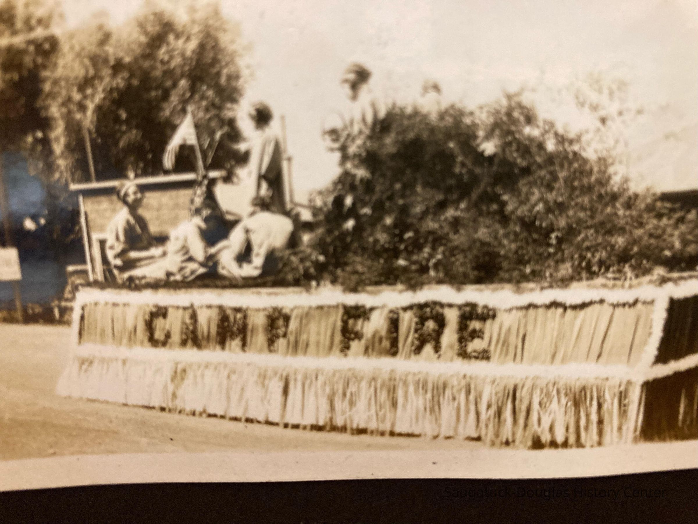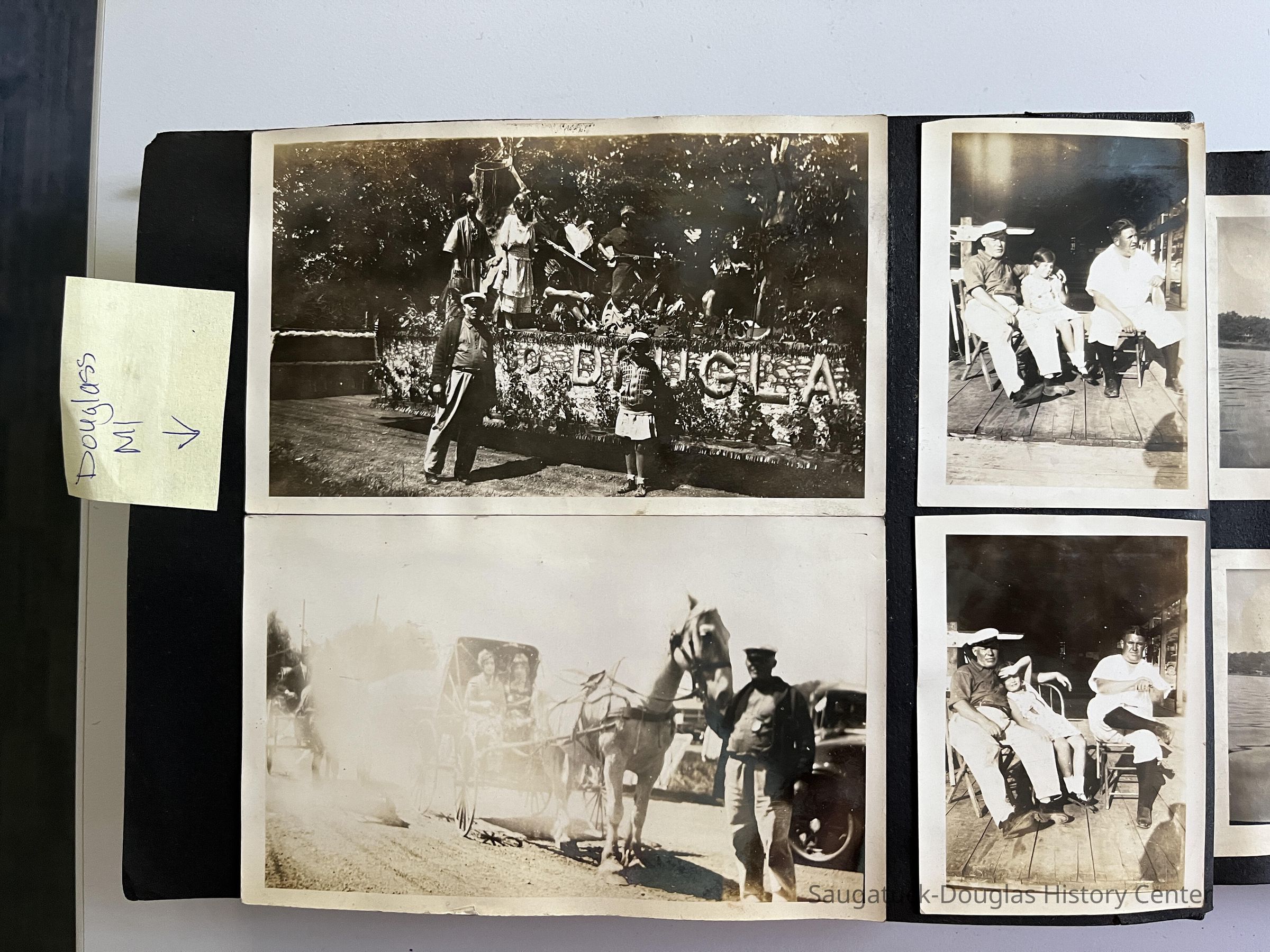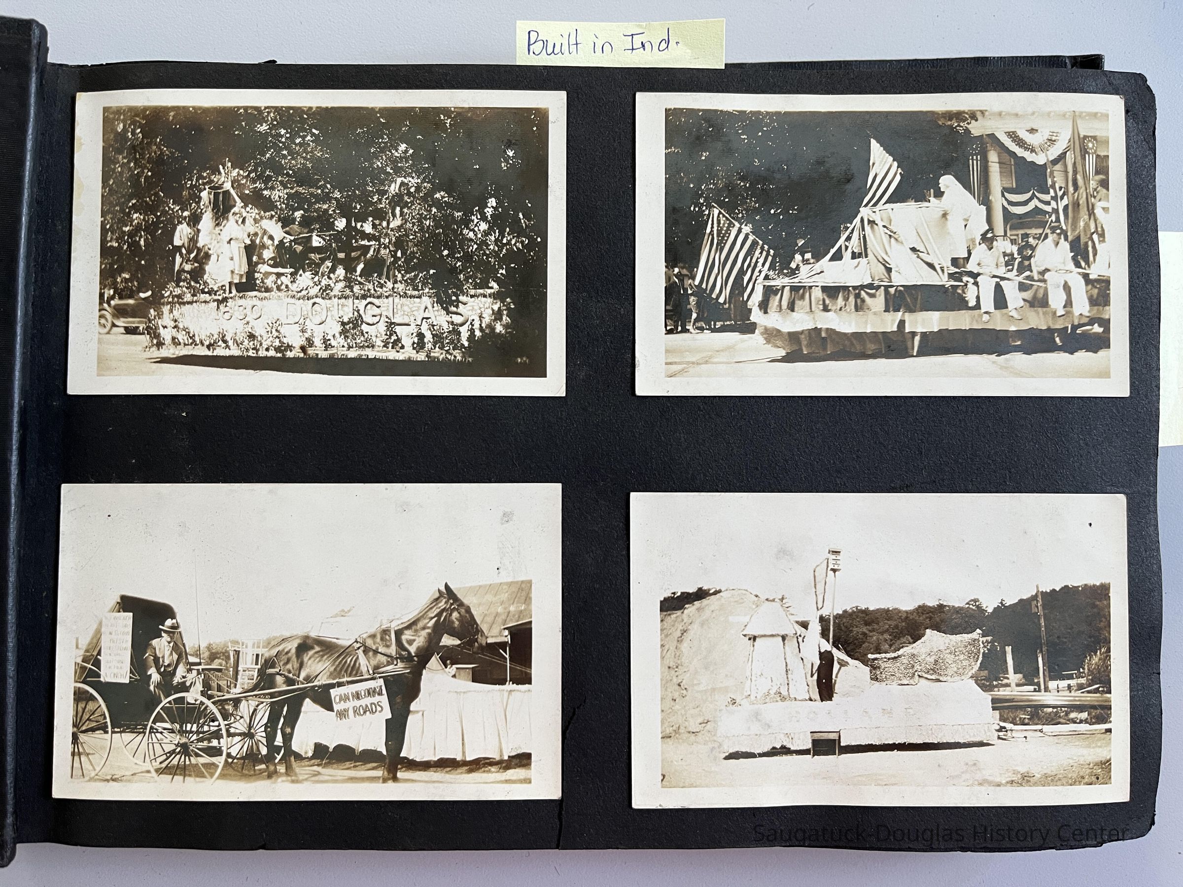 The photos include images of parade floats possibly from the 1930 centennial including Dr. Walker with his horse and buggy and sign "Can Negotiate Any Roads", Camp Fire by Edgewater Boat Livery, Columbine Garden Club (was one in Saugatuck), The Big Pavilion,