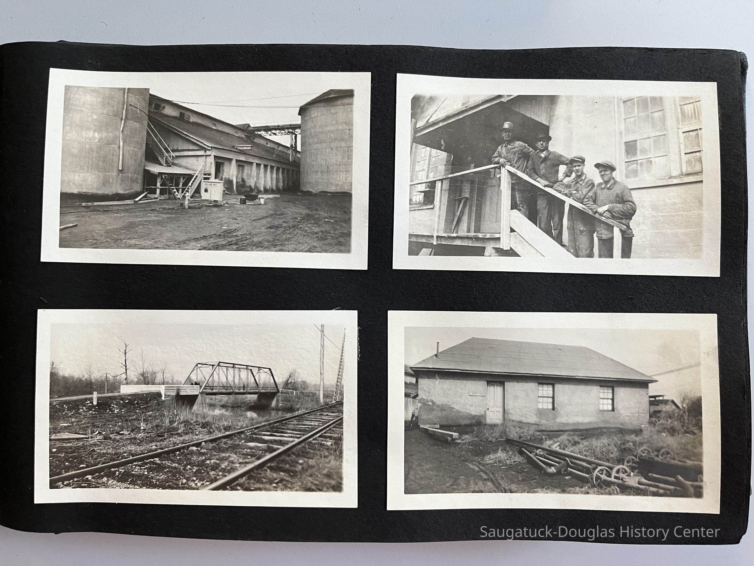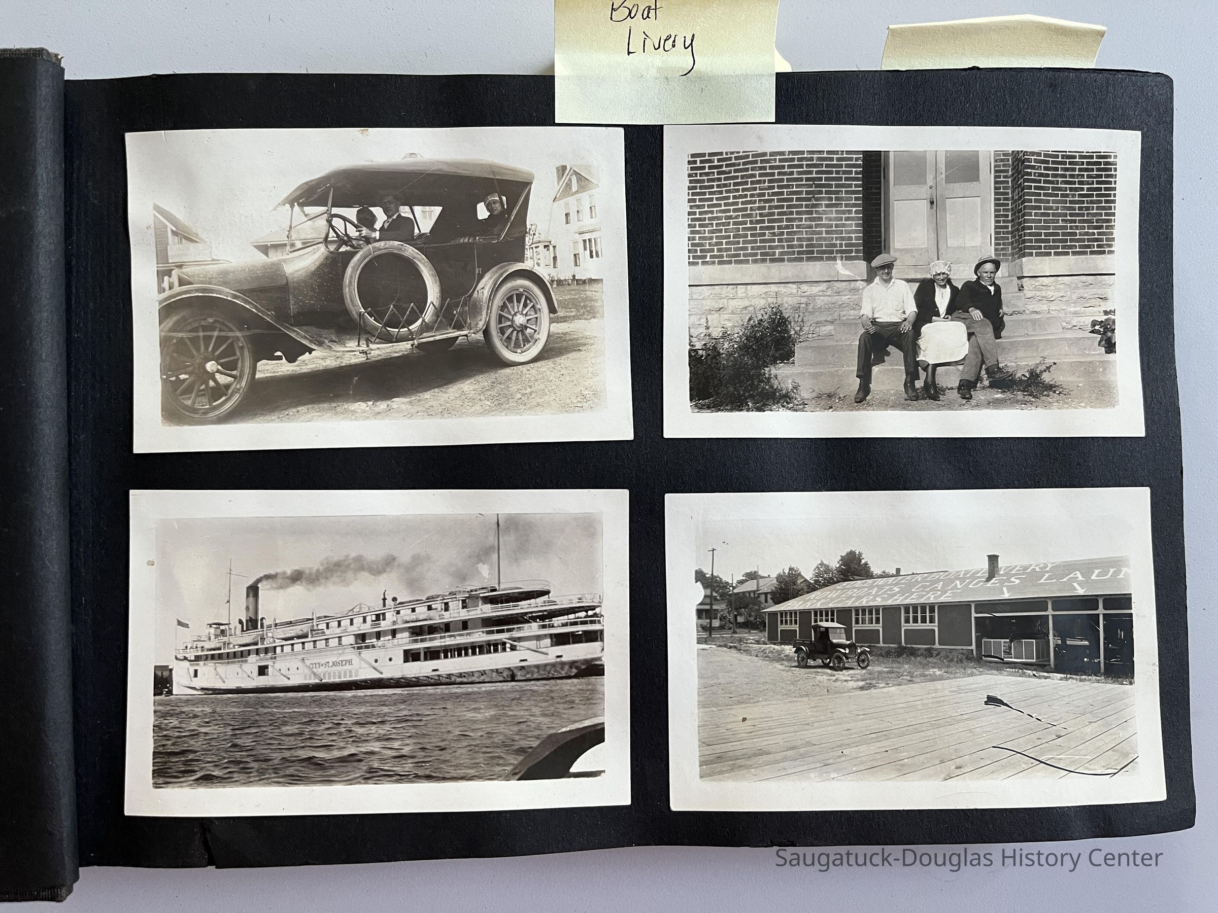 Three photos albums from the 1920s and 1930s from the Maud Preston Palenske Library in St. Joseph, Michigan. The horizontal albums have black covers and black paper pages. Most every page has four black and white images pasted in a tidy grid.Context
