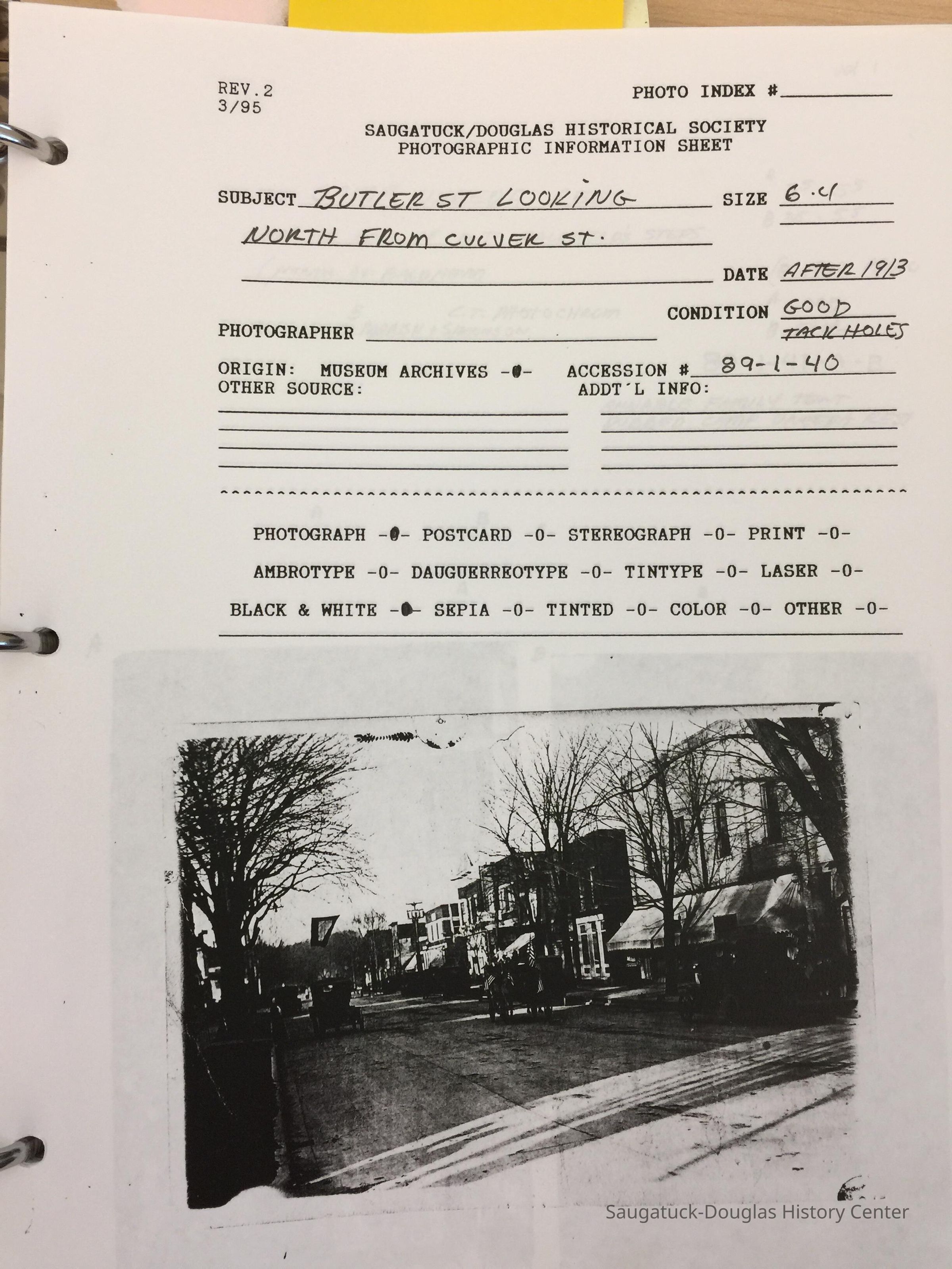 Four boxes of file folders, each containing a historic photos and accession paperwork. Three binders of photocopies of all images plus a slim blue report is on the archive library shelves. A small sampling of the images, as gathered by Jack Sheridan, is shown here with abbreviation removed from file names: