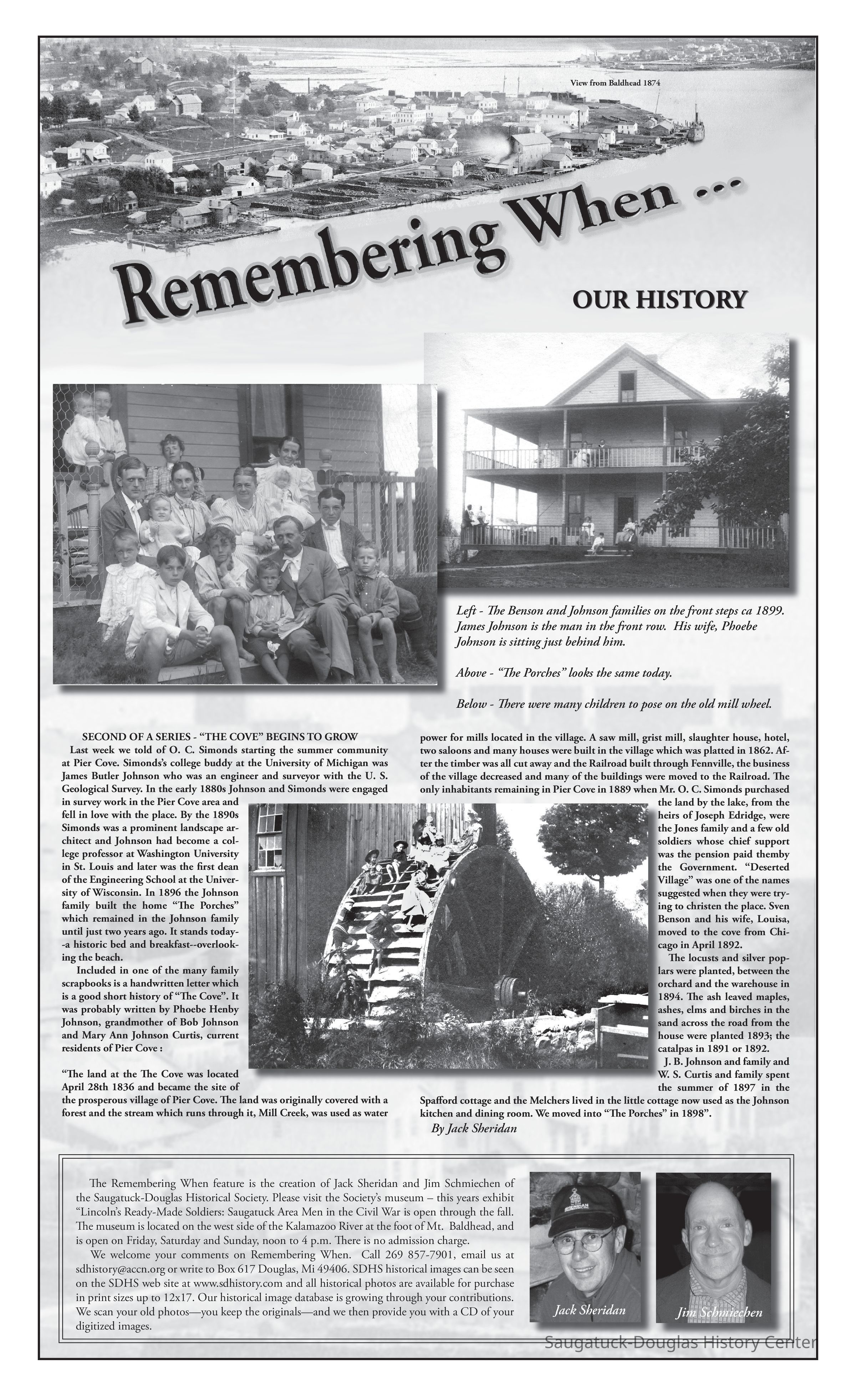 Last week we told of O. C. Simonds starting the summer community at Pier Cove. Simonds’s college buddy at the University of Michigan was James Butler Johnson who was an engineer and surveyor with the U. S. Geological Survey. In the early 1880s Johnson and Simonds were engaged in survey work in the Pier Cove area and fell in love with the place. By the 1890s Simonds was a prominent landscape architect and Johnson had become a college professor at Washington University in St. Louis and later was the first dean of the Engineering School at the University of Wisconsin. In 1896 the Johnson family built the home “The Porches” which remained in the Johnson family until just two years ago. [Article published in 2005] It stands today--a historic bed and breakfast--overlooking the beach.