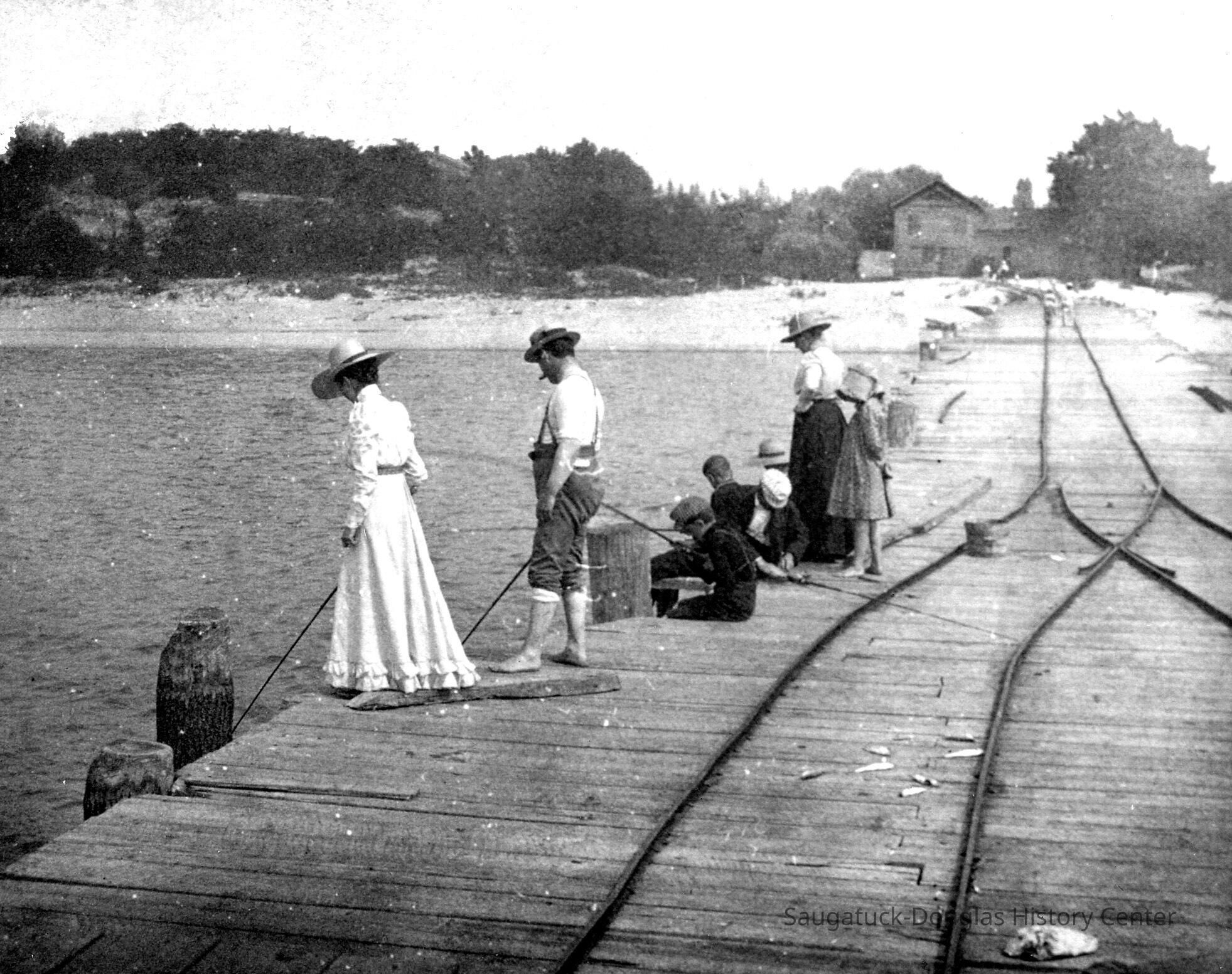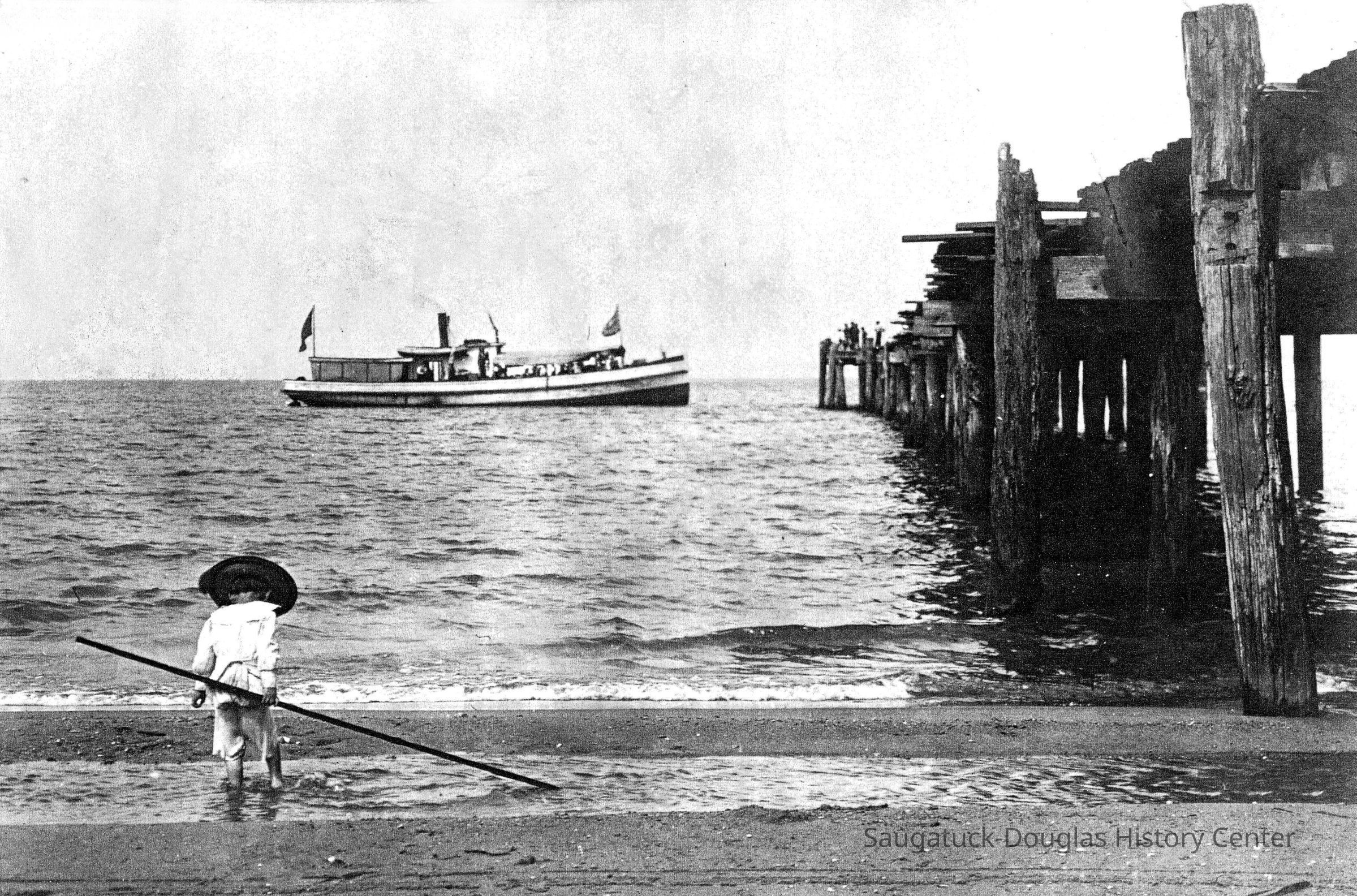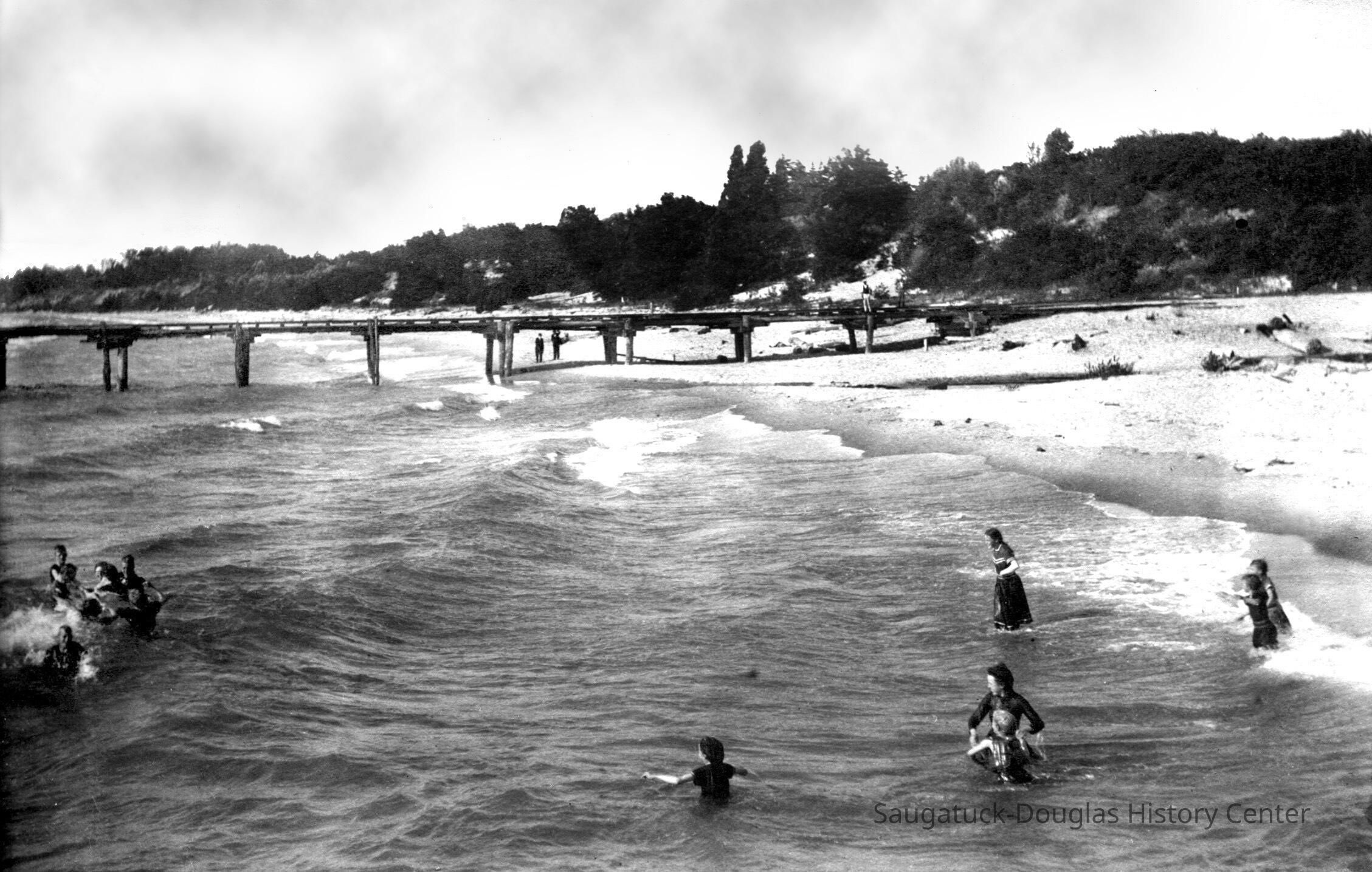 Photographs tell the story of the Pier Cove beach. The piers, the original and commercial reason for the existence of the settlement stayed in use until 1916. Note the rails that allowed horse-drawn carts to bring cargo to vessels at pierside. The piers made it easy for Pier Cove visitors to come by ship - a short overnight trip from Chicago. Husbands came on weekends to be with their summering families.