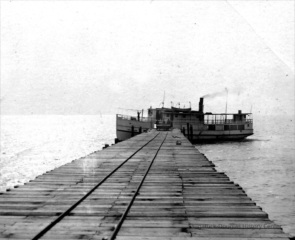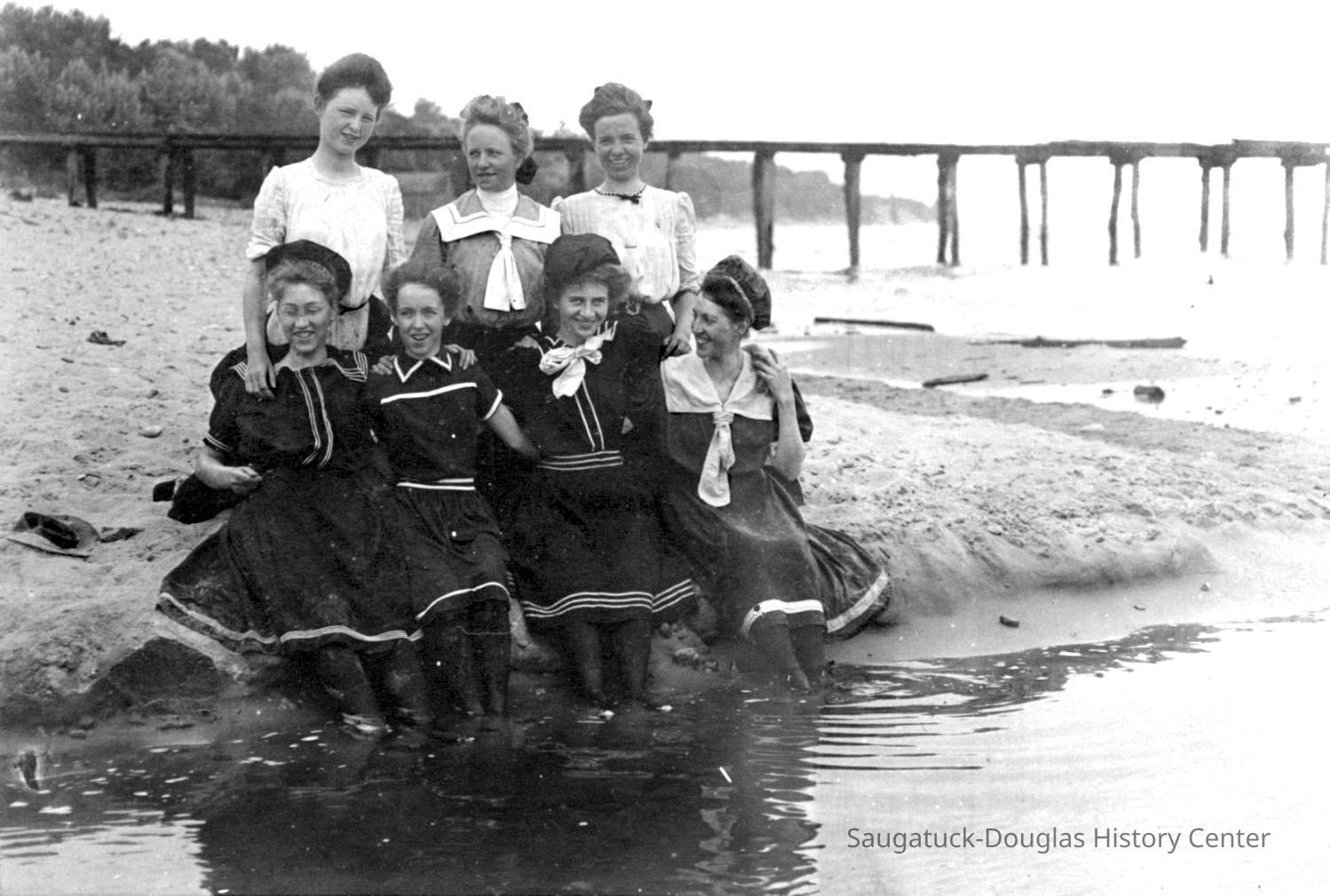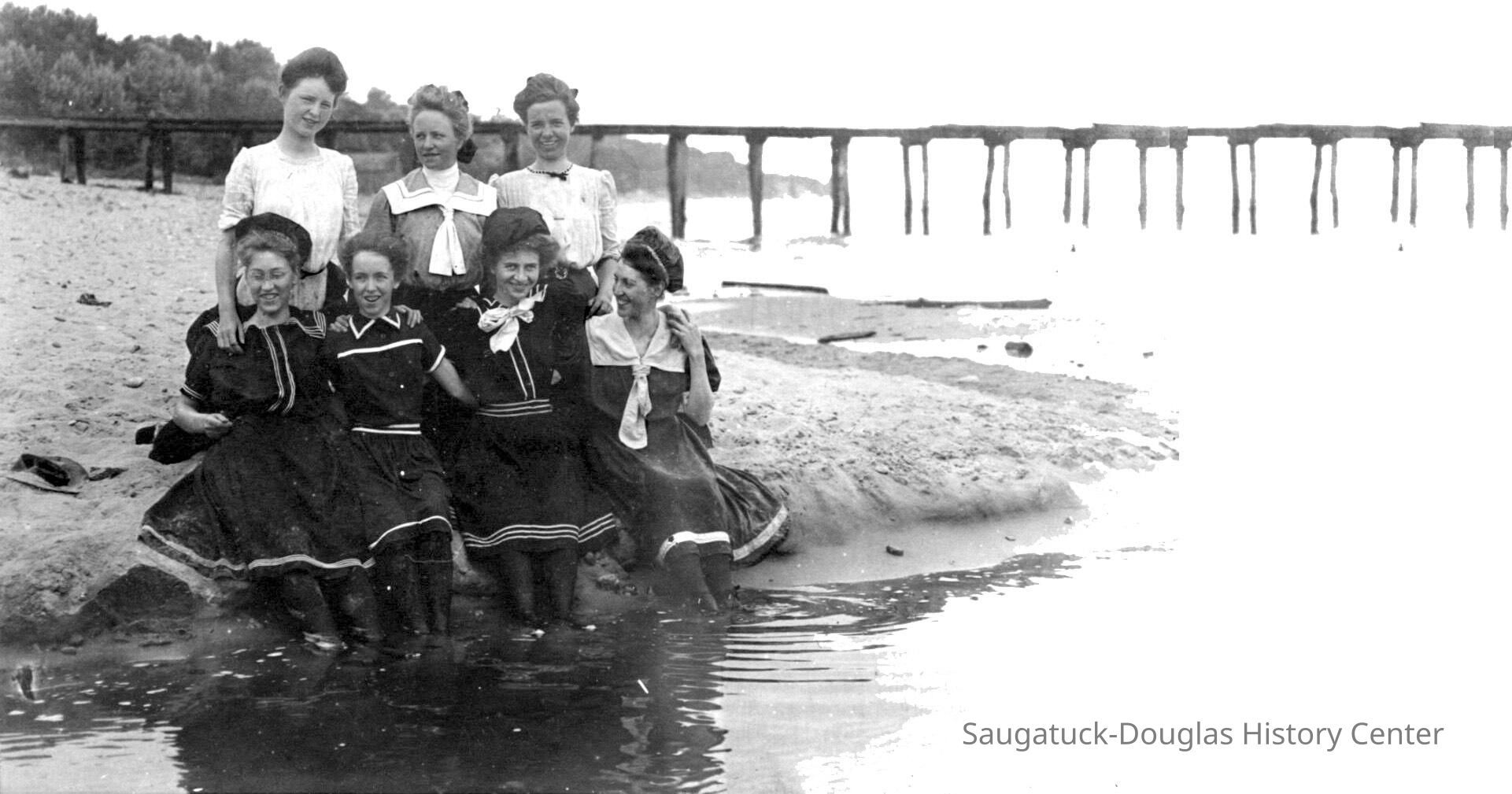 Photographs tell the story of the Pier Cove beach. The piers, the original and commercial reason for the existence of the settlement stayed in use until 1916. Note the rails that allowed horse-drawn carts to bring cargo to vessels at pierside. The piers made it easy for Pier Cove visitors to come by ship - a short overnight trip from Chicago. Husbands came on weekends to be with their summering families.