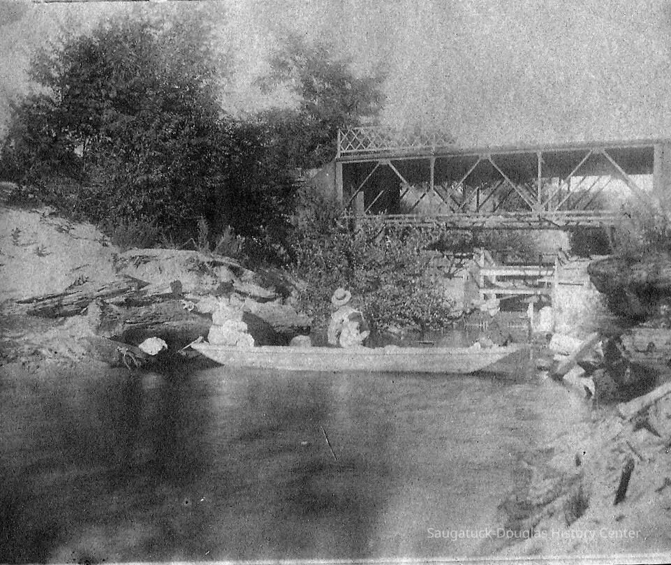 A photograph of the Pier Cove bridge and pond with three people in a boat in the foreground. A woman to the left and a man and child to the right. Copy of photo in accession file.Photograph Details