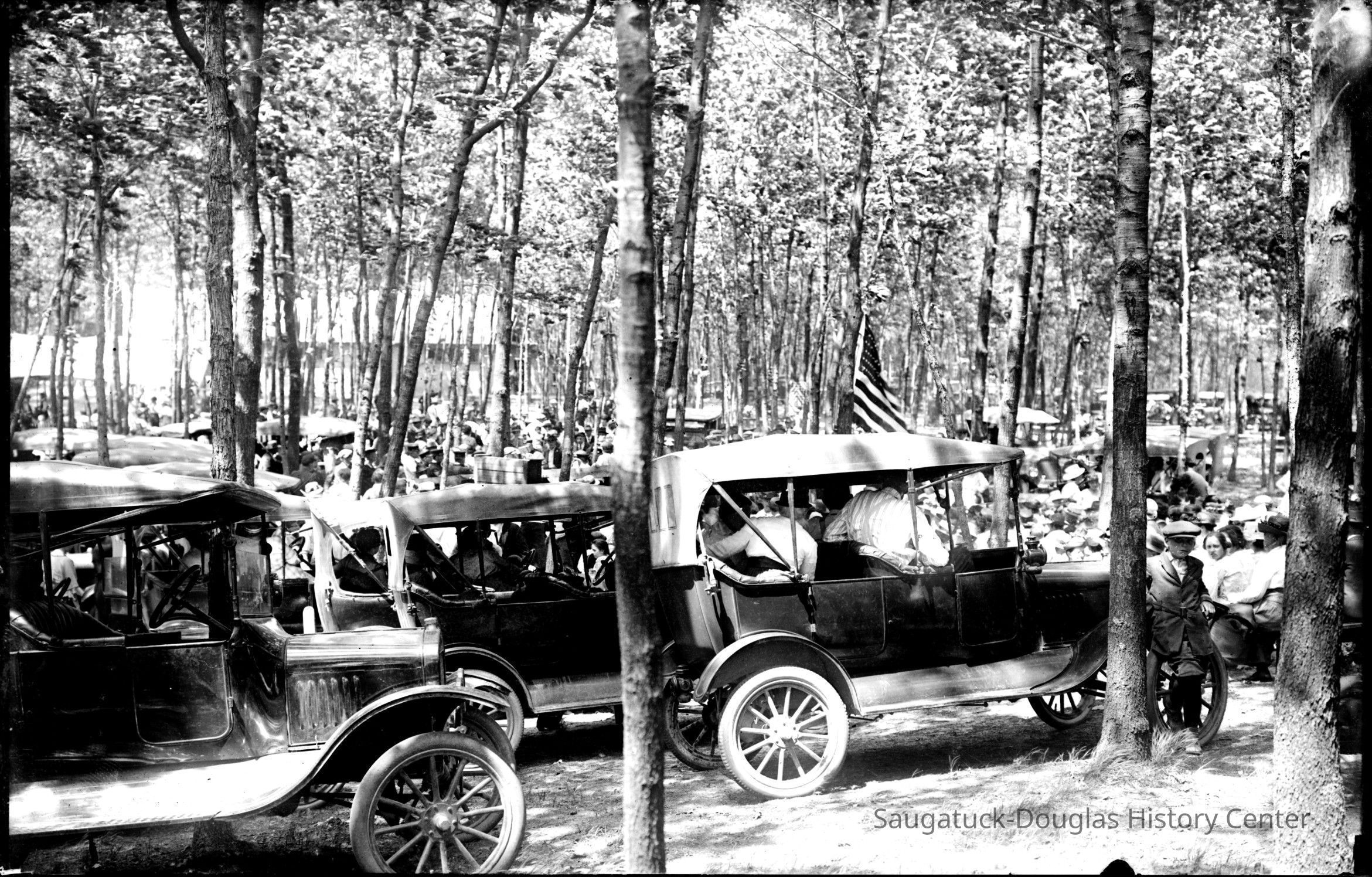 Model T type cars and crowds of people among the dappled shade of trees. A structure is visible in the background.