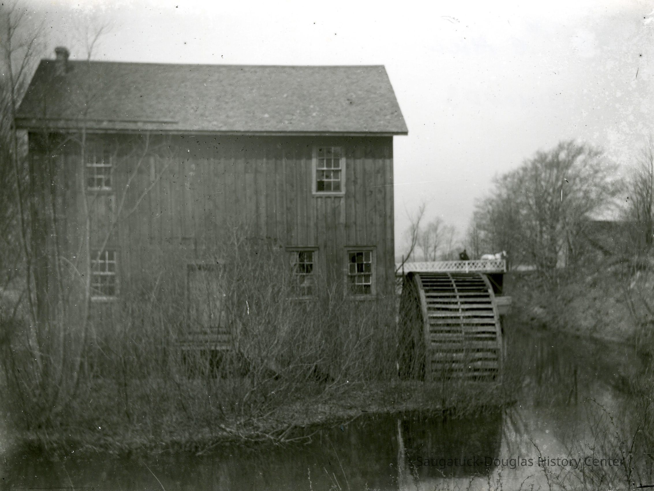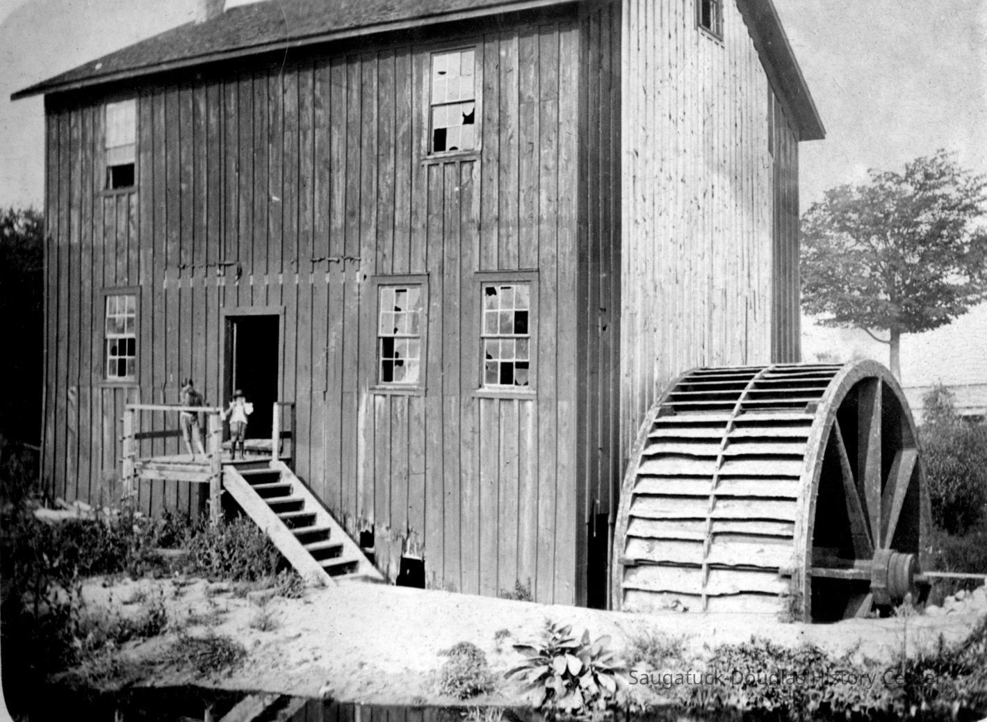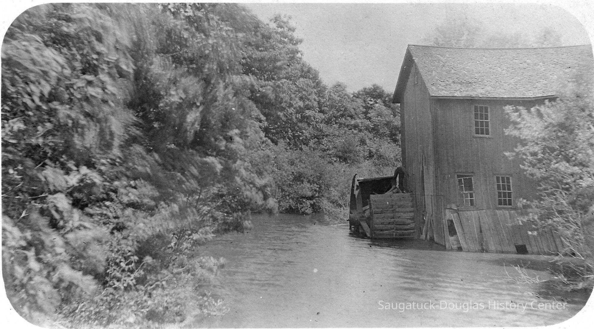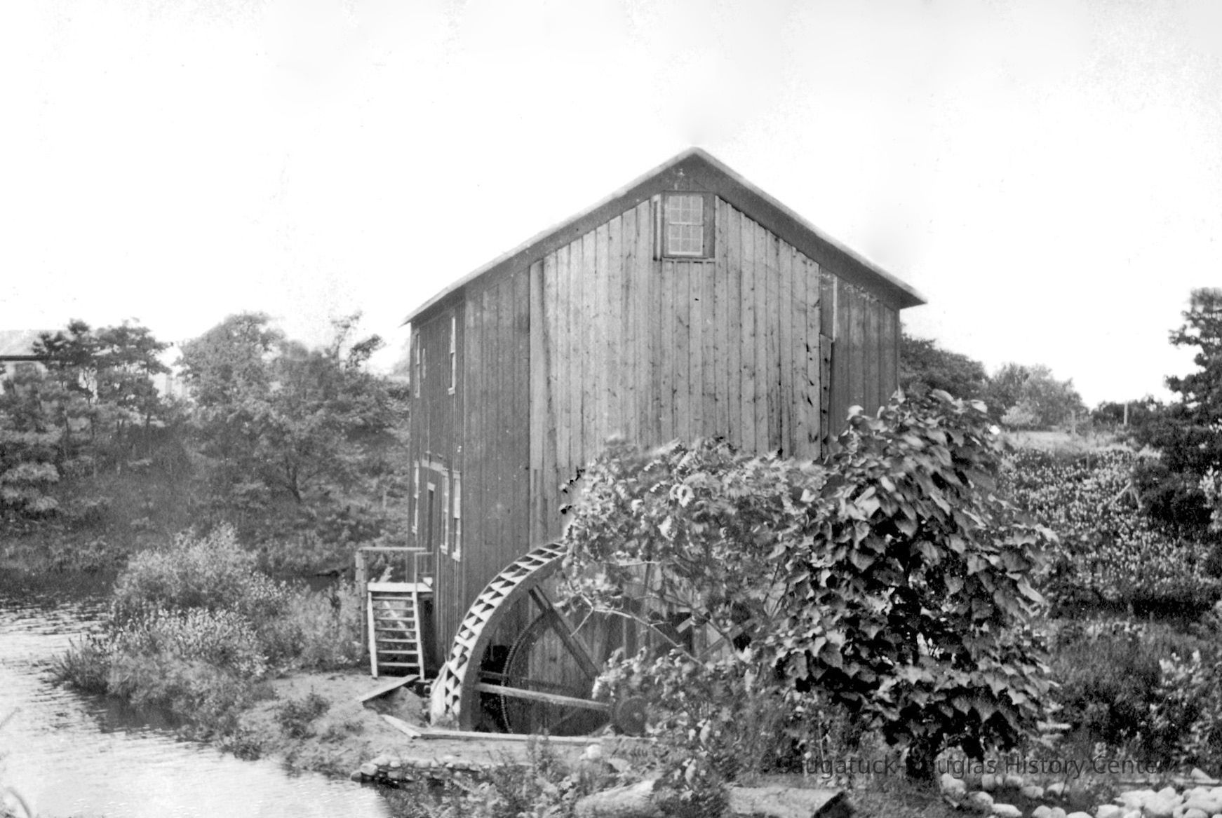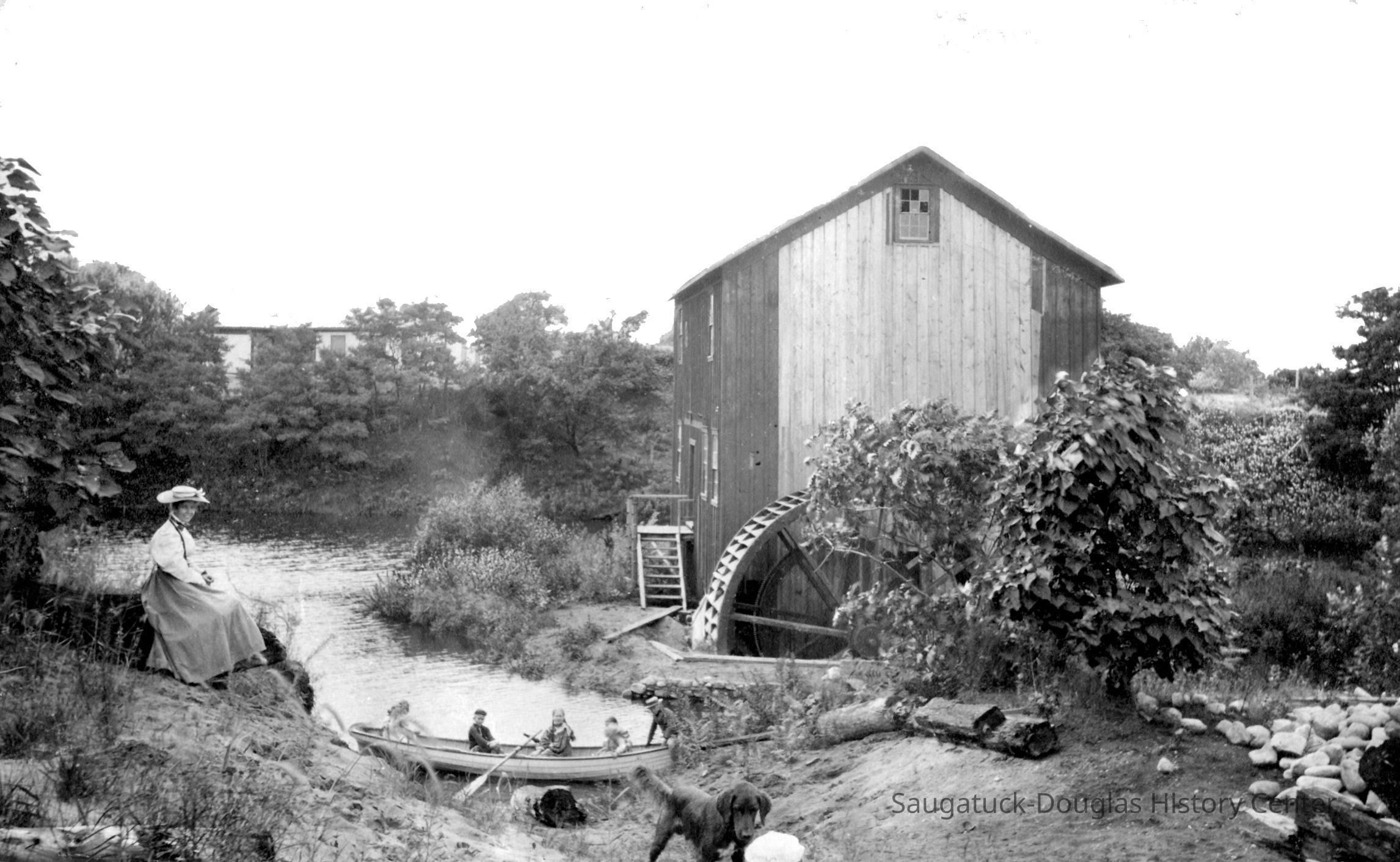 Various black-and-white photos of the mill and water wheel that once operated at Pier Cove as it went from pleasant play spot to picturesque ruin.Photograph Details