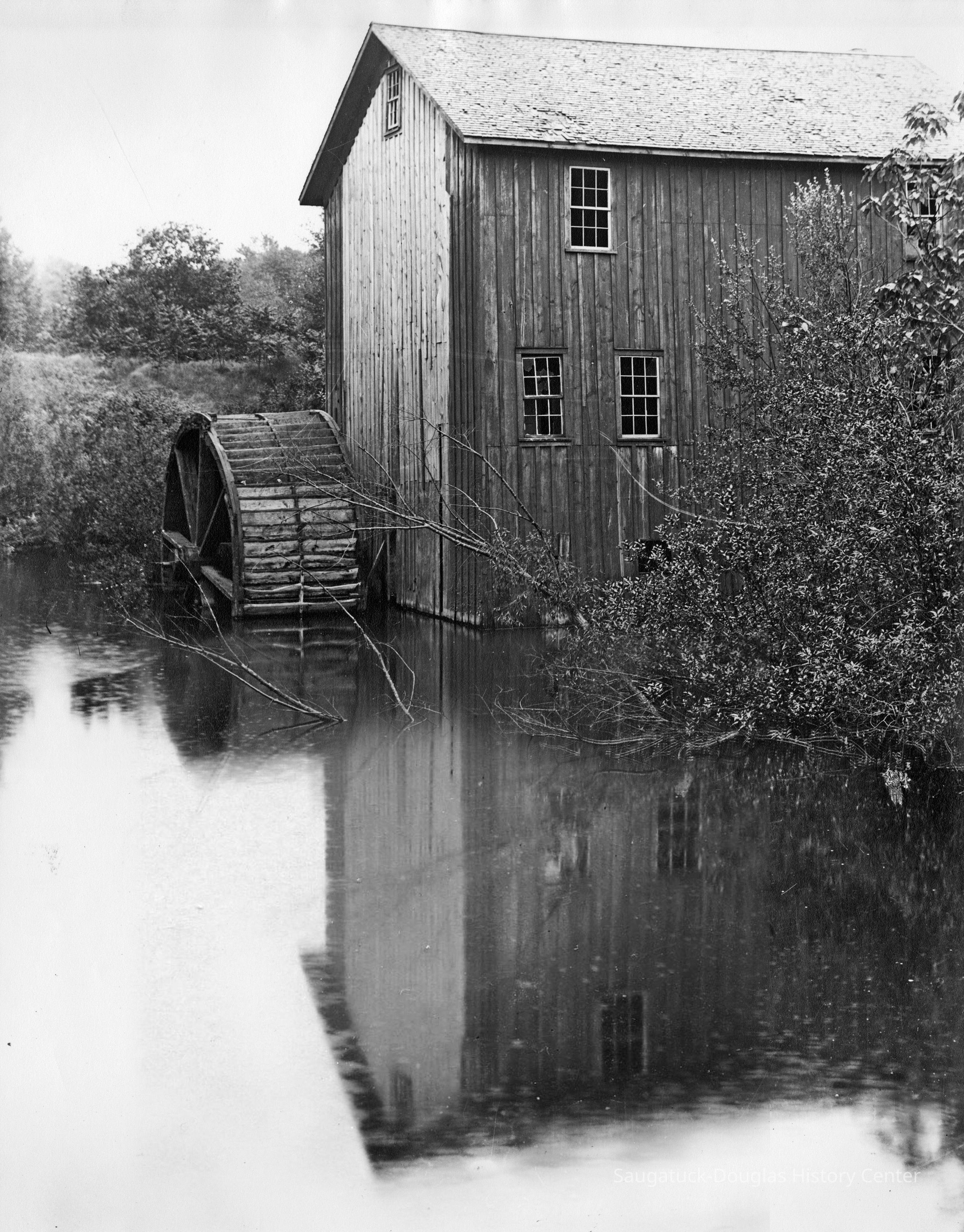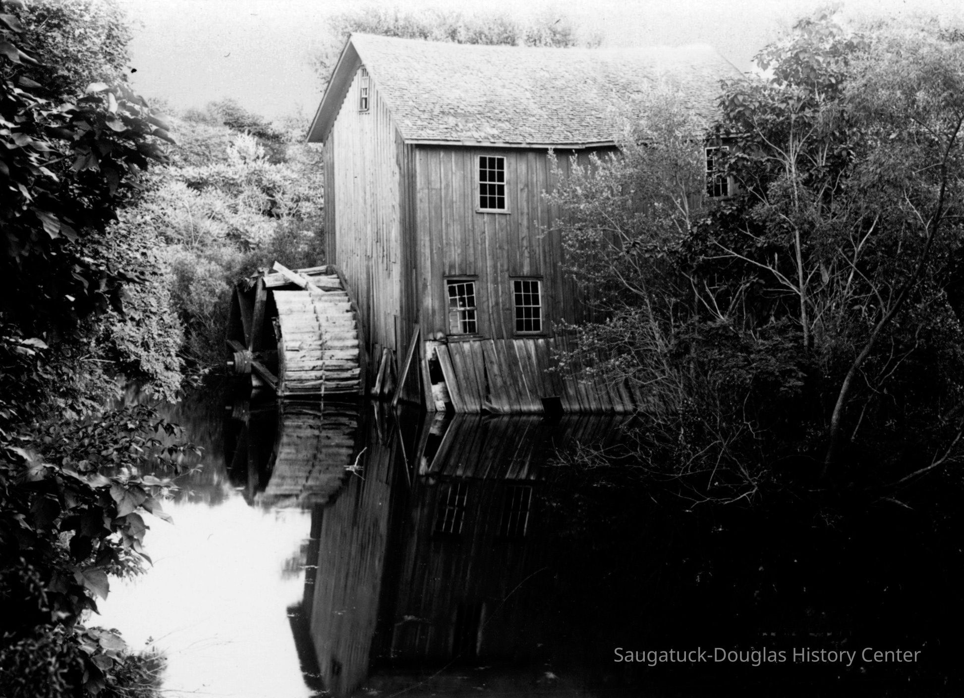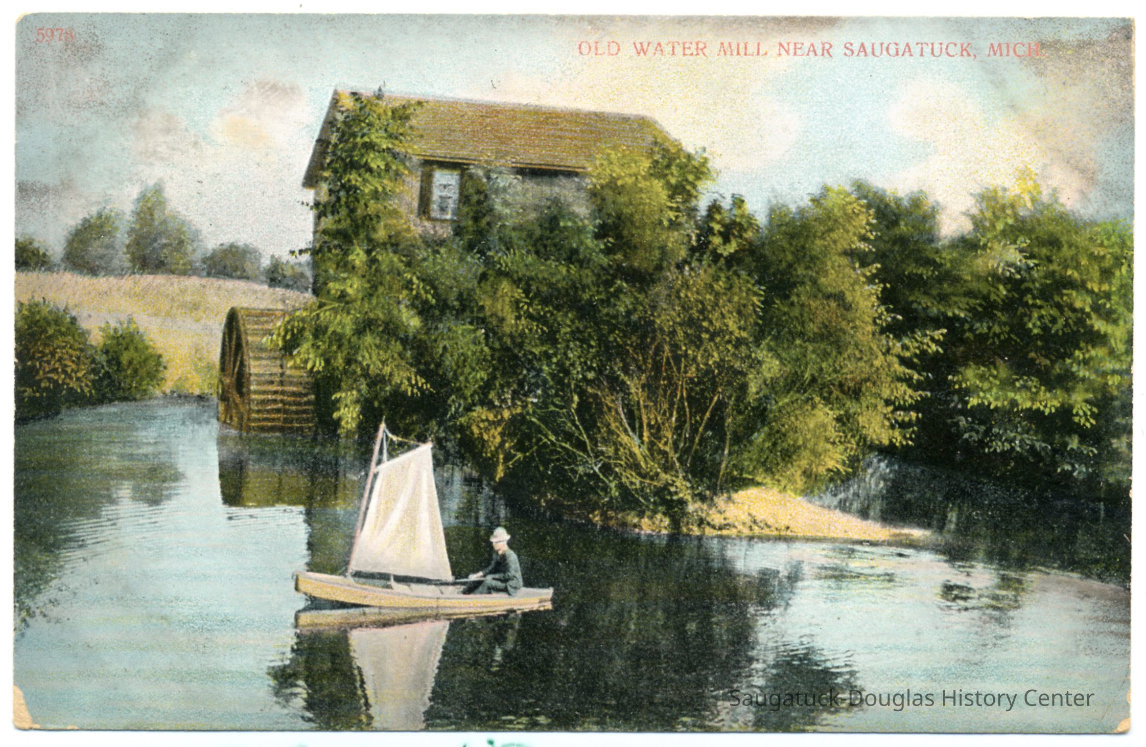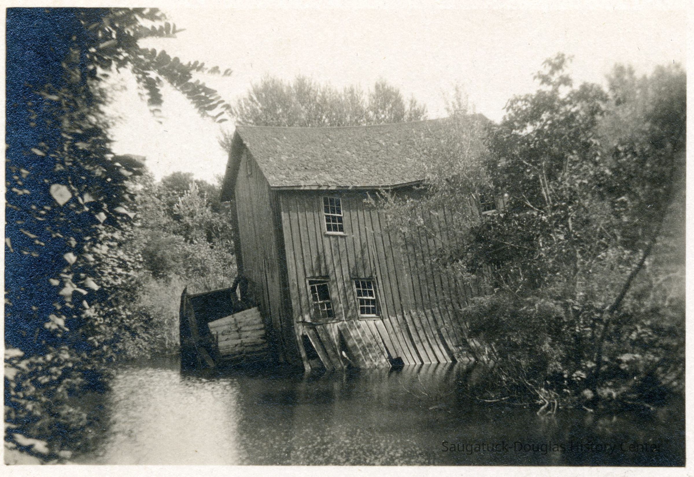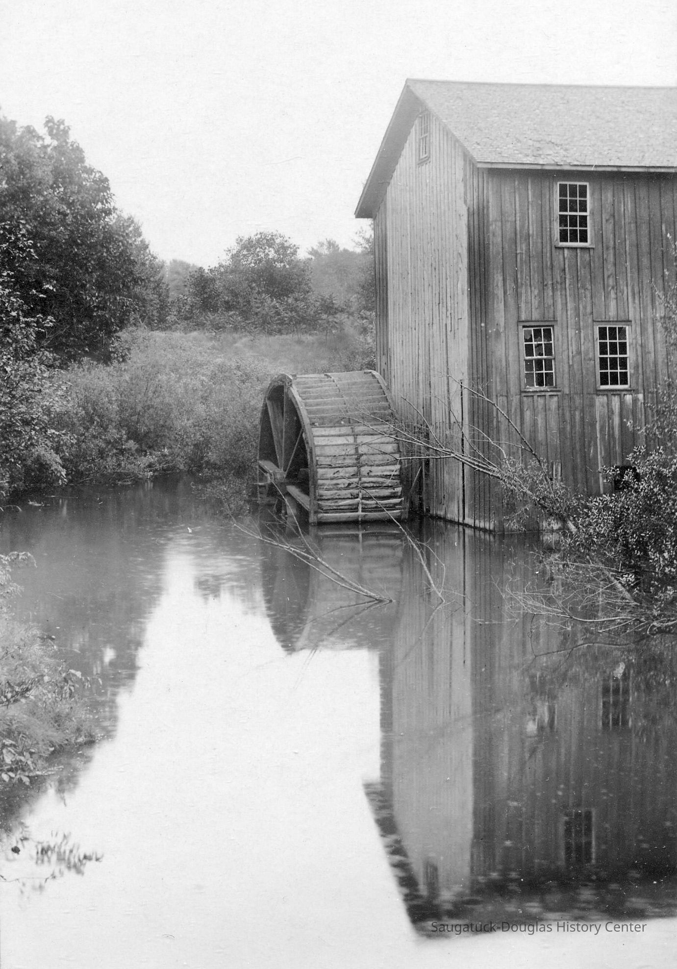 Various black-and-white photos of the mill and water wheel that once operated at Pier Cove as it went from pleasant play spot to picturesque ruin.Photograph Details