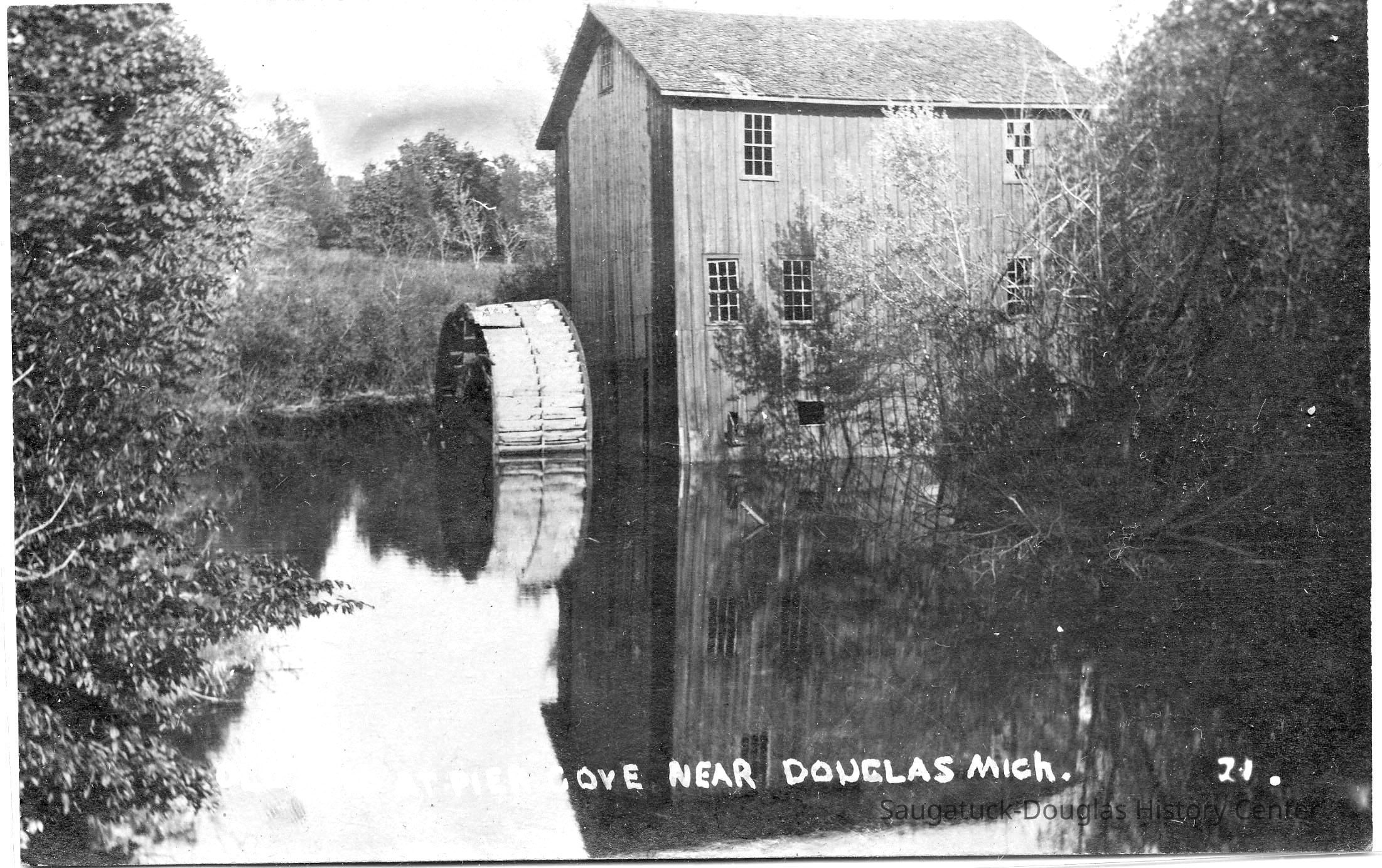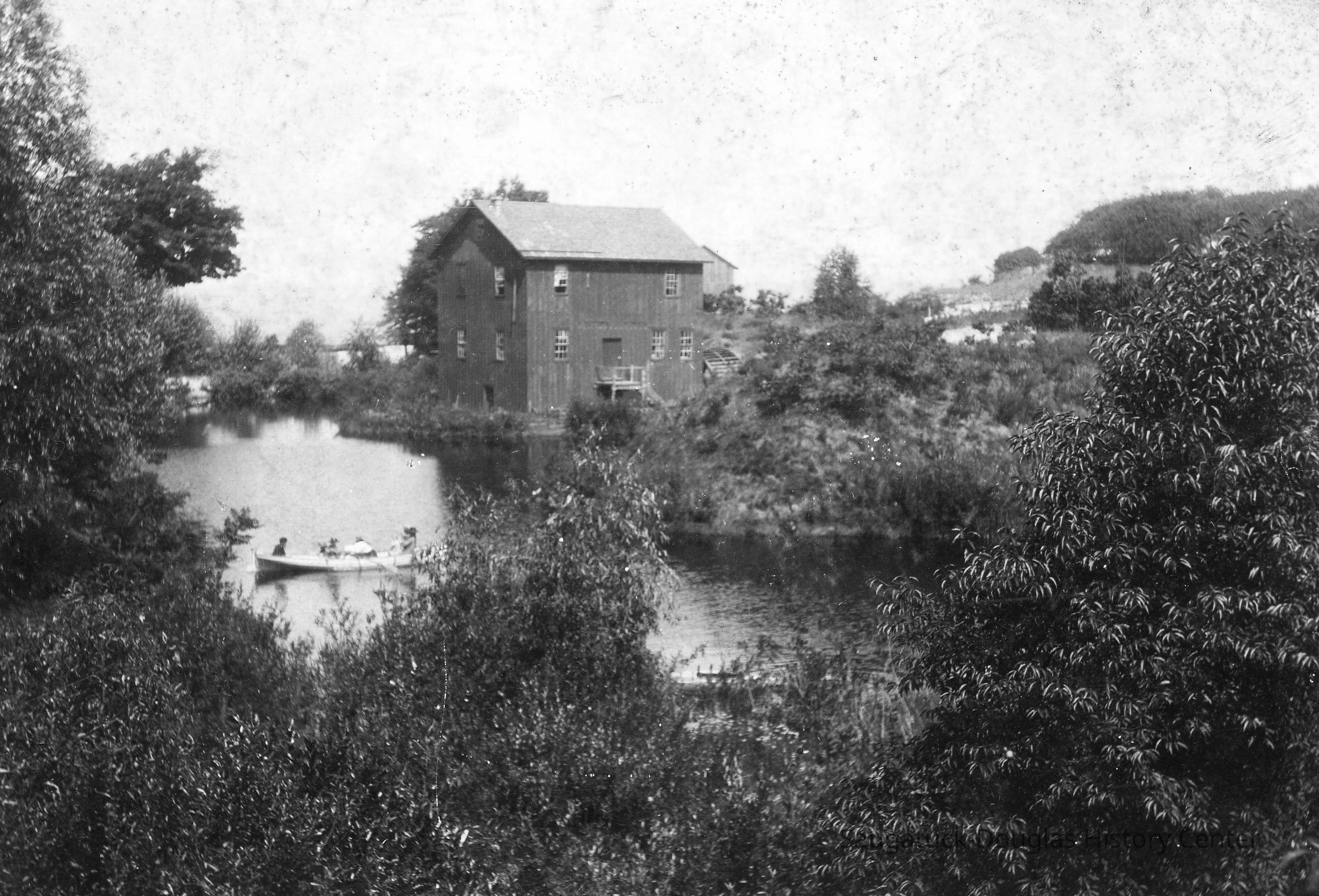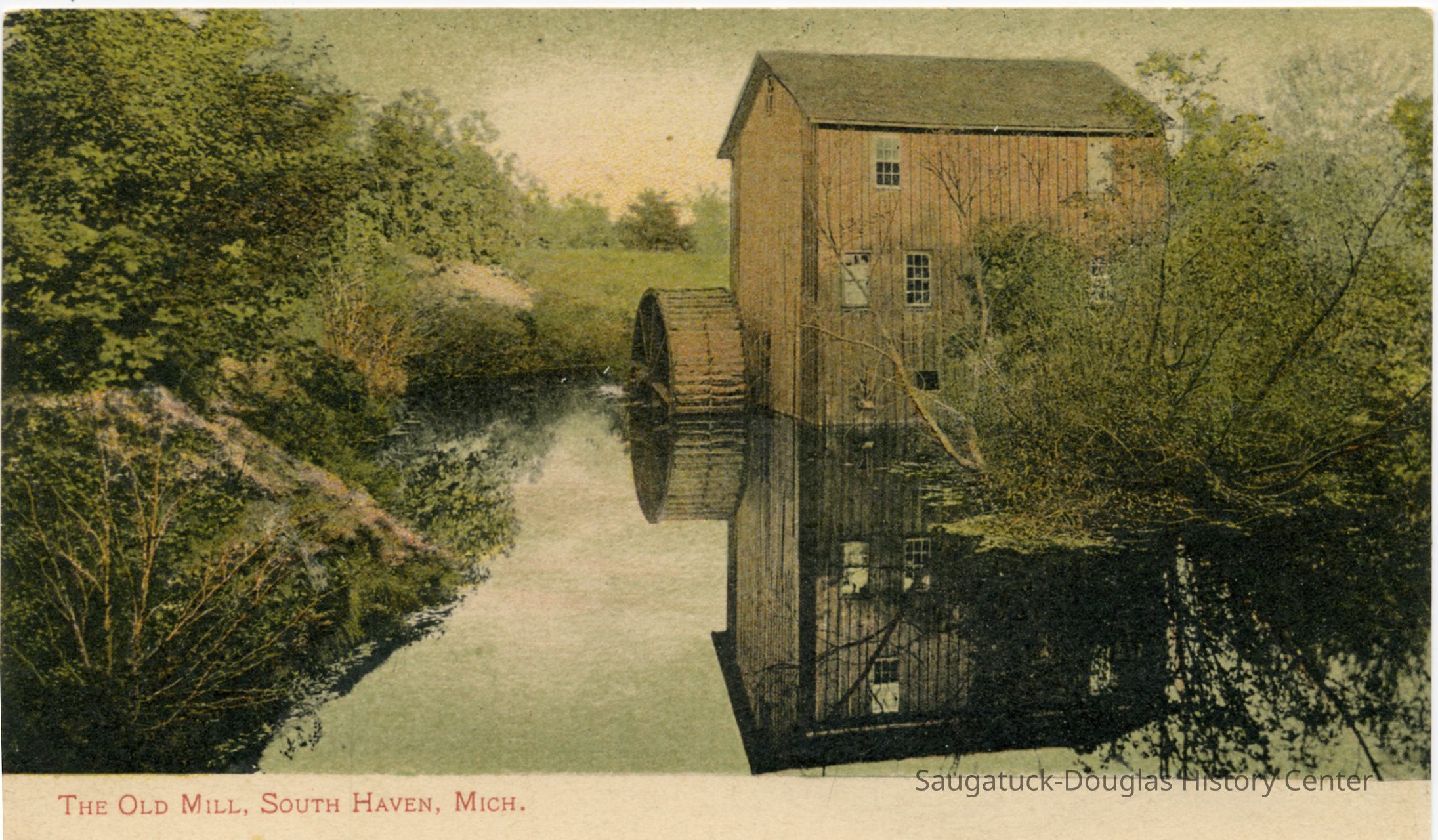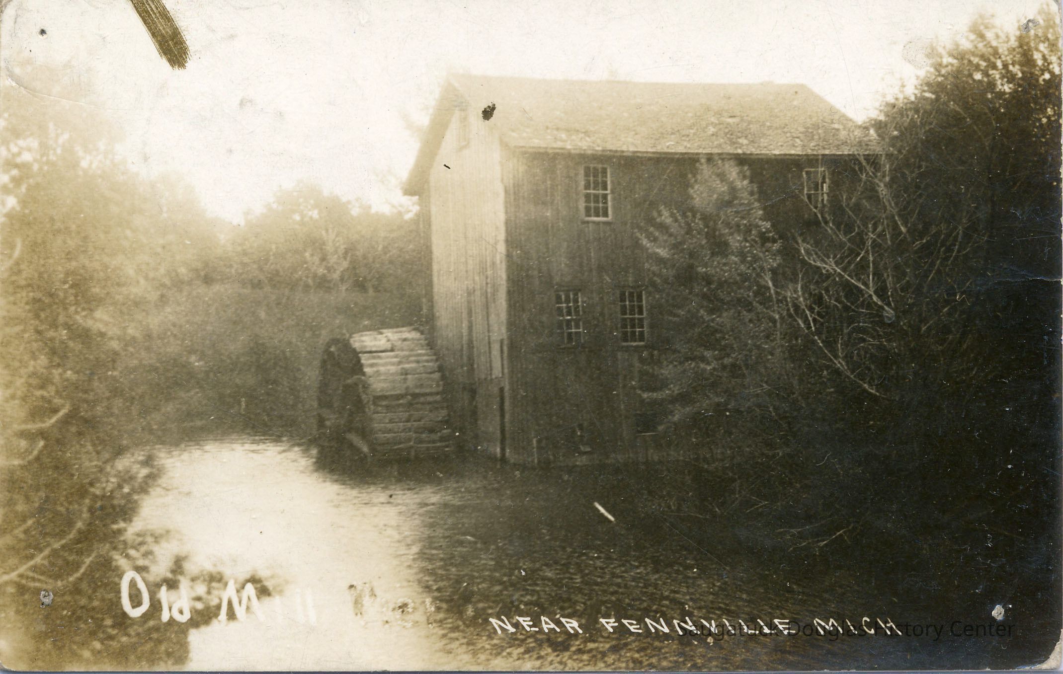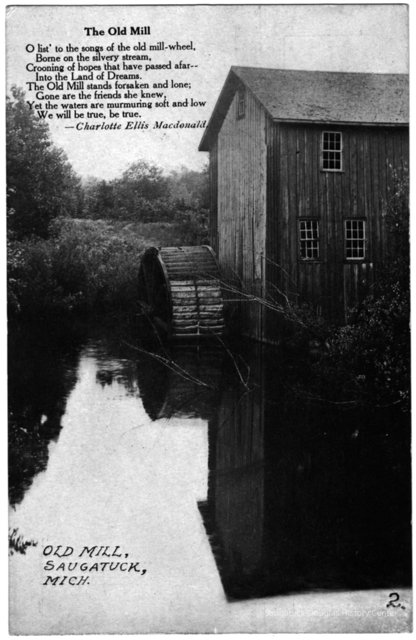 Various black-and-white photos of the mill and water wheel that once operated at Pier Cove as it went from pleasant play spot to picturesque ruin.Photograph Details