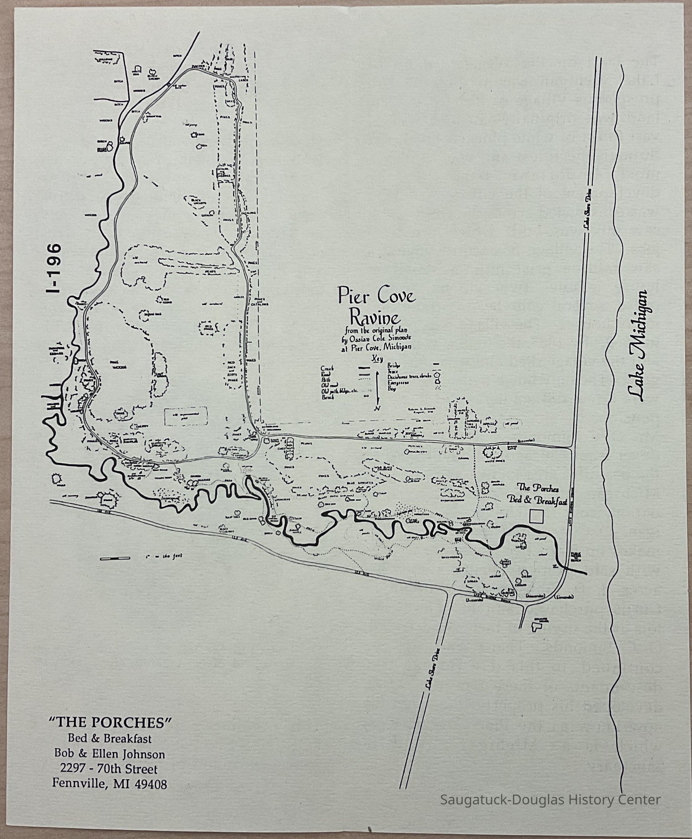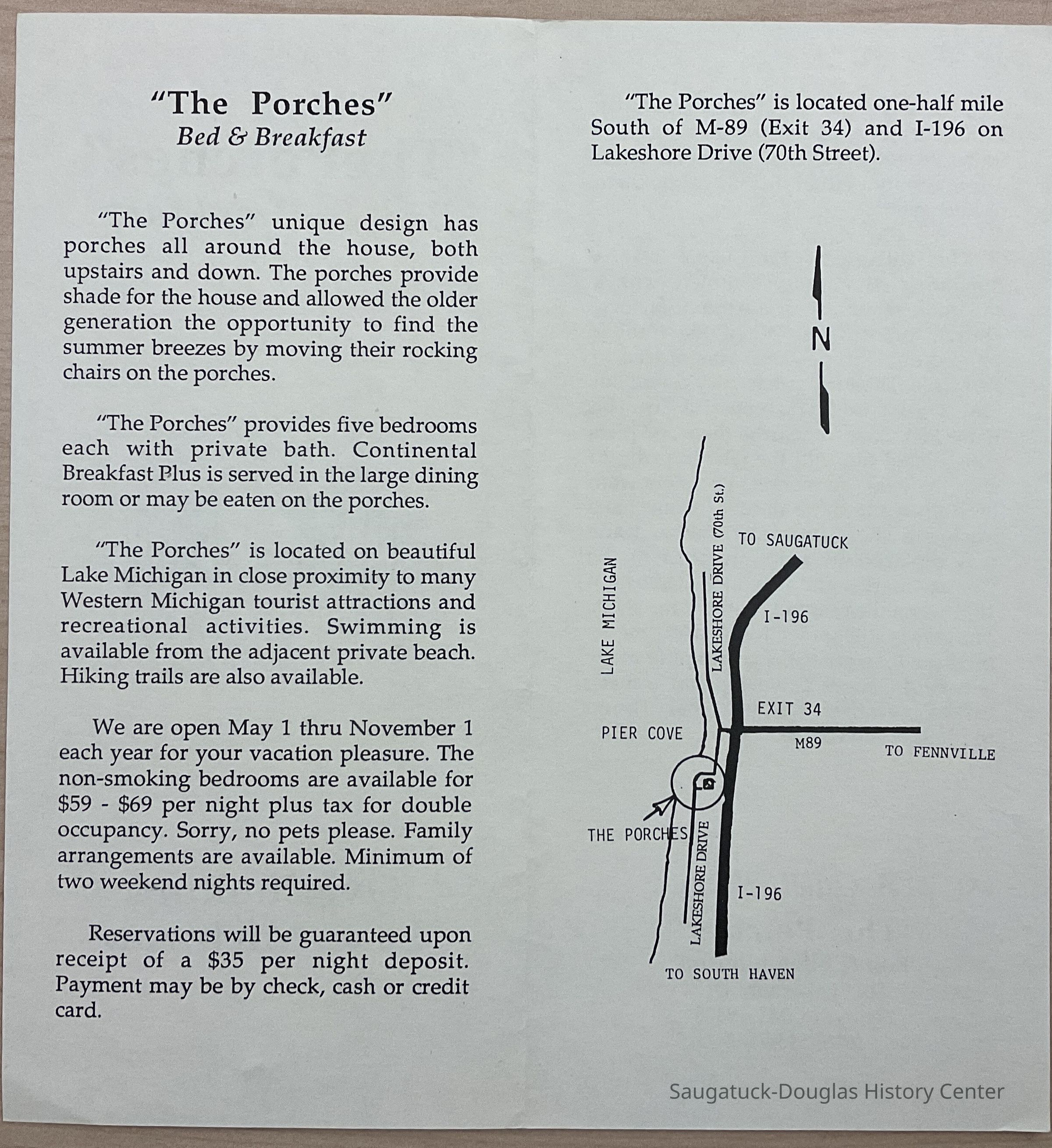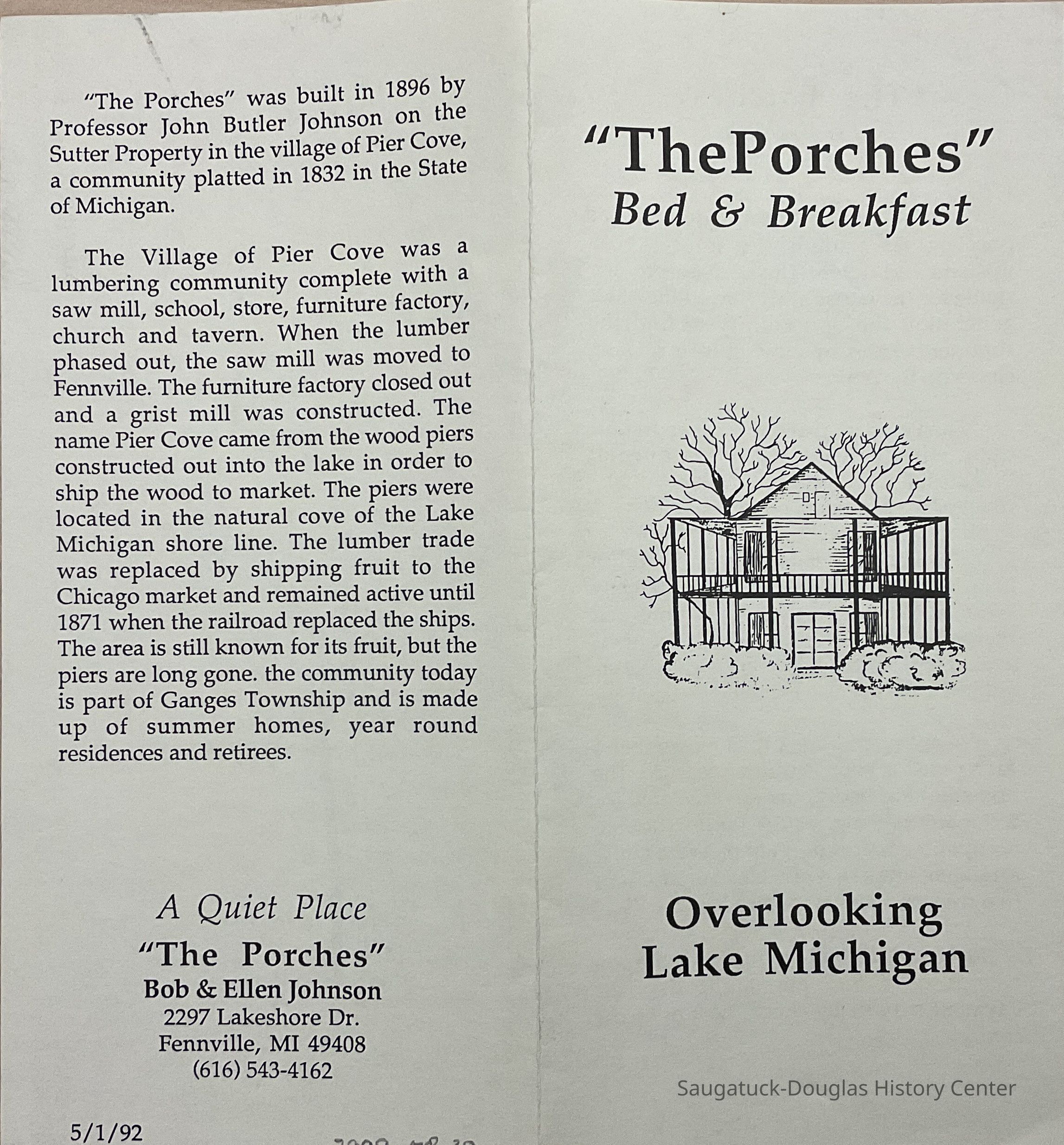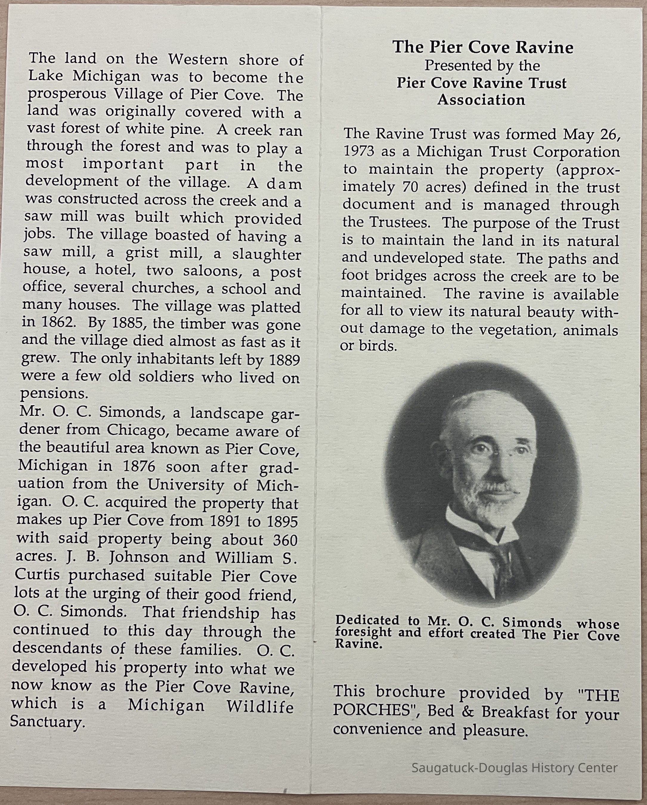 Bi-fold brochure with insert giving information about the Porches Bed and Breakfast. The insert gives information about The Pier Cove Ravine, dedicated to Mr. O. C. Simonds.Collection