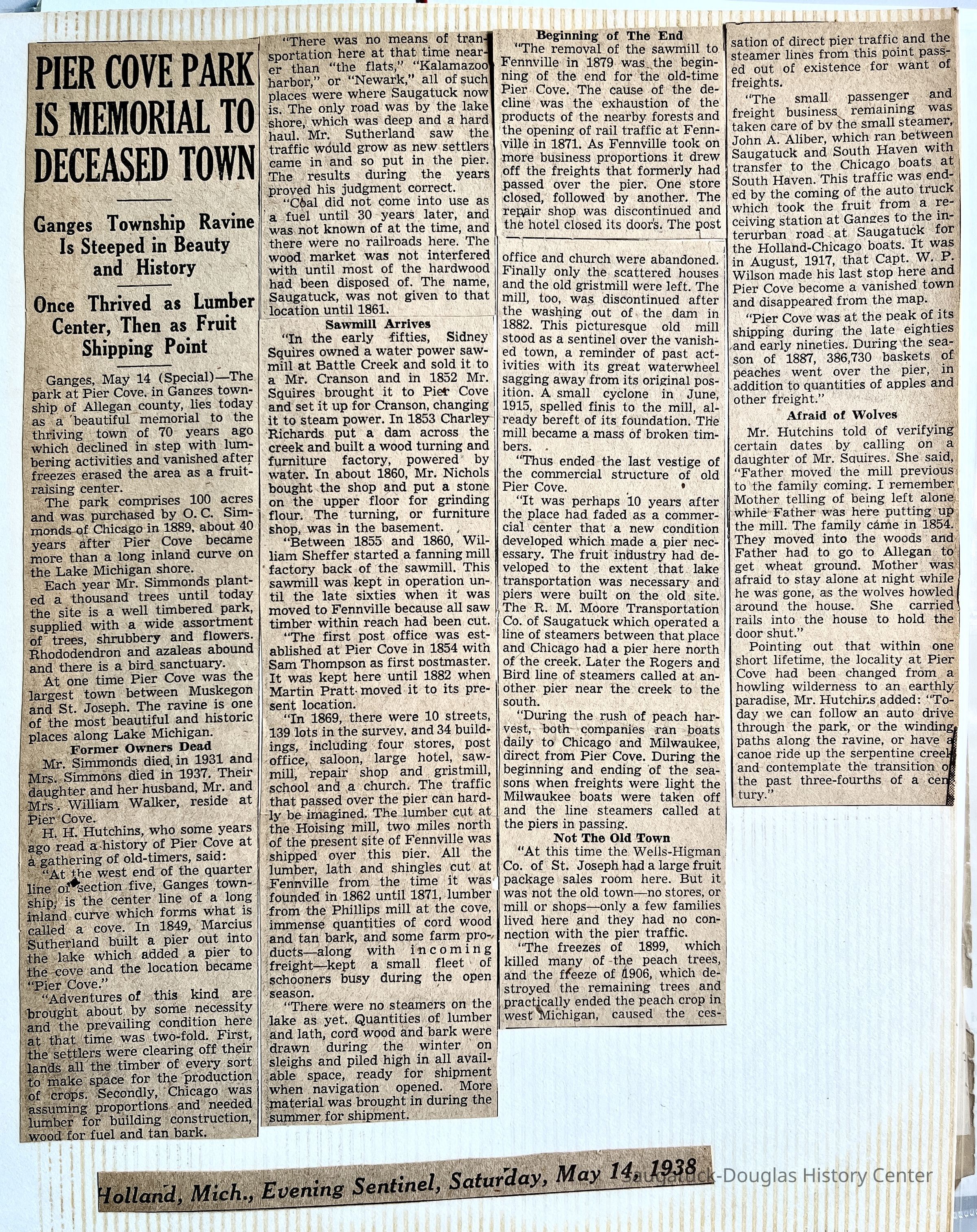 Clipping from the Holland, Michigan Evening Sentinel, Saturday, May 14, 1938 about the history of Pier Cove including its founding, the mill, post office, the thriving town, and the causes for its demise.Collection