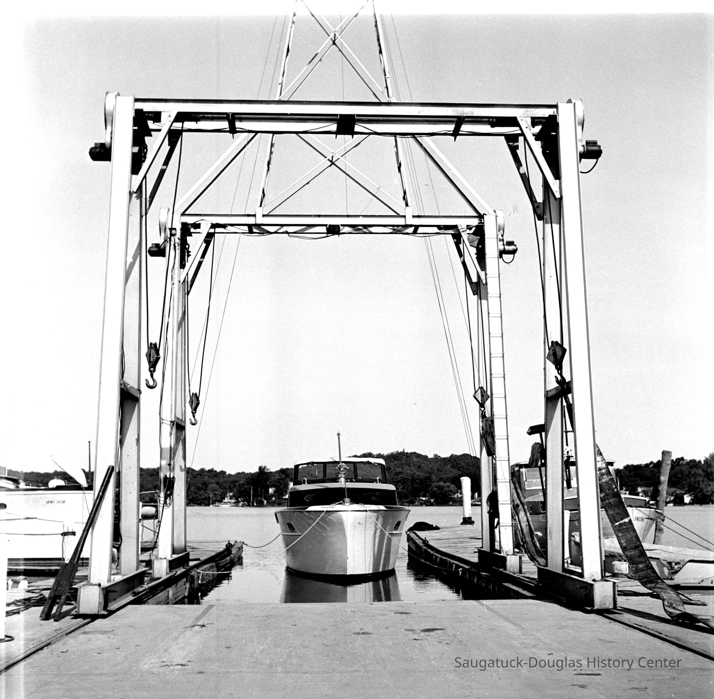 Yachts and sailboats docked and the boat sling at Pier Marina. As per "Off the Record" — Pier Marina was Saugatuck's first modern marina built by Frank Denison on the old bridge land near the Blue Star Highway formerly owned by the village.