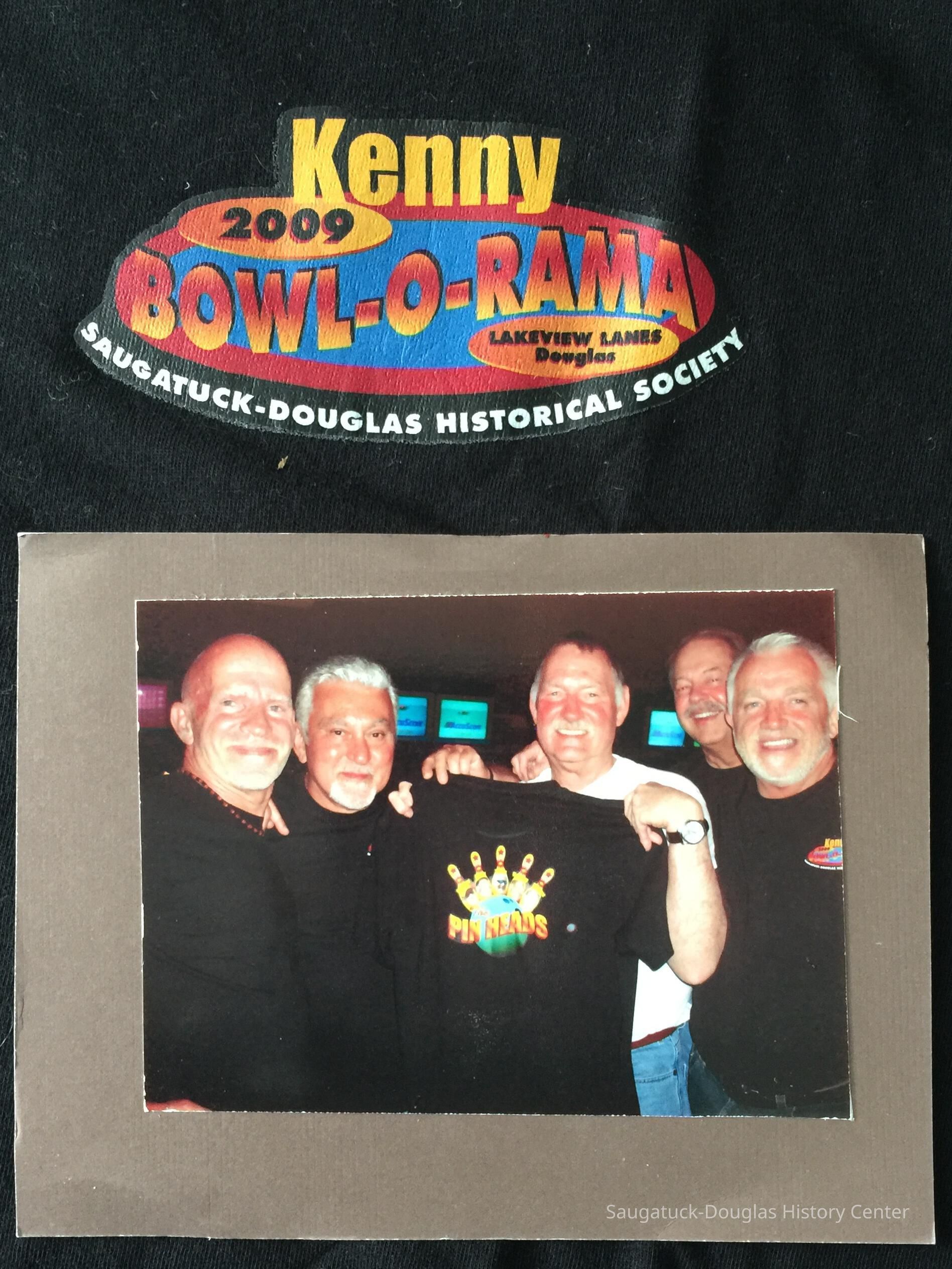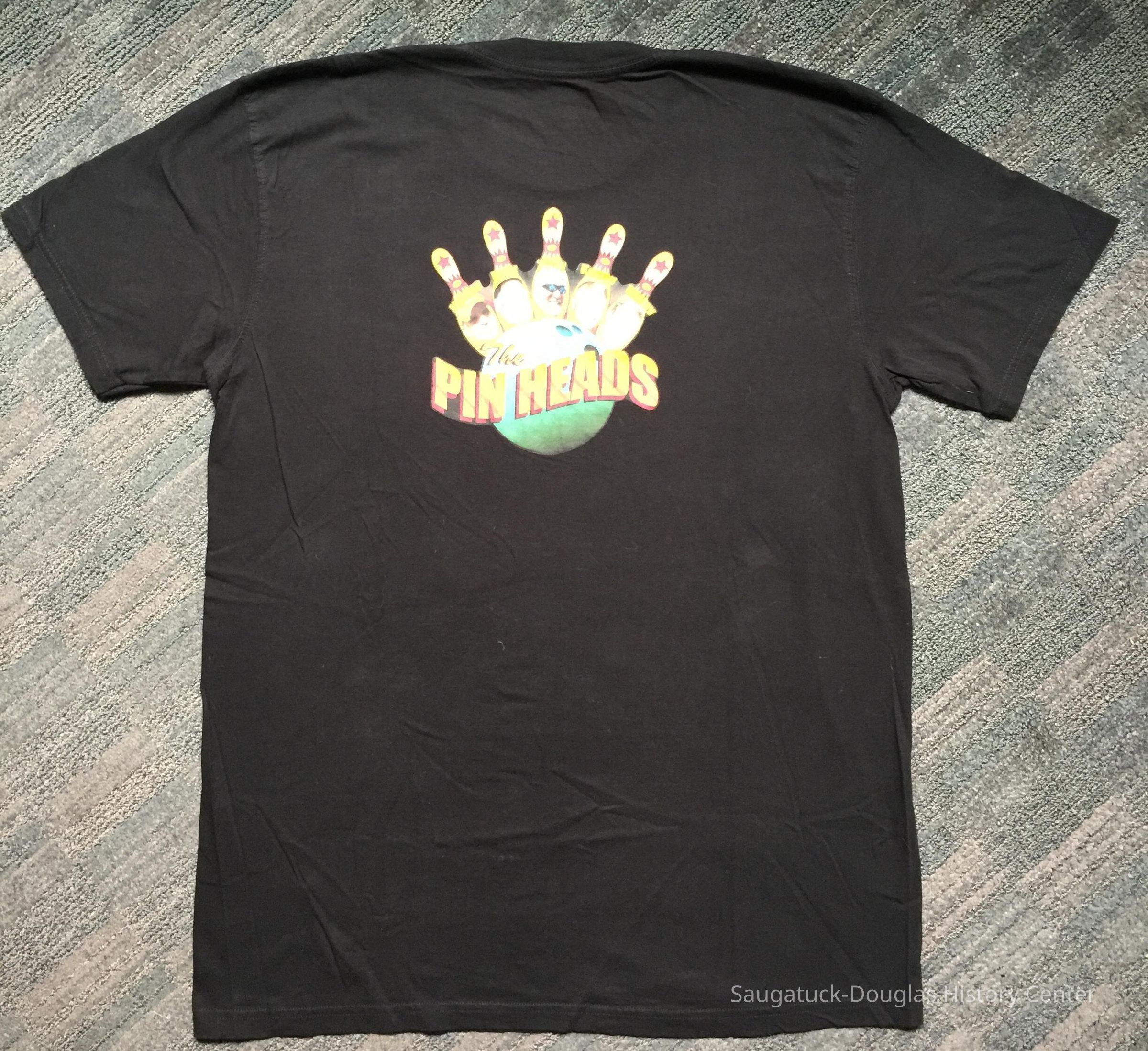 Black t-shirt worn by the Pin Heads team for the SDHC Bowl-a-Rama fundraiser. A note card from event organizer Judi Vanderbeck says "6/8/09 Ken & Jim, Thanks so much for your tremendous support of our Bowl-a-Rama event. Your team (and you specifically, Ken) earned the top dollars -- Now THAT'S bowling for dollars!!"