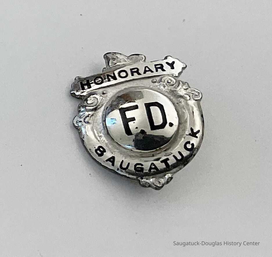 Honorary Saugatuck Fire Department lapel pin. Silver tone pin in the shape of a miniature round badge with "F.D." in the center, "Honorary" in a bar across the top, and "Saugatuck" on the bottom curve. The pin has a stylized fire helmet at the top and rococo brackets under the bar and at the bottom.Collection