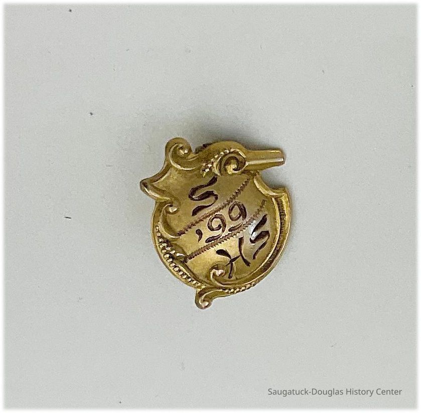 Saugatuck High School graduation lapel pin dated 1899. Gold-tone pin with rococo shape and "S '99 SH" engraving.Collection