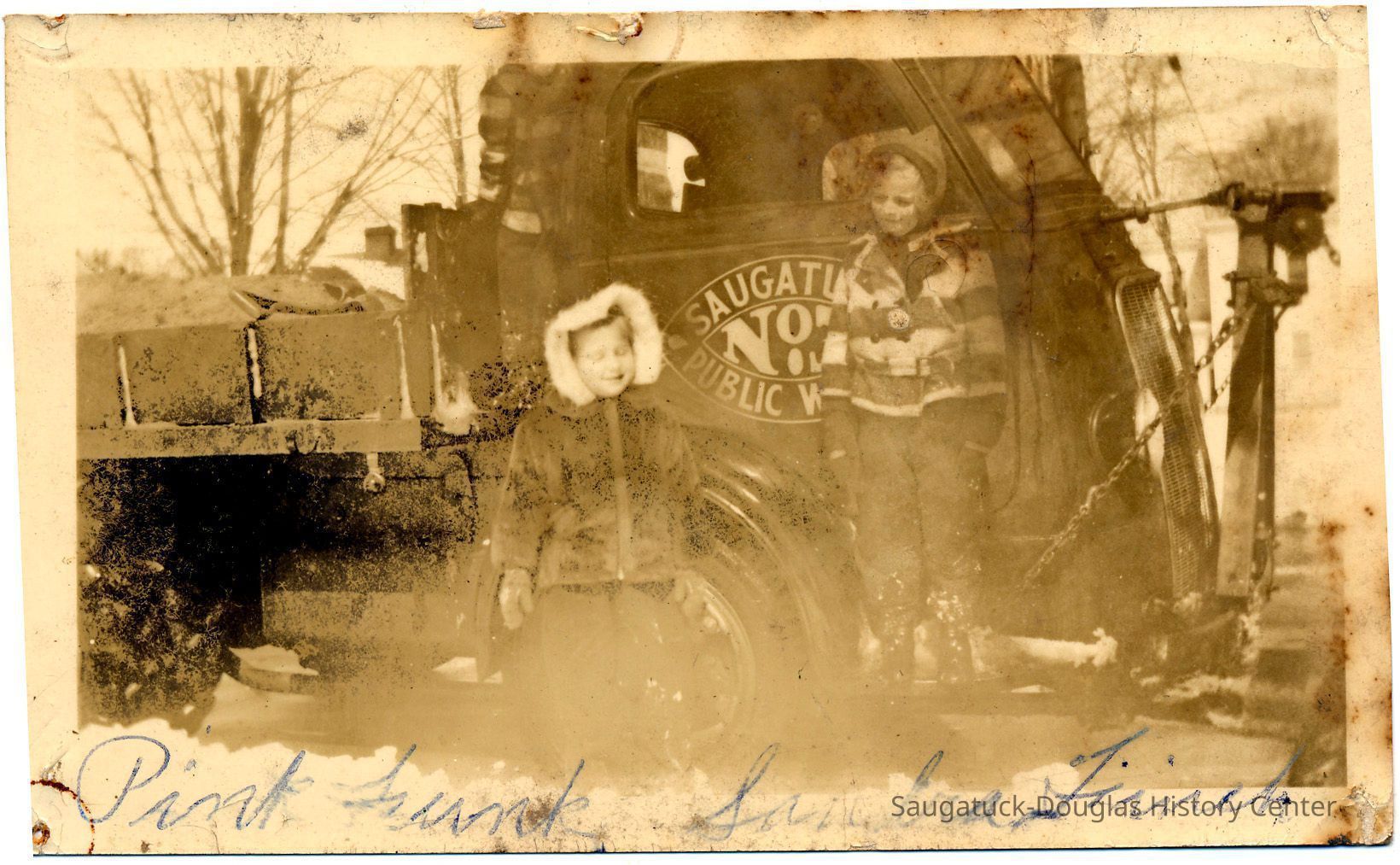 Two girls in winter clothing standing by a Saugatuck Public works truck that may be hauling a load of sand.Photograph Details