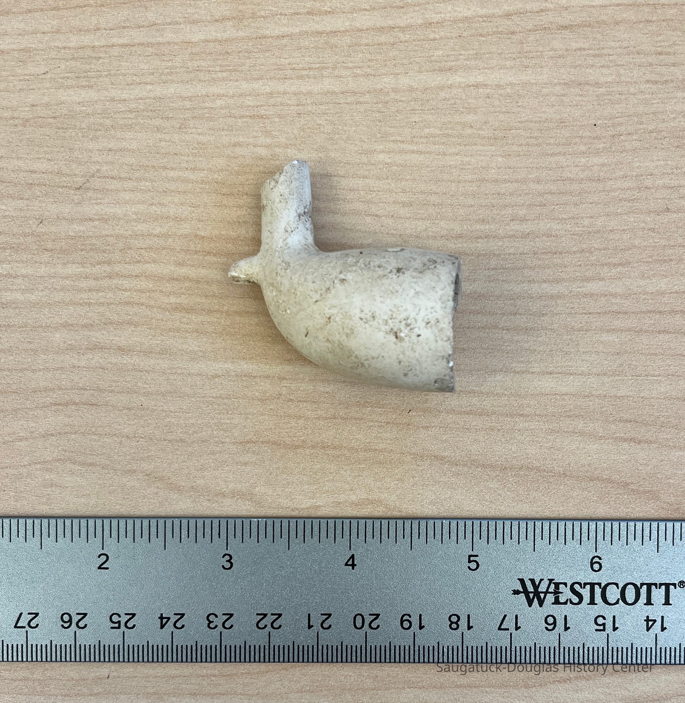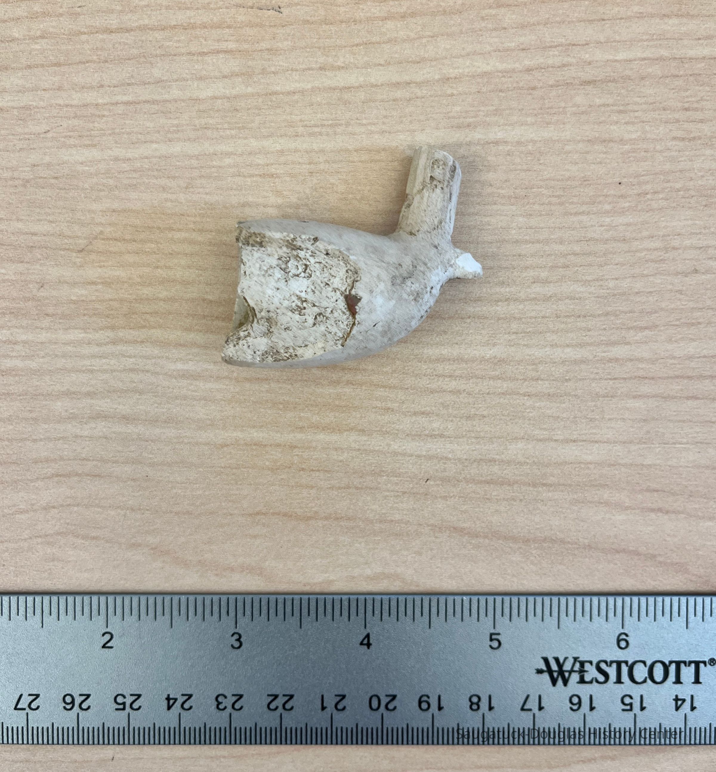 White clay bowl from a smoking pipe. The clay is smooth, white and without glaze. The bowl has a pointed foot but is missing a large chip from one side and the stem is missing.Context