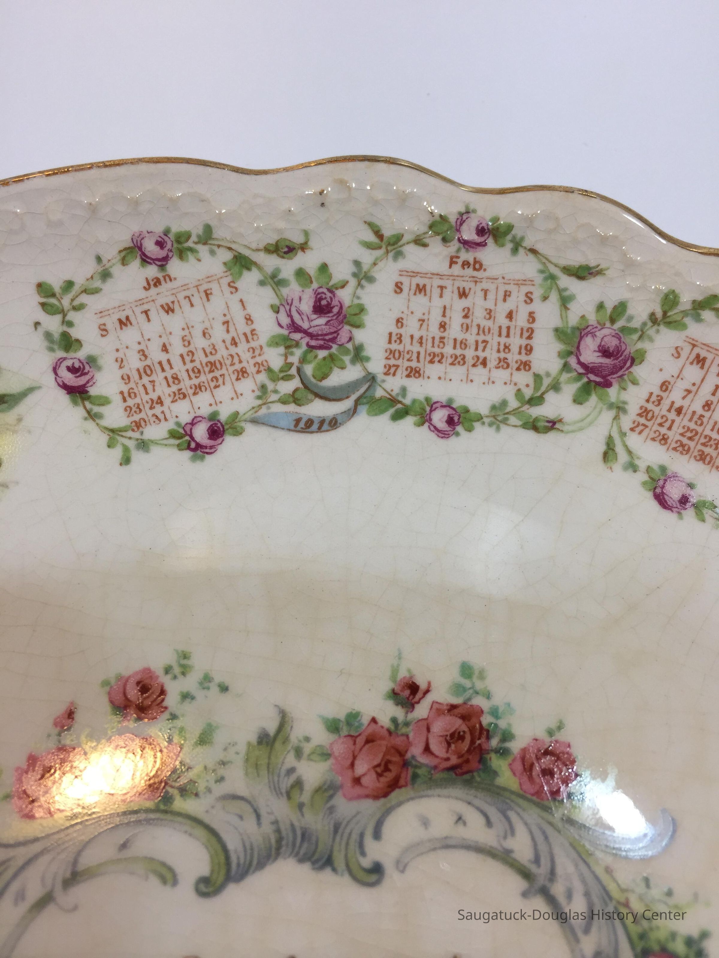 Soft paste ceramic plate with gold edge and embossed pattern. The edge of the plate is printed with for transfer images of snowdrops, and twelve rose wreaths. Each wreath encircles a monthly calendar from 1910. In the center of the plate a rose-strewn, rococo frame surrounds gold text that reads "Compliments of Geo. W. Goshorn, Saugatuck, Mich.