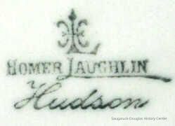 "Hudson, a copy of a French Haviland line, was first offered by Homer Laughlin in 1908. Although it was largely discontinued in the late 1920s and no longer listed in the 1929 HLC catalog, Hudson examples can be found with 1929 and 1930 backstamps. Hudson [pattern] had a production run of over 20 years, the first HLC line to do so. ...