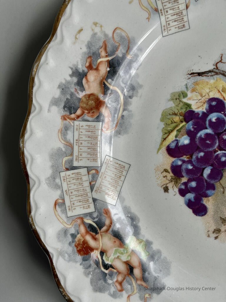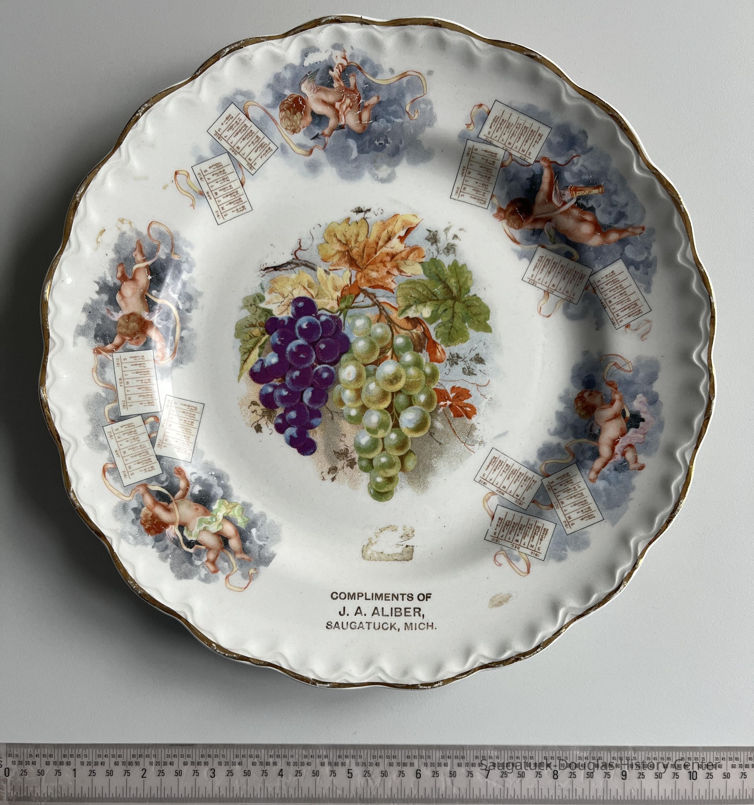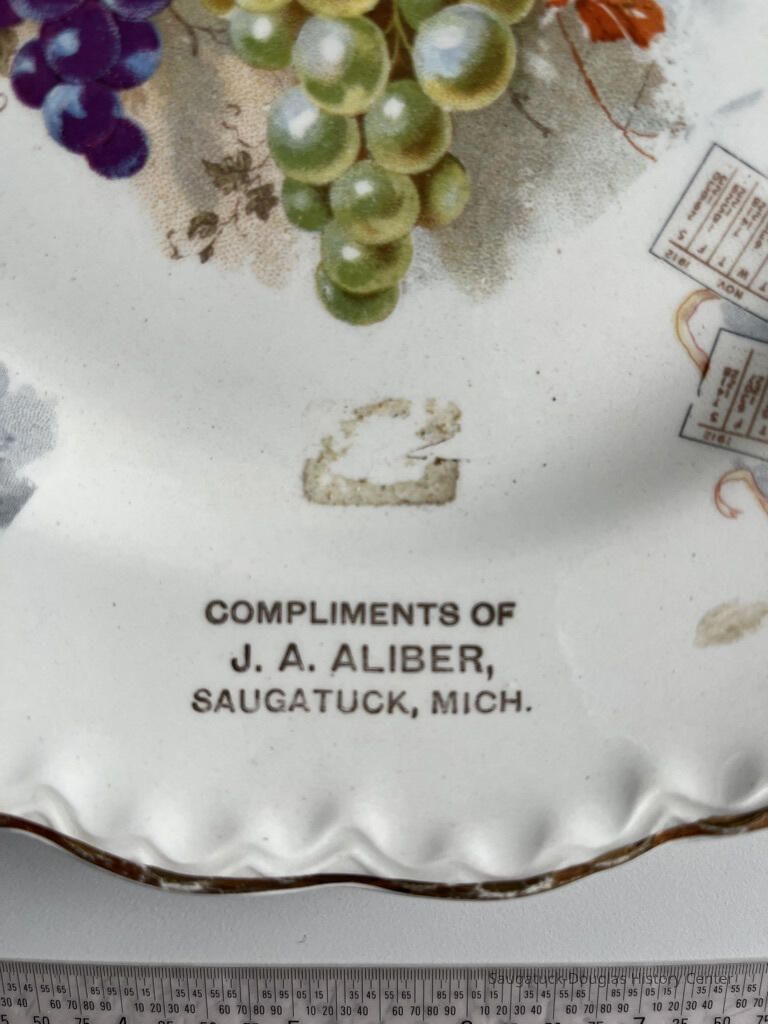 1912 calendar plate stamped "Compliments of J. A. Aliber, Saugatuck, Mich."
